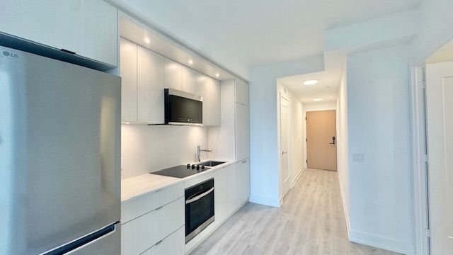 • Open concept kitchen with built-in stainless steel appliances and sleek cabinetry.