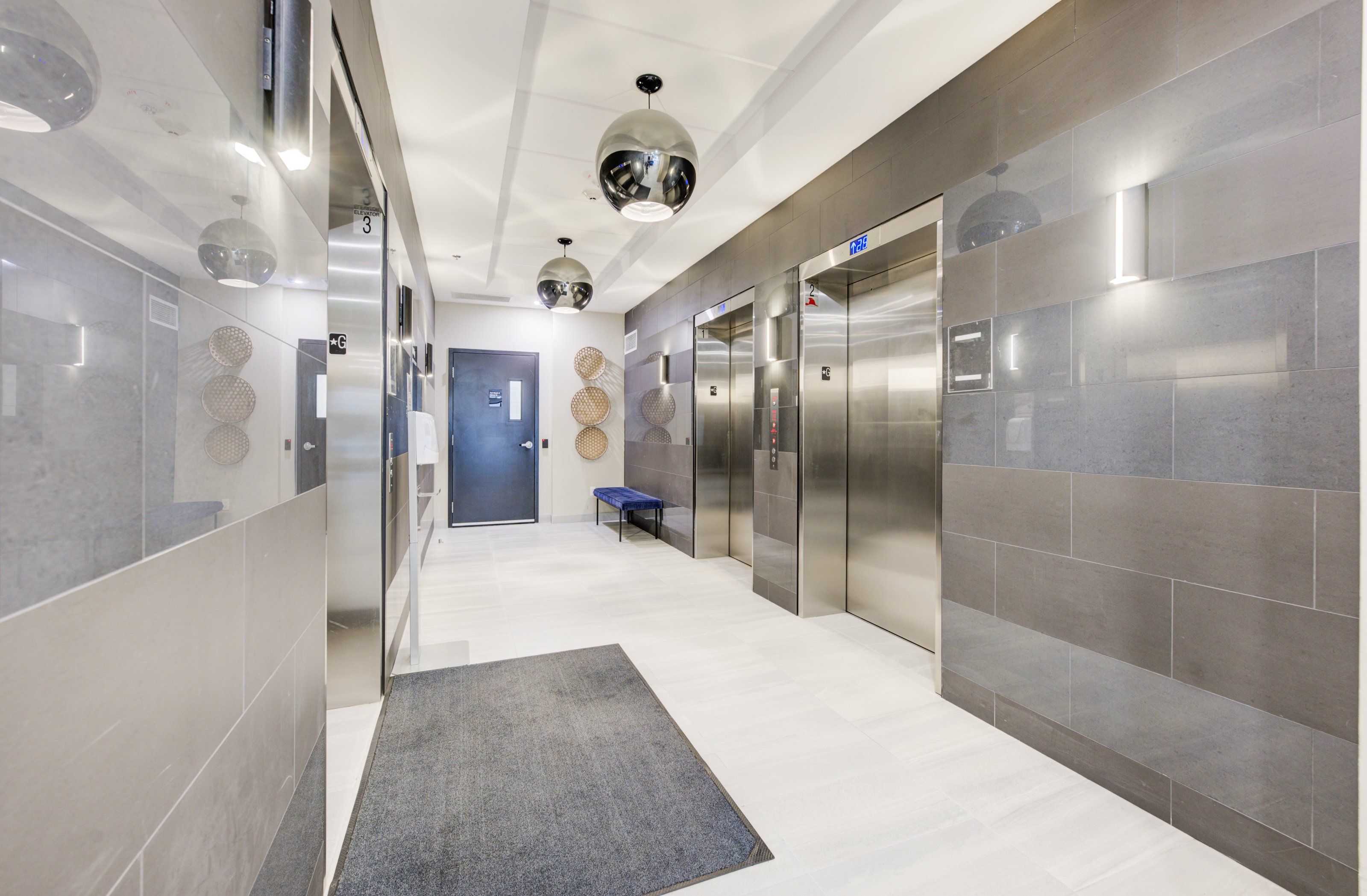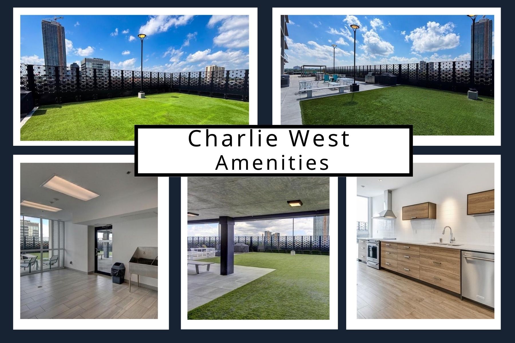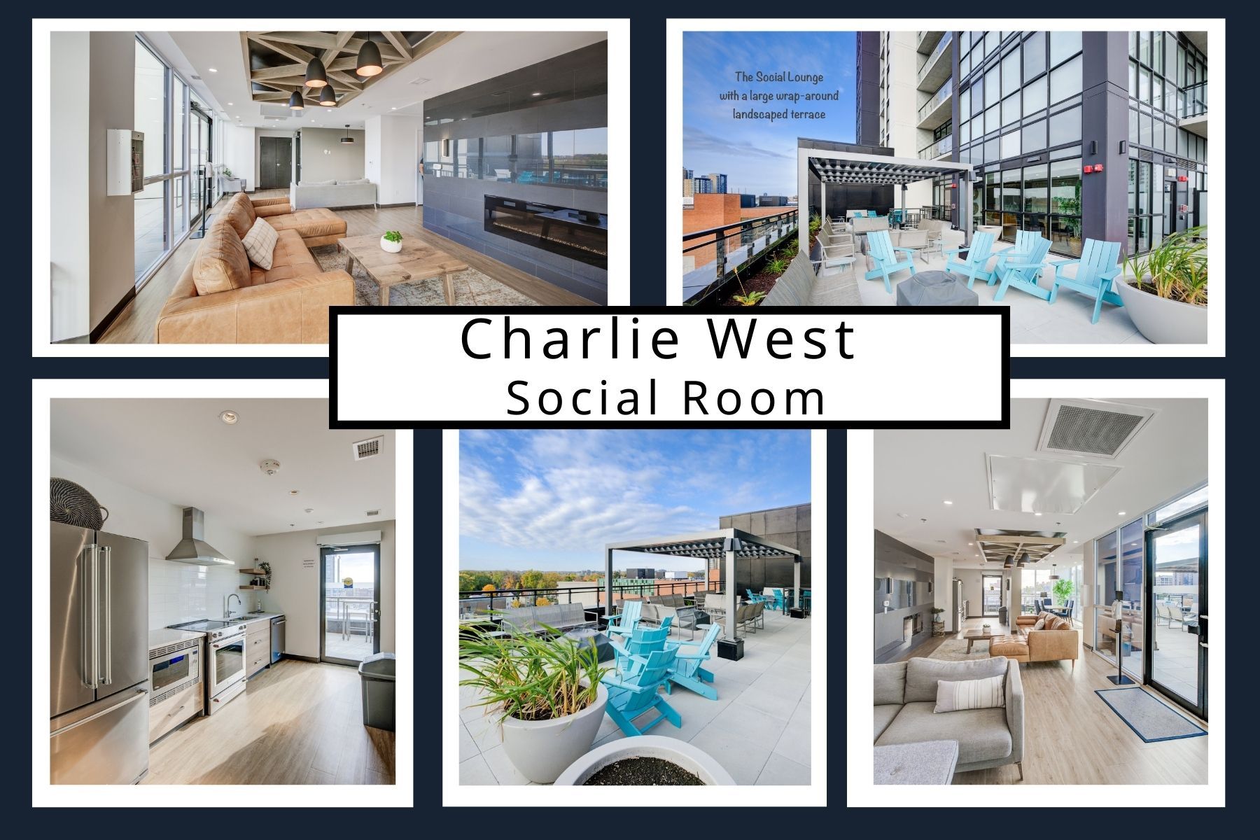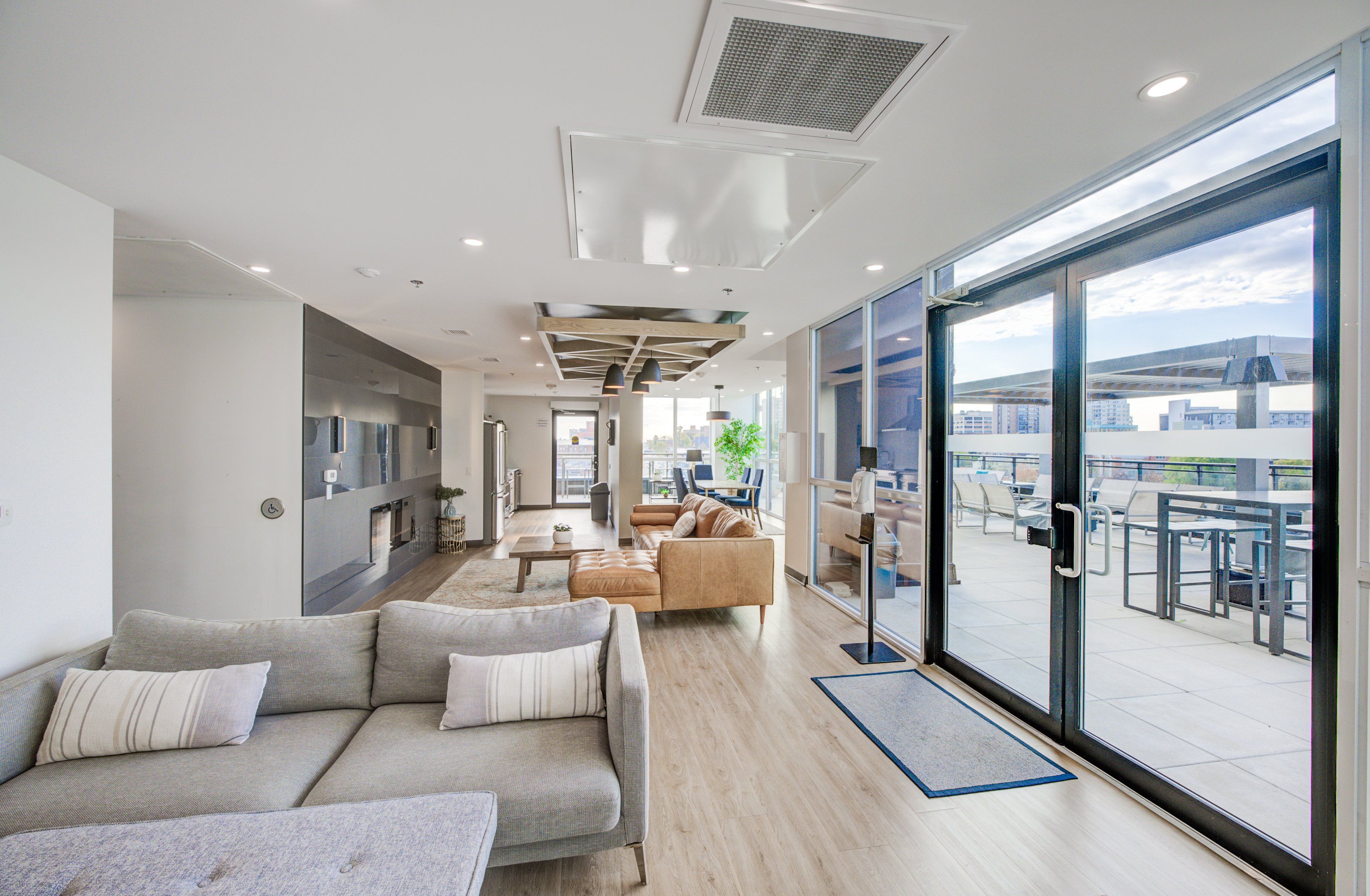 • Resort-style amenities include fitness center, lounges, and landscaped terrace.
