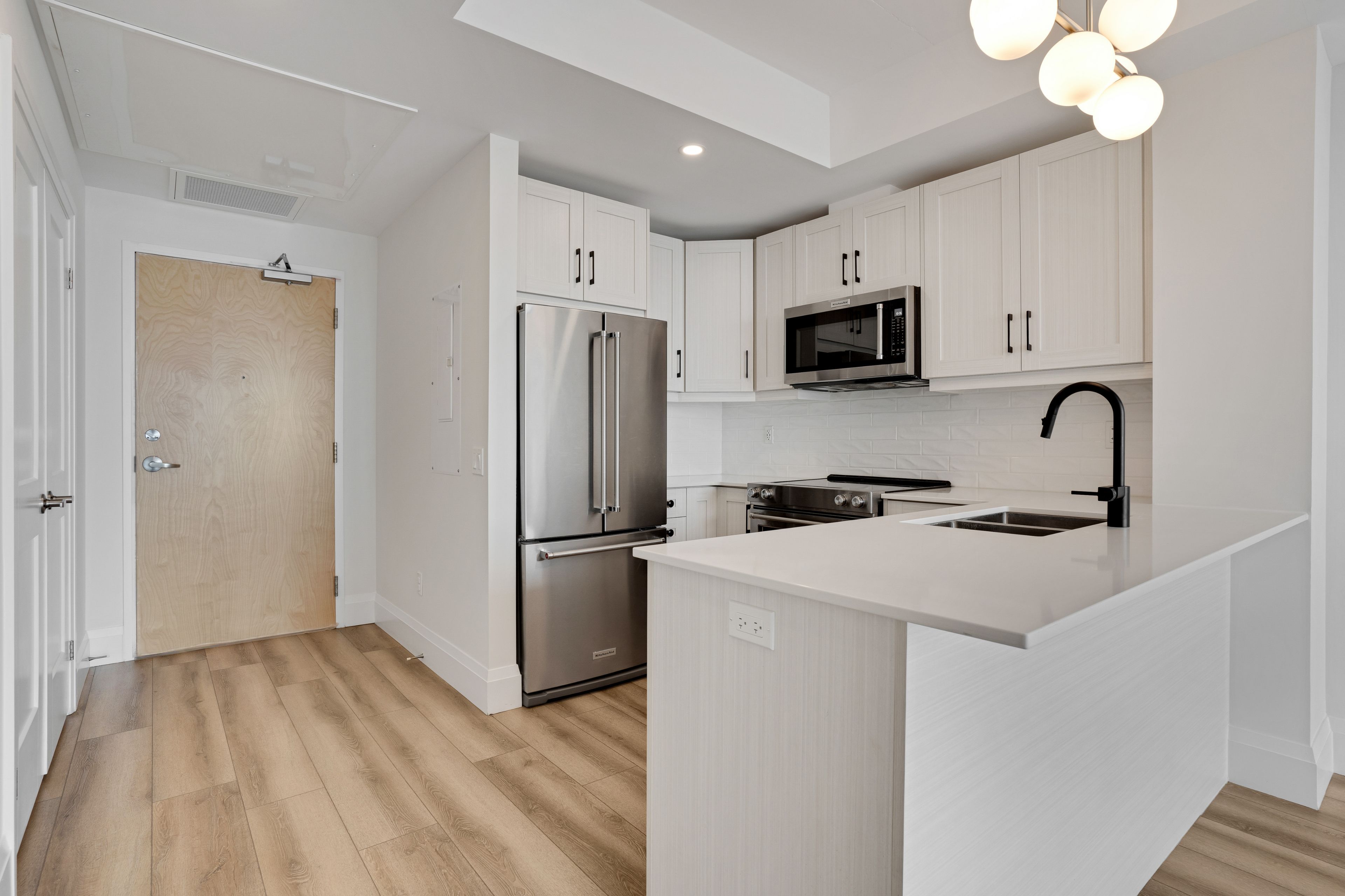 • Modern kitchen with custom backsplash and upgraded cabinetry.