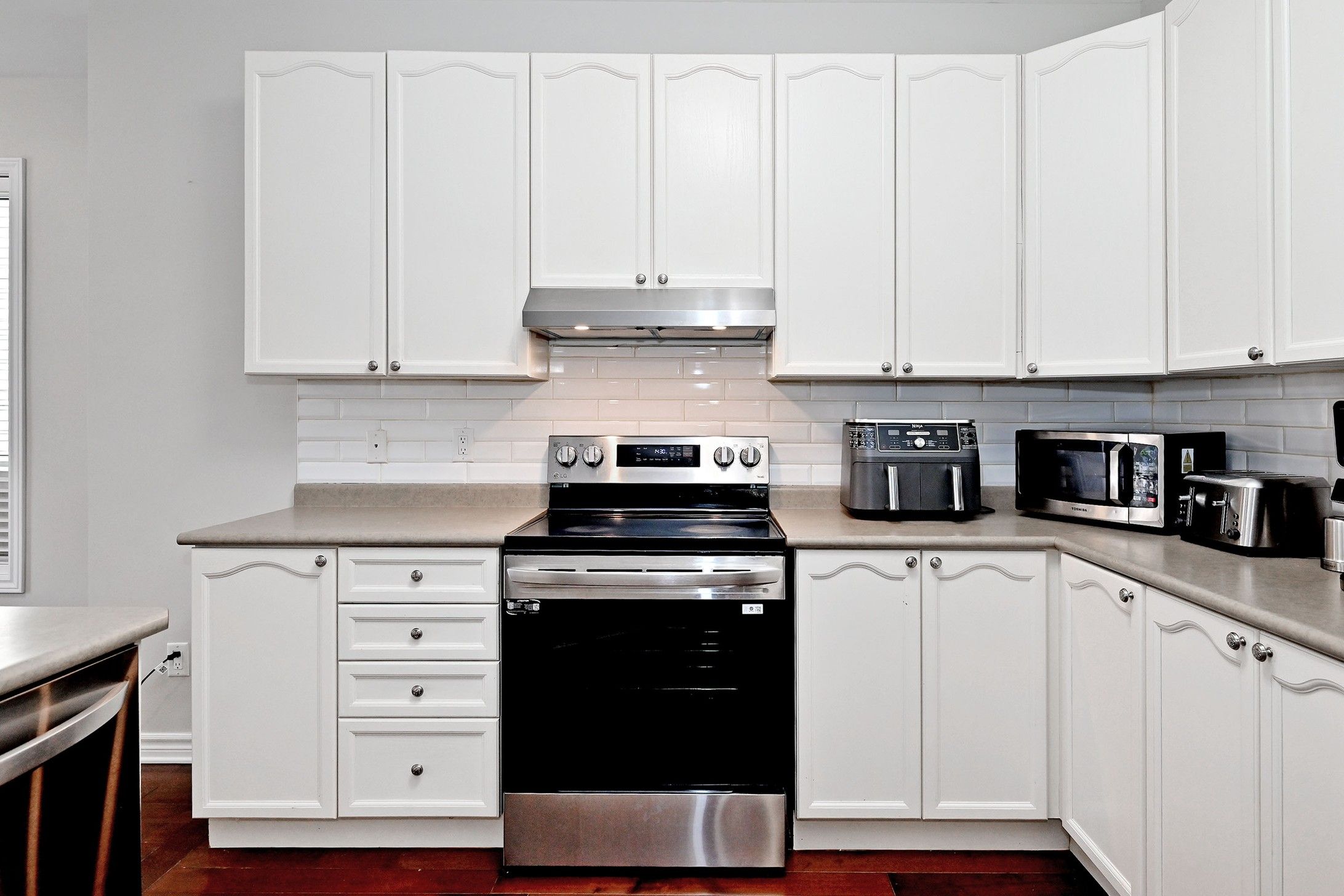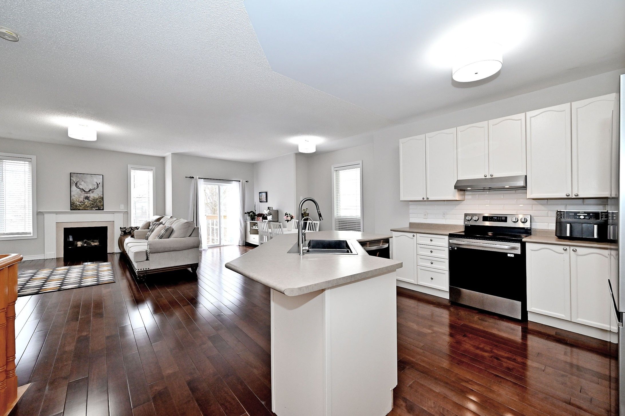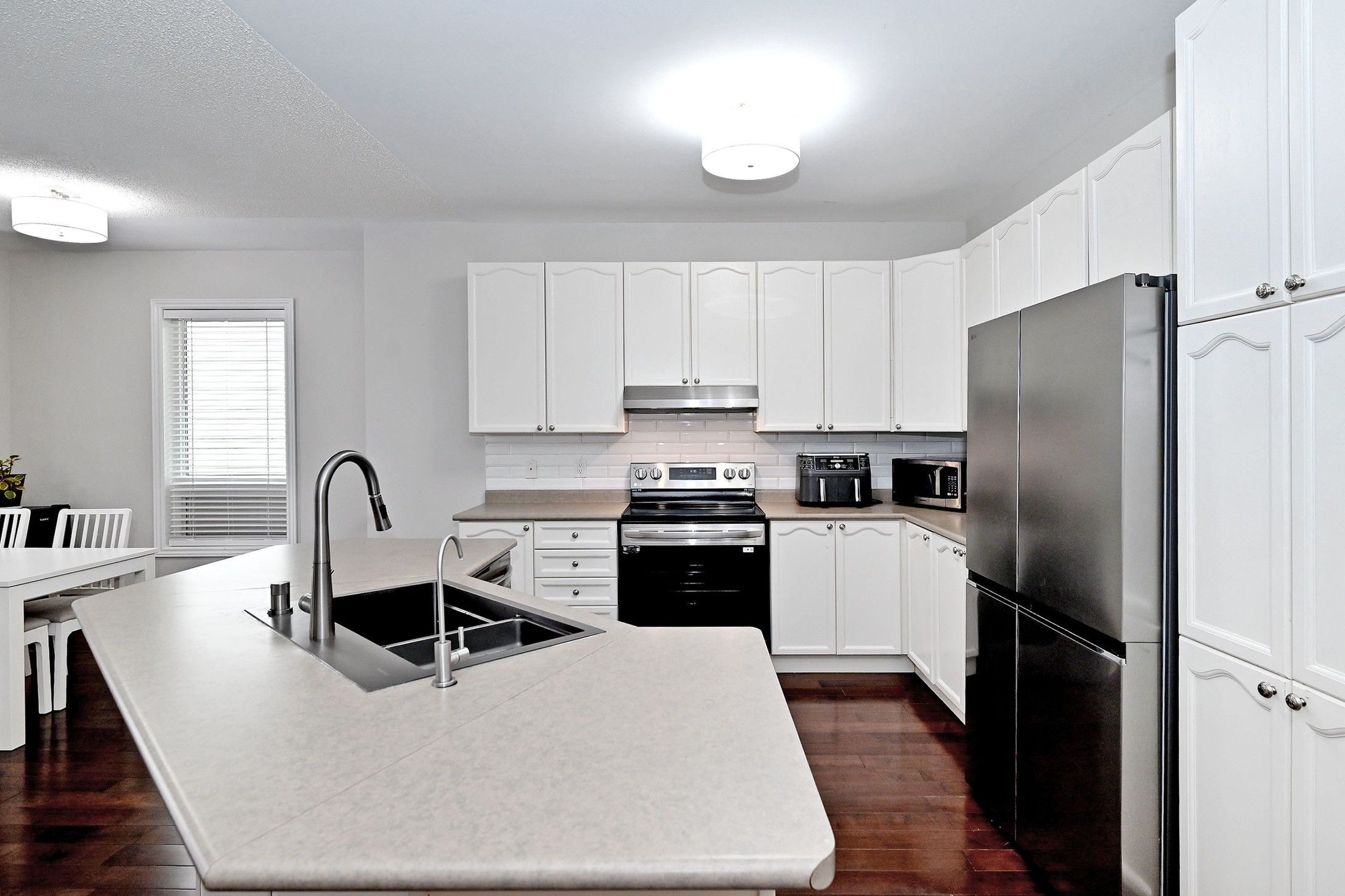 • Family-sized kitchen with a functional island and stainless steel appliances.