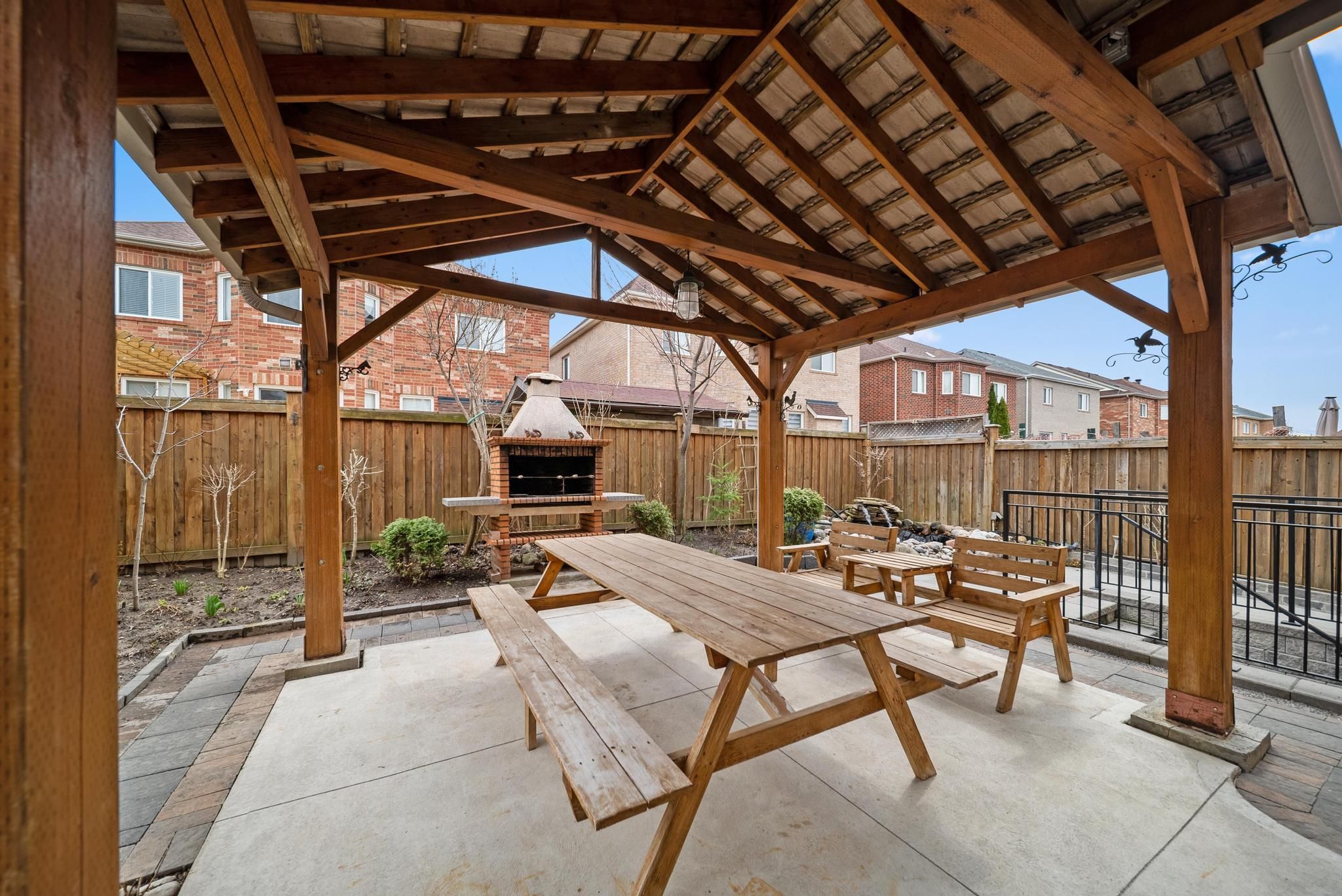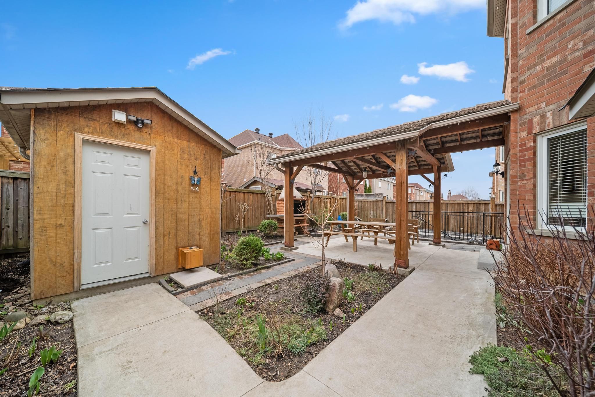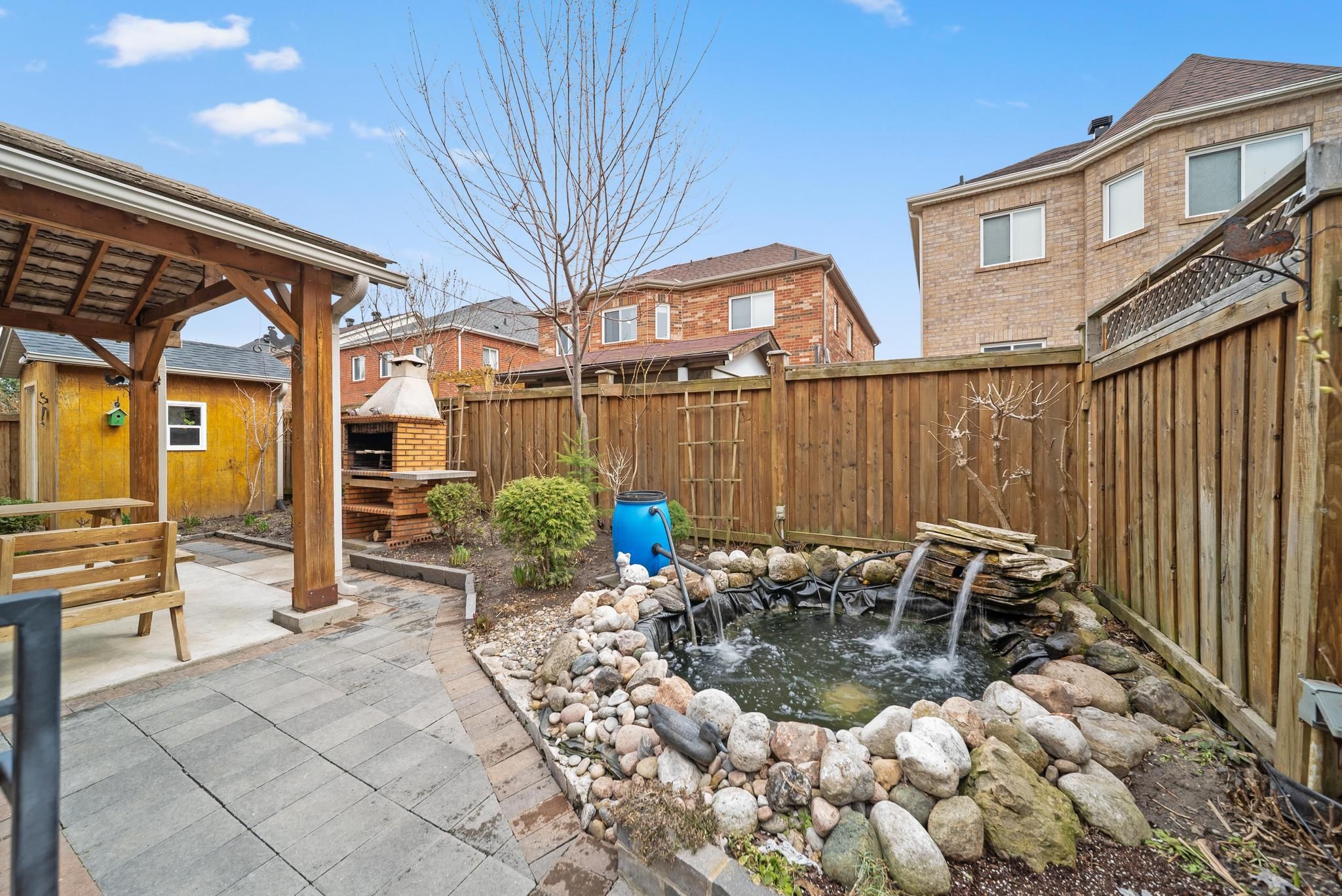 • Cozy landscaped backyard with a BBQ area and charming pond.