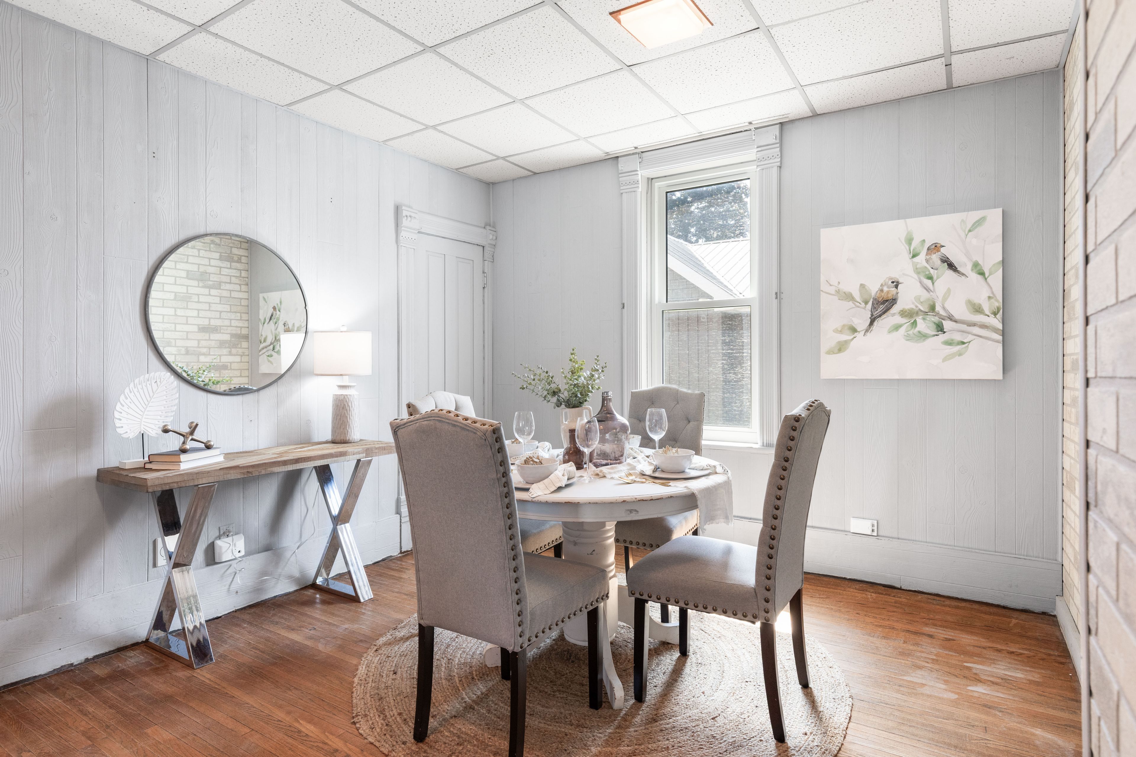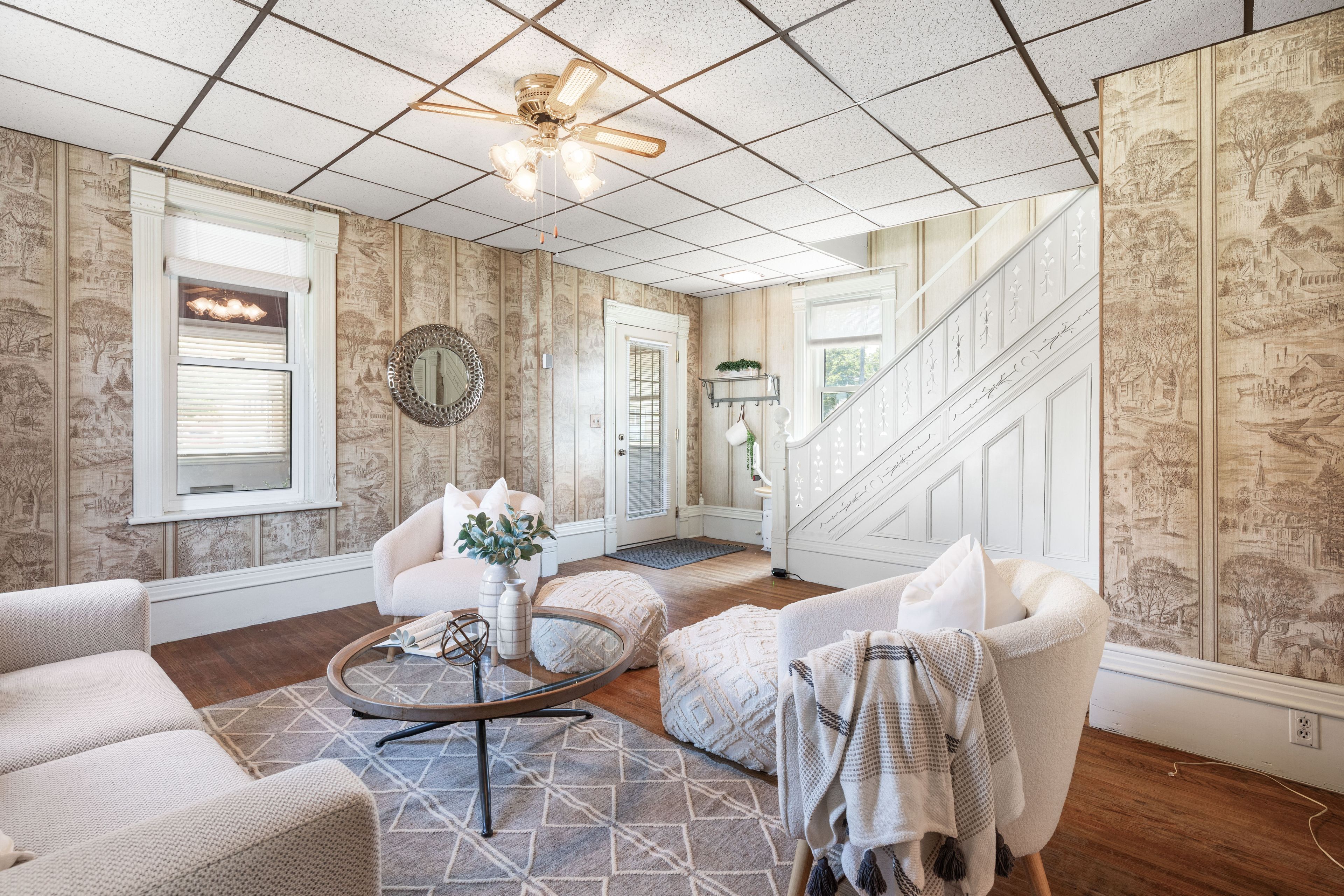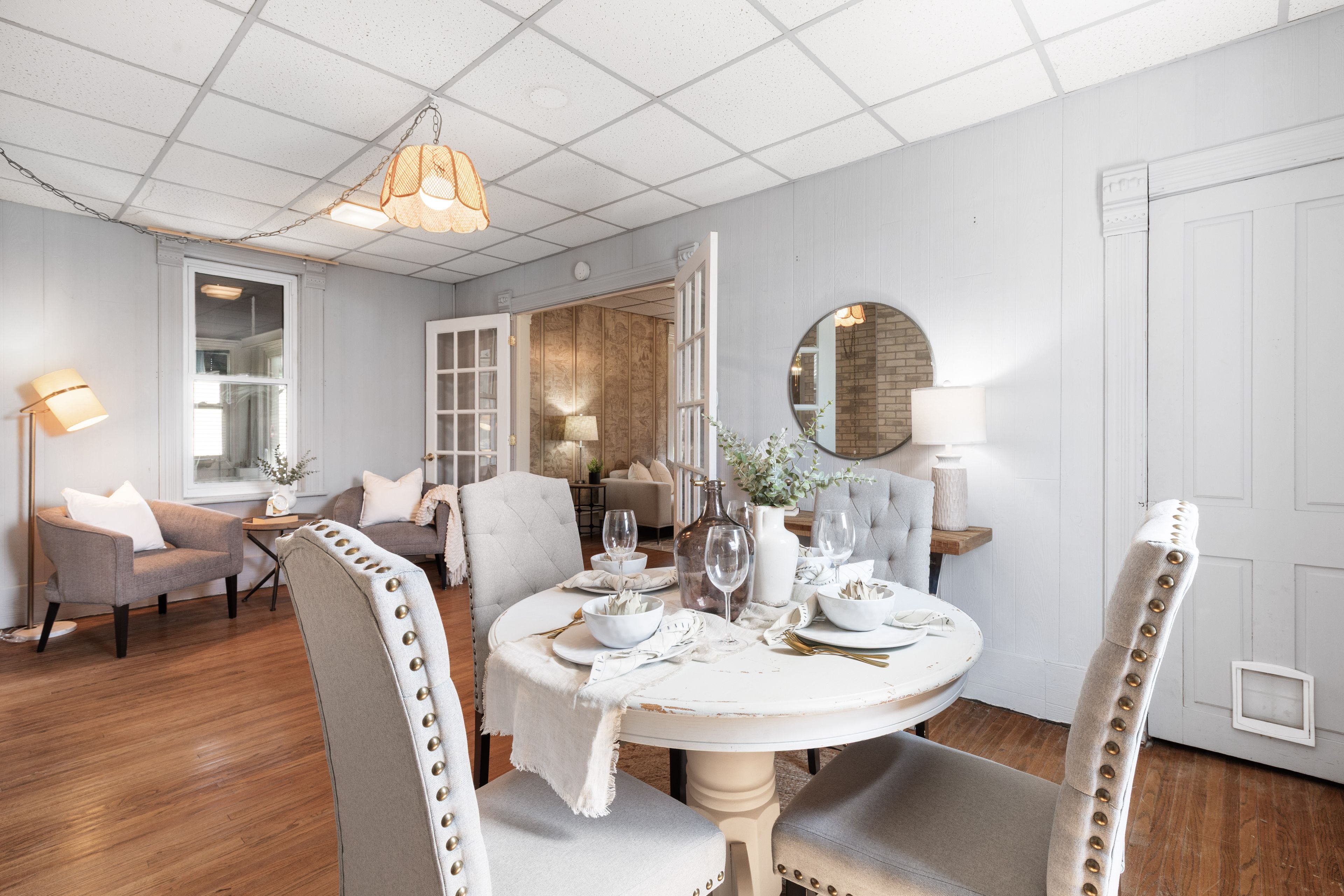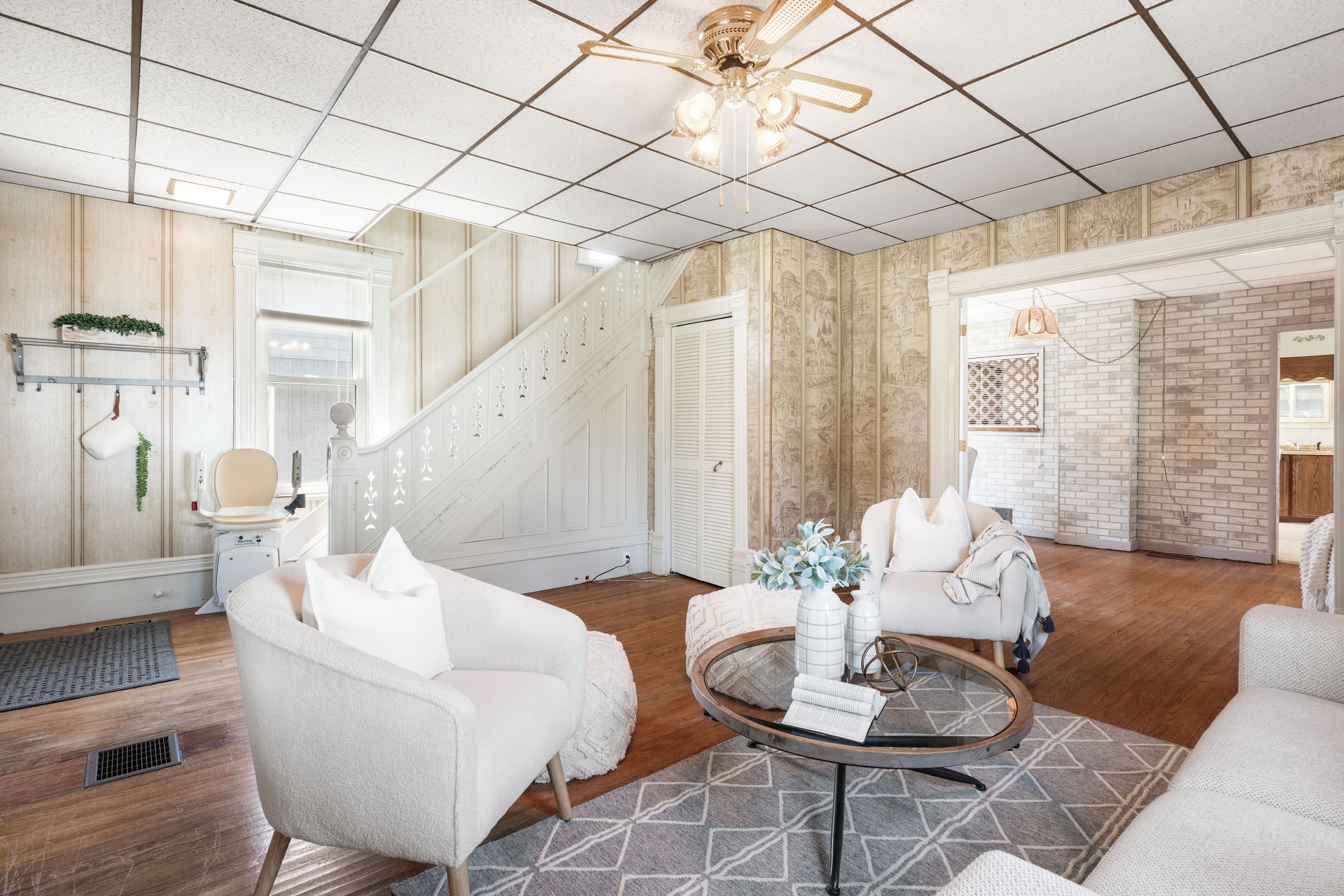 • Open-concept living and dining area featuring a handcrafted staircase.