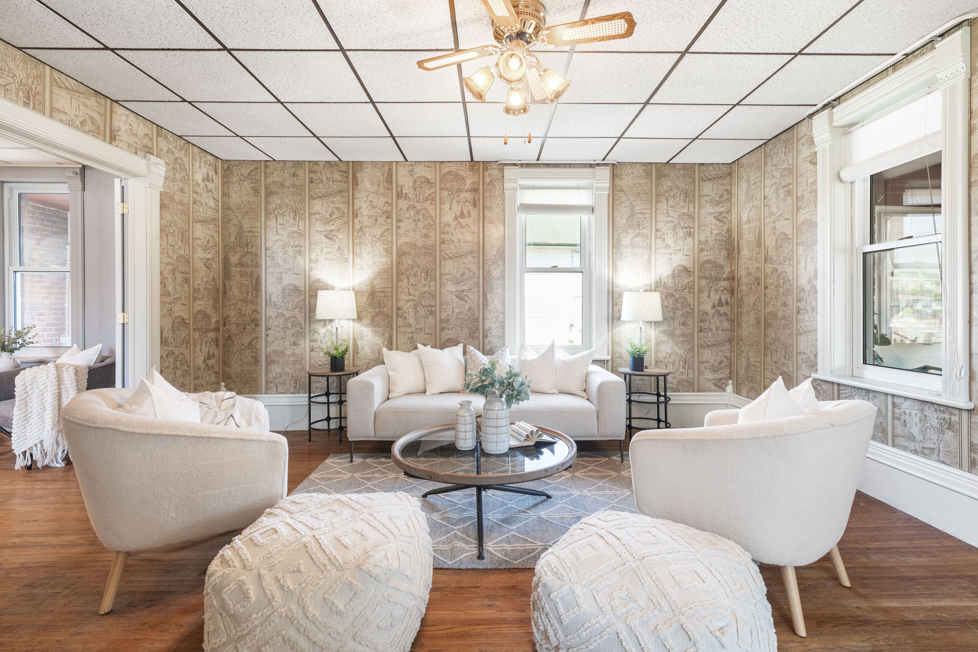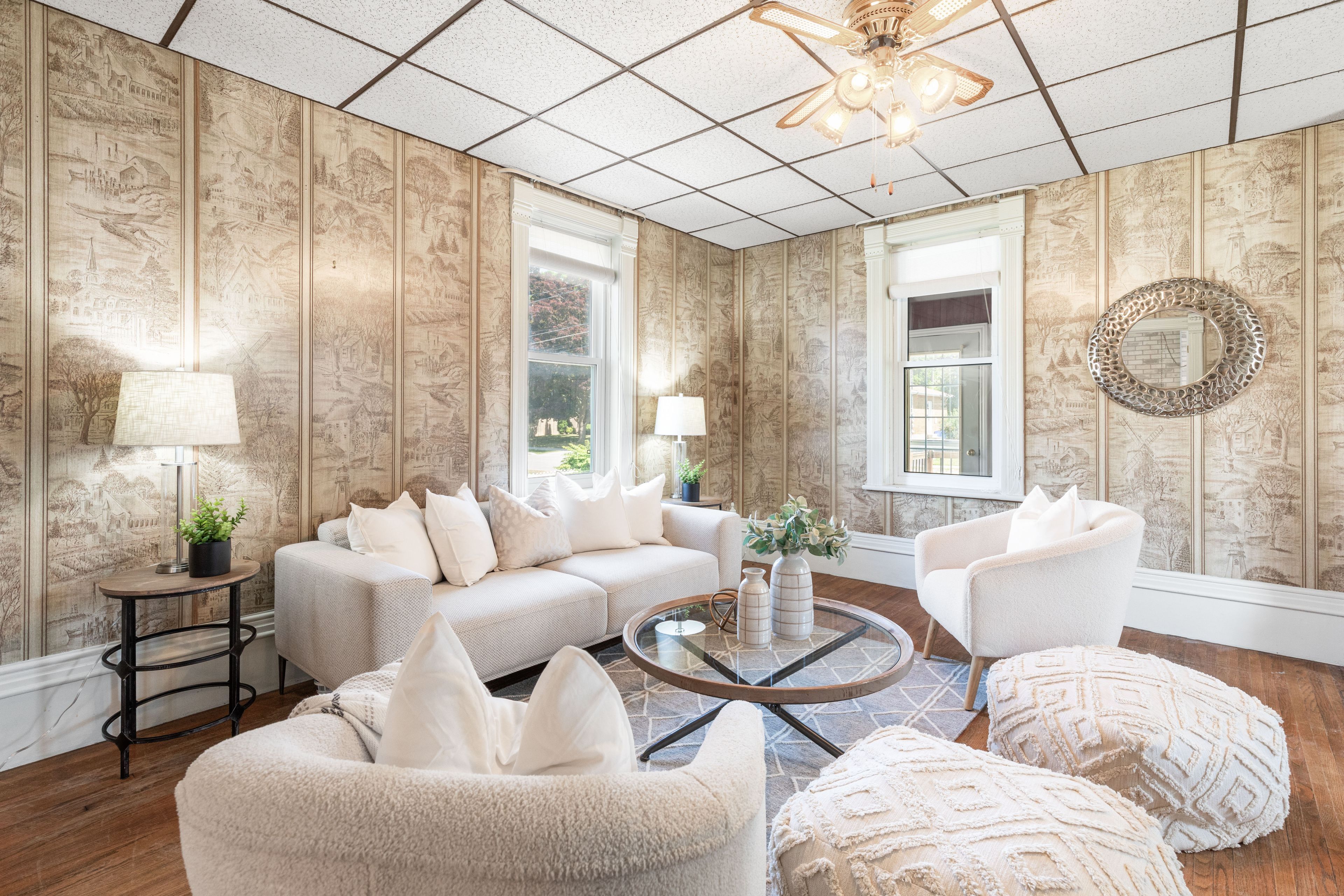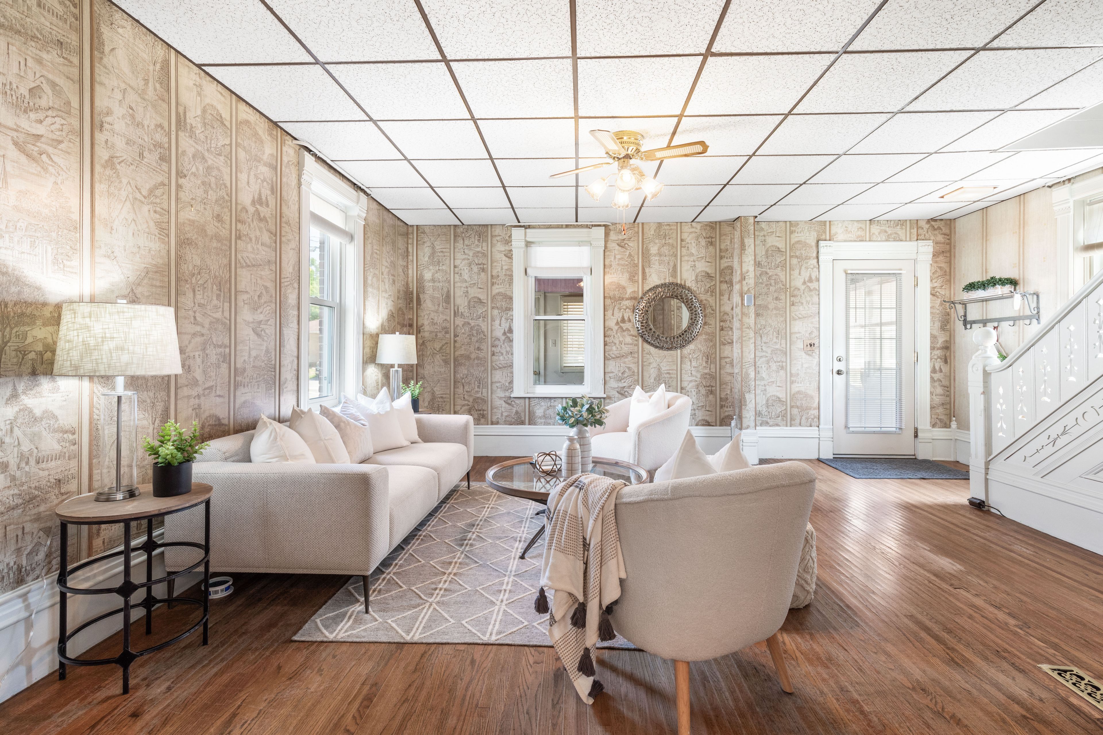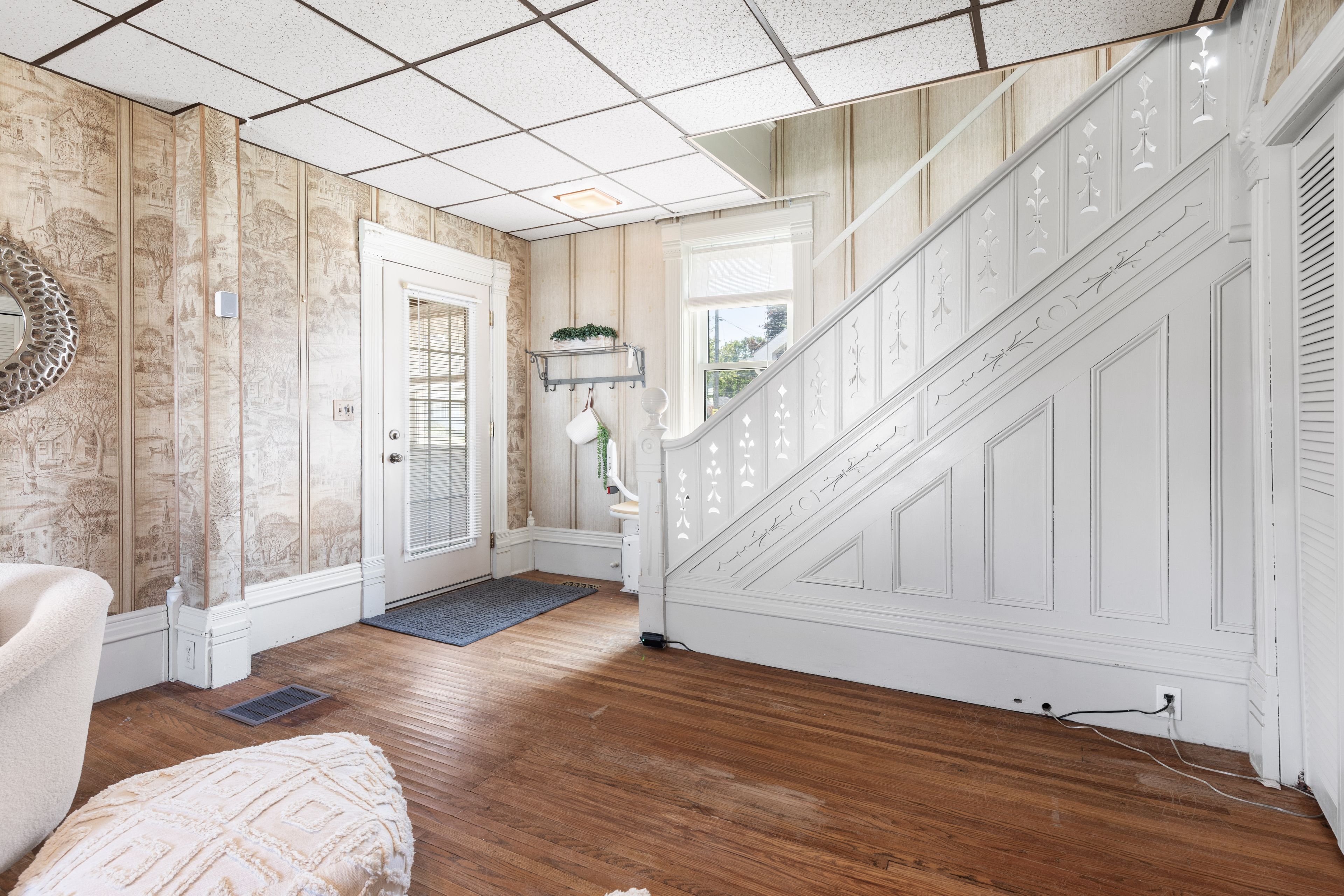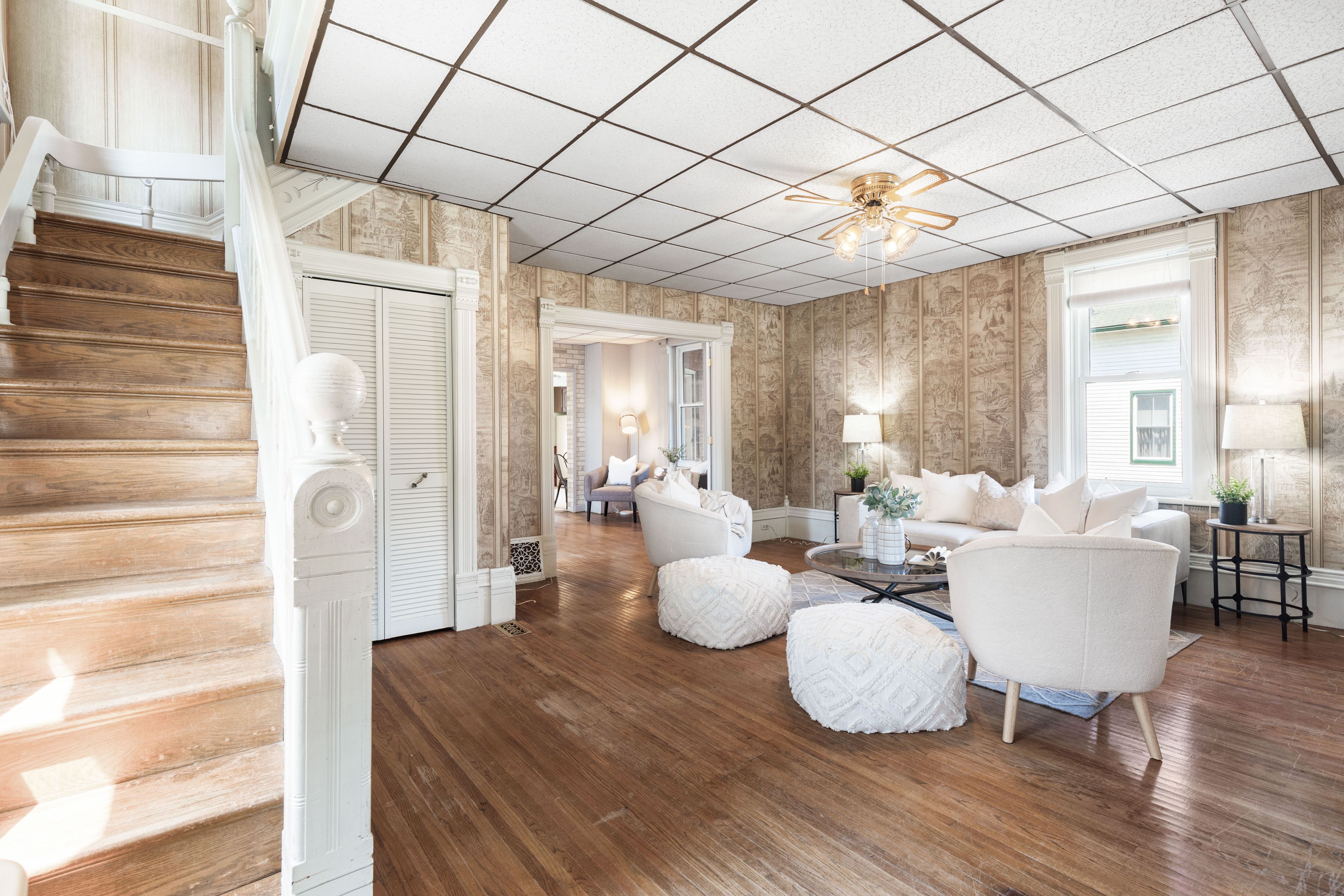 • Open-concept living and dining area featuring a handcrafted staircase.
