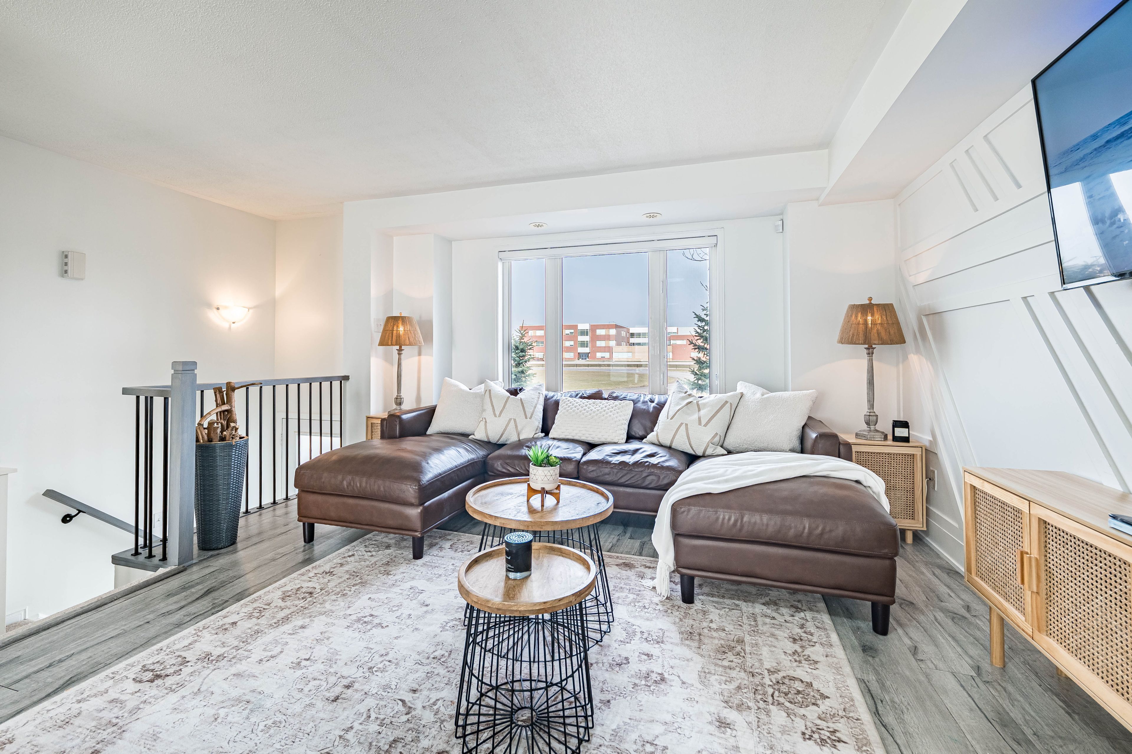 Welcome to 28-60 fairwood circle! Rare opportunity to own a tastefully upgraded end unit townhome fronting onto open space w/ no homes infront, enjoy exceptional privacy & natural light from both northern & southern exposure. This bright, open concept layout features generous principal rooms designed for modern living & entertaining. The sleek kitchen showcases white cabinetry, quartz countertops, a large centre island & ample storage. Enjoy a beautifully finished living space w/ grey tone flooring, updated railings & elegant wall trim creating a clean, contemporary feel. Step out to your private terrace complete w/ gazebo - a true outdoor extension of the home, perfect for relaxing or entertaining in style. Spacious bedrooms include a primary retreat that comfortably fits a king bed, while all bedrooms offer full ensuite bathrooms and walk-in closets - a rare & highly sought-after feature. Upper-level laundry, direct garage access & parking for two vehicles. Water softener & treatment system included. Located in a highly desirable, family-friendly community close to schools, parks, shopping, restaurants, library, gyms & transit. Whether its serene mornings, or your own outdoor oasis; this home is arguably one of the best in the area, come take a look for yourself & experience all that this home has to offer.