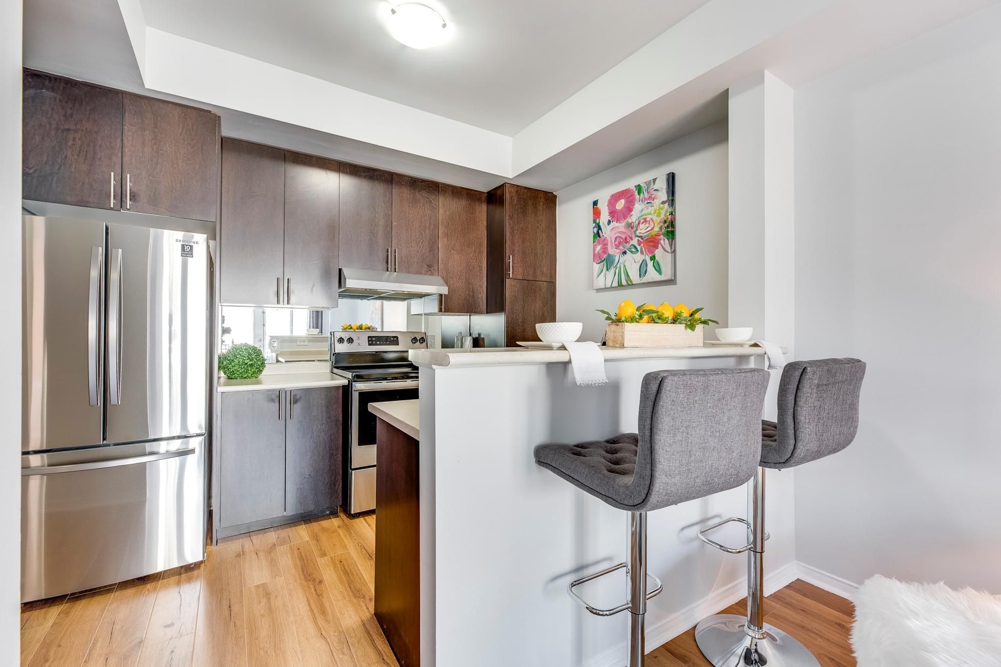 Executive townhouse in amazing location in brampton. Open concept main level condo with 1br/1wr with 1 surface level parking spot. Interlocking work in front of the house. Main level laundry. Breakfast bar in kitchen & laminate floors in whole house. Steps to shopping plaza, trinity common mall, major banks, restaurants, hospital, highways & public transit. Walking distance to elementary/high school. All utilities to be paid by tenant - hydro, heat, water and hot water tank rental. Staging pictures used in listing are from before the tenant moved in.
