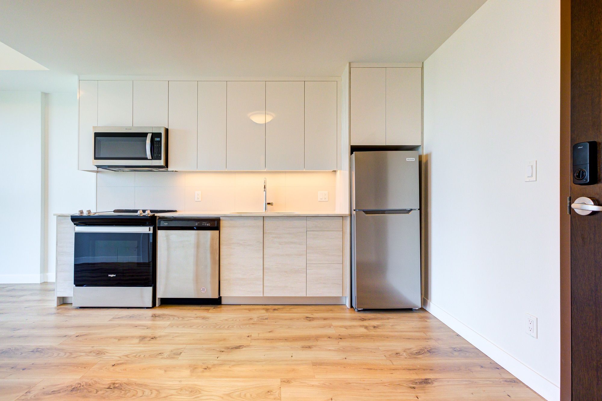 • Modern kitchen features quartz countertops and stainless steel appliances.
