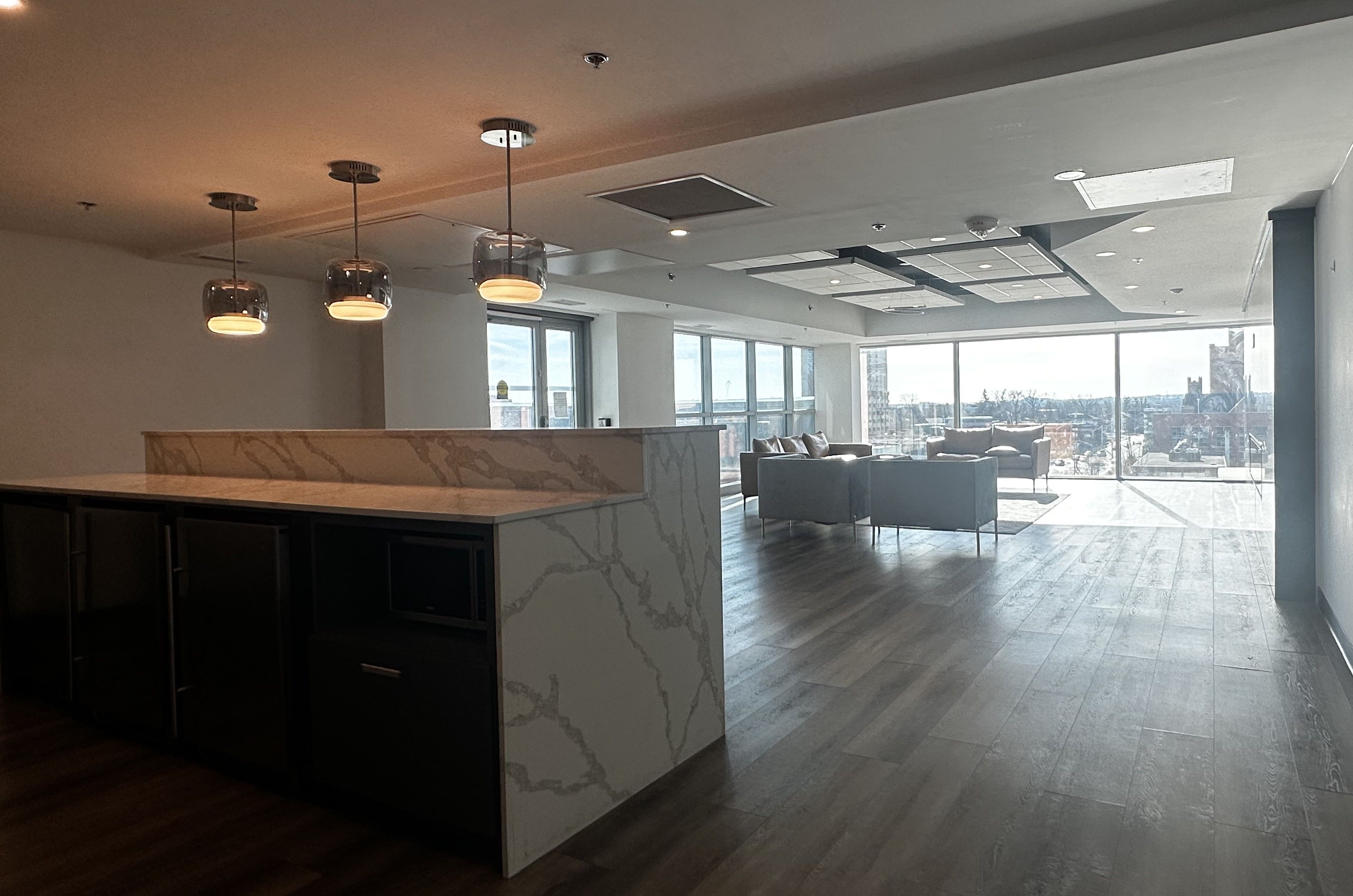 • Gourmet kitchen with stainless steel appliances and quartz countertops.