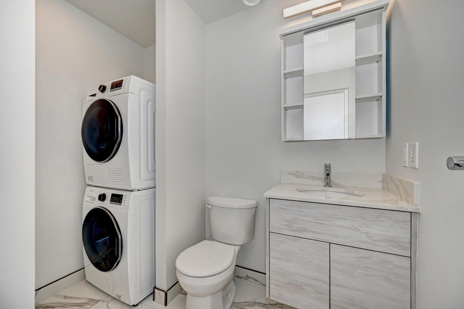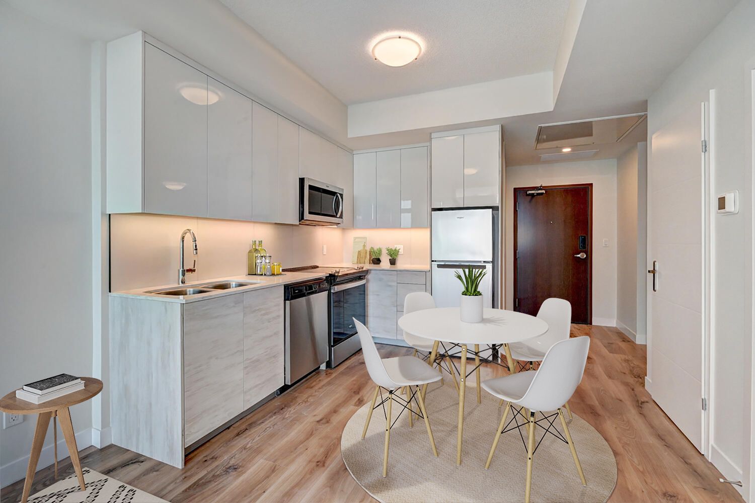 • Modern kitchen with stainless steel appliances and quartz counters.