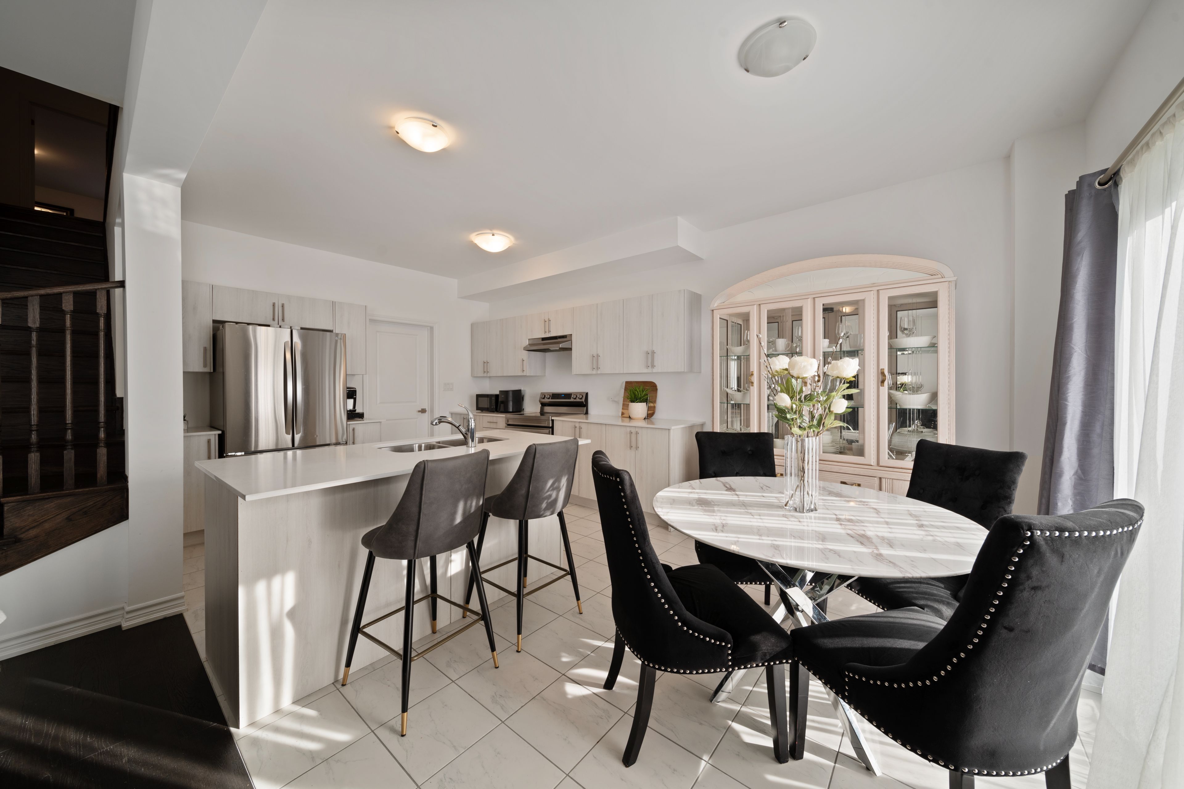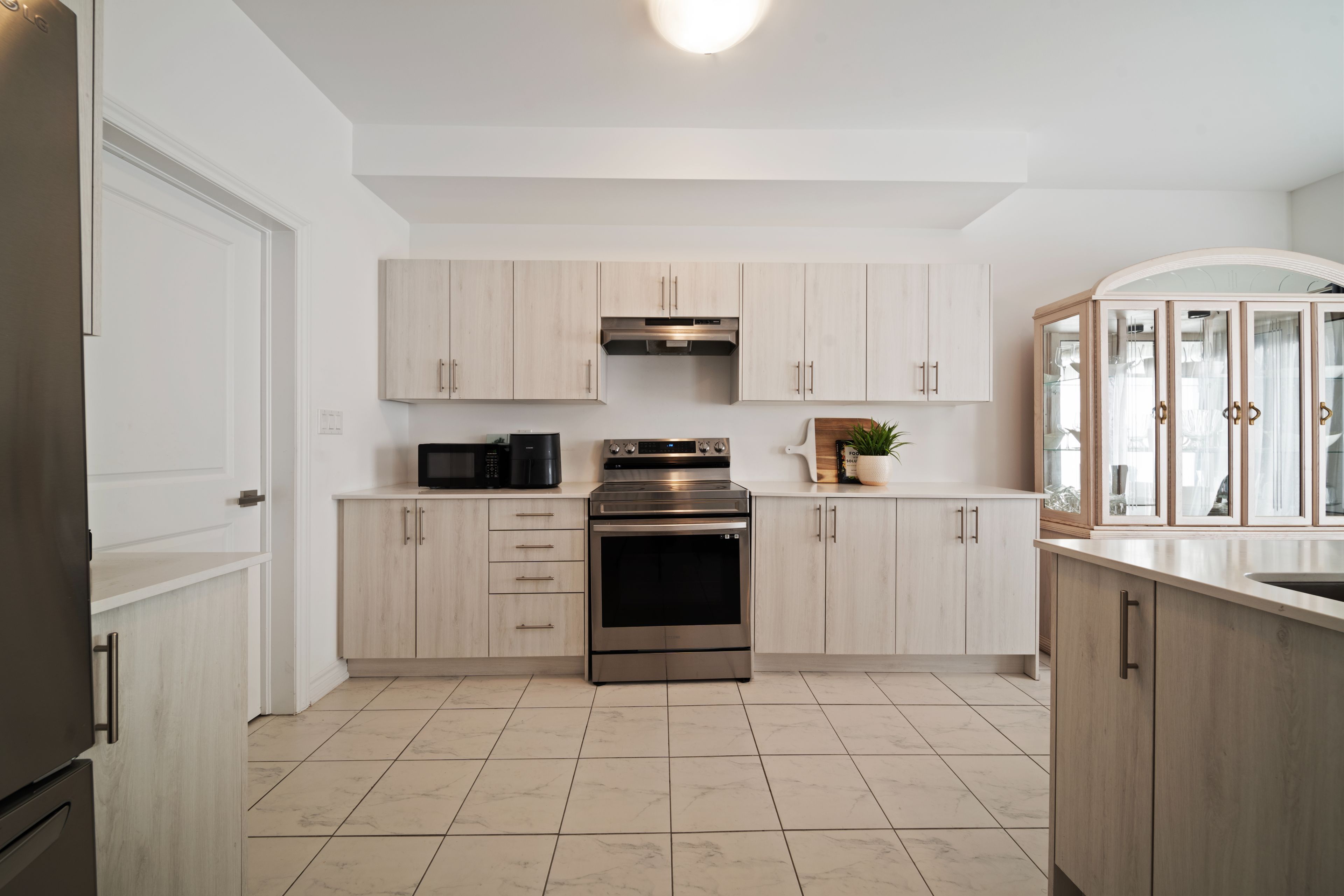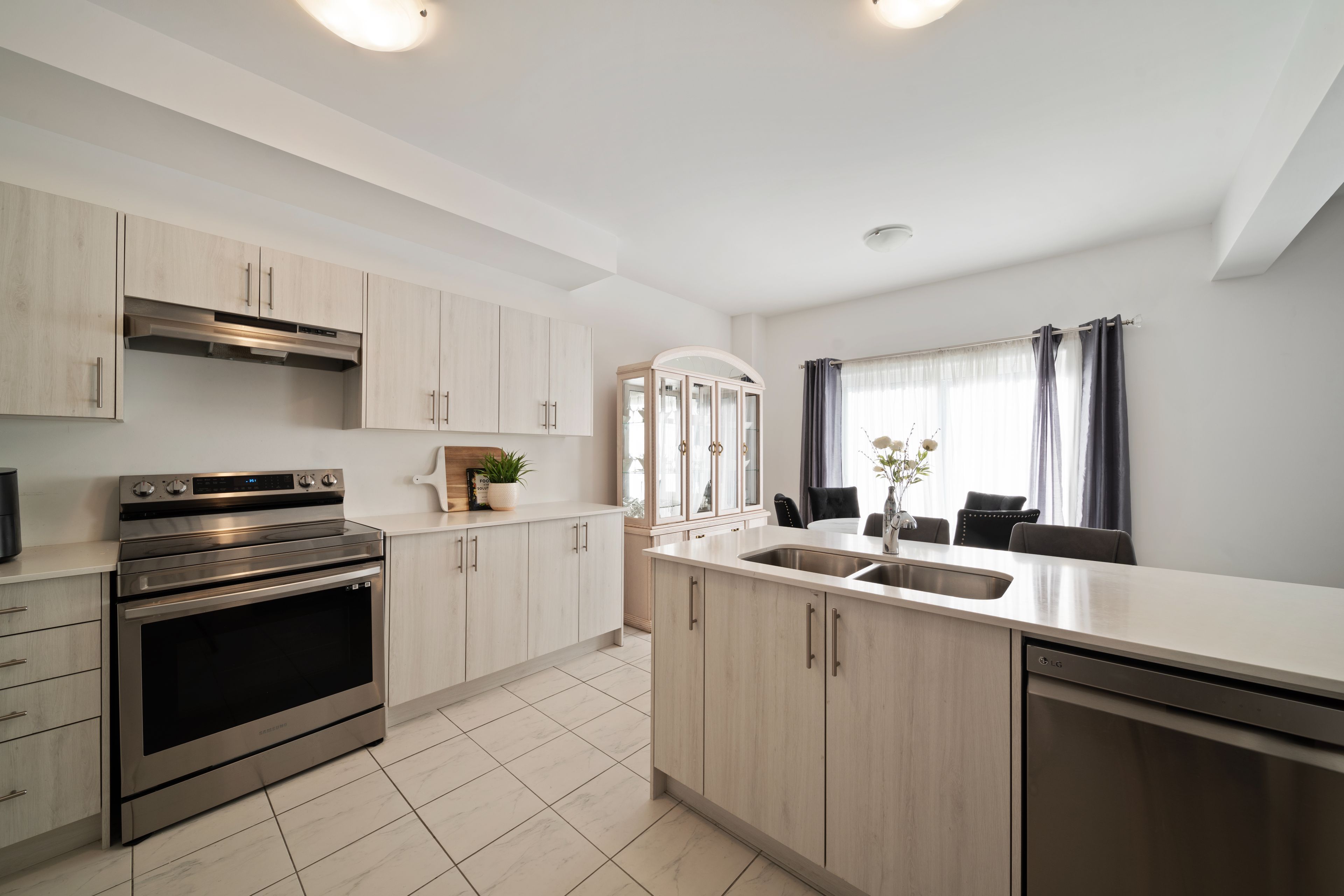 • Stylish kitchen with stainless steel appliances and granite countertops.