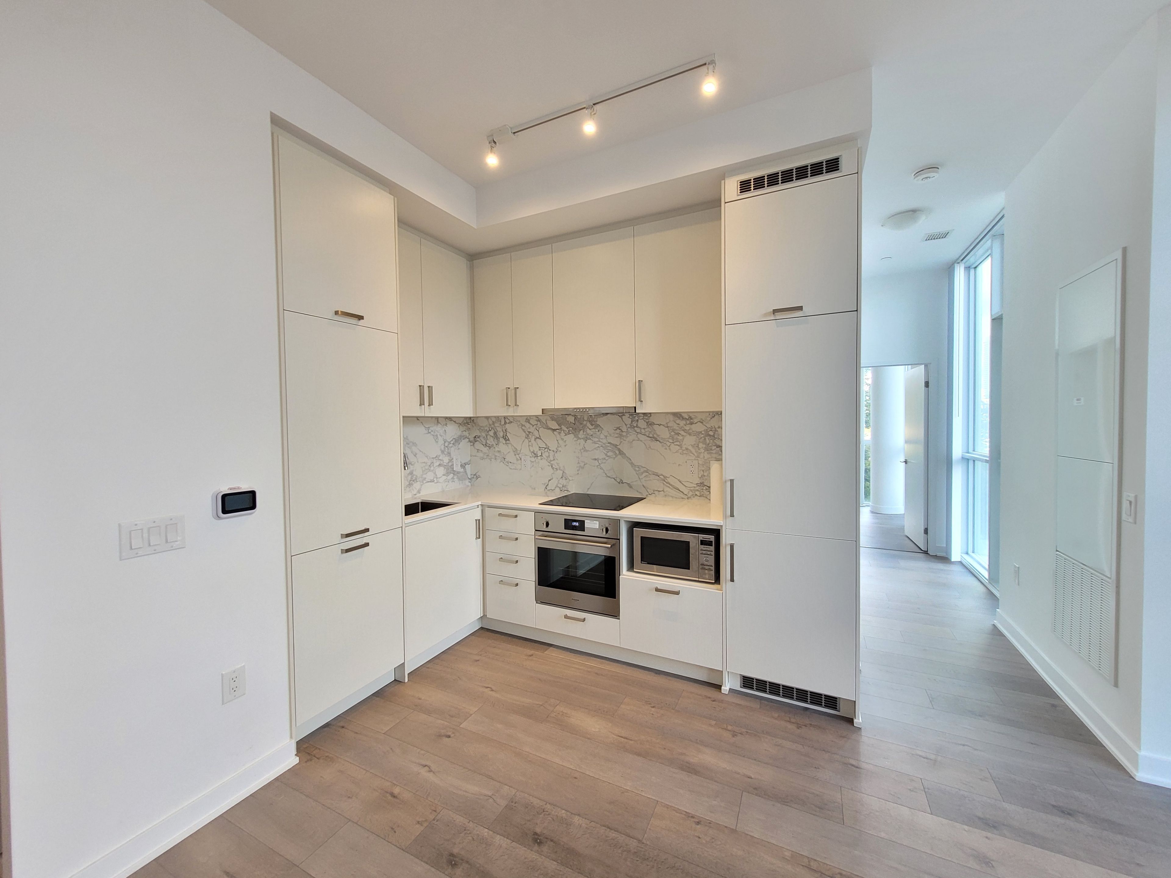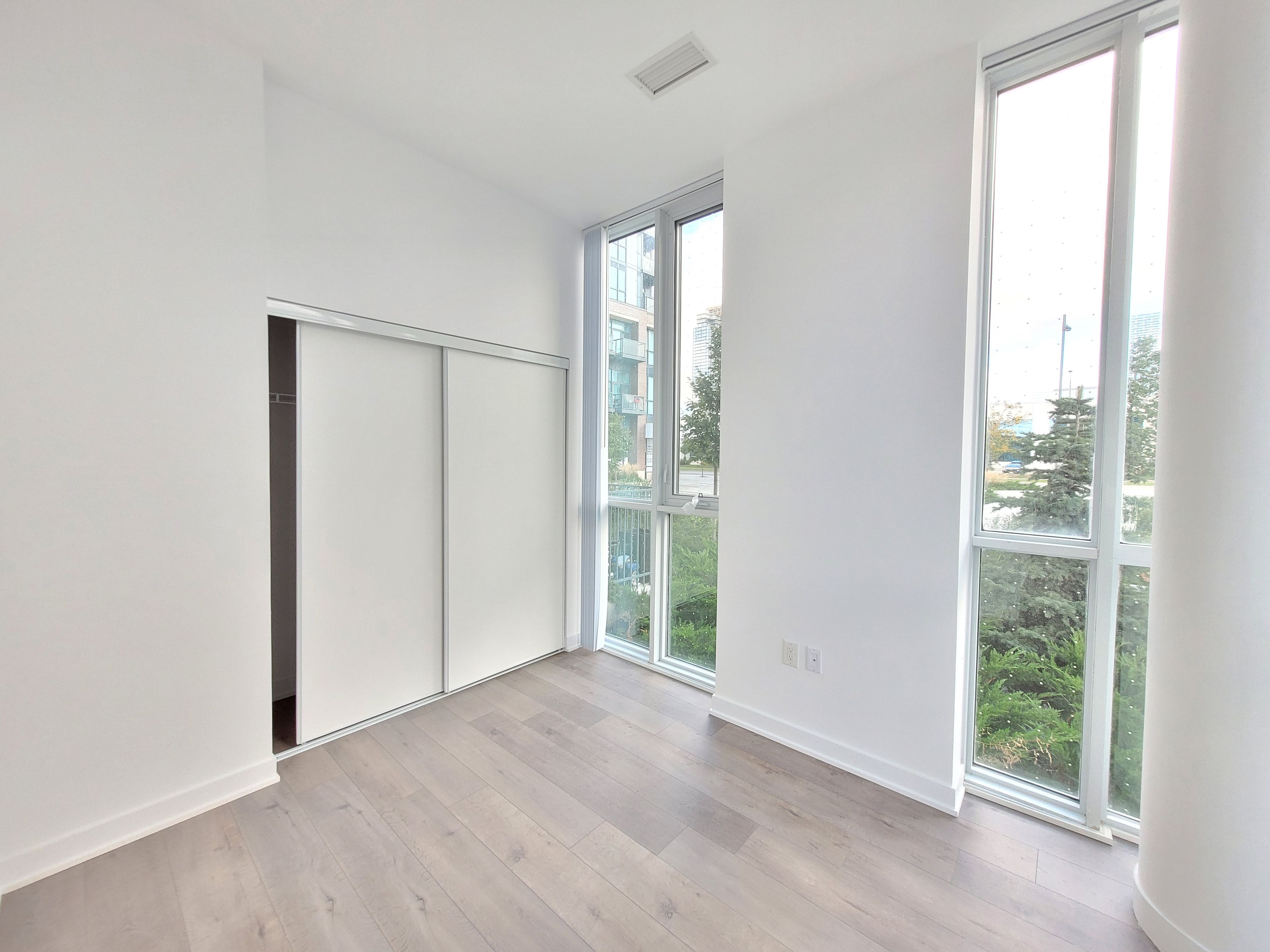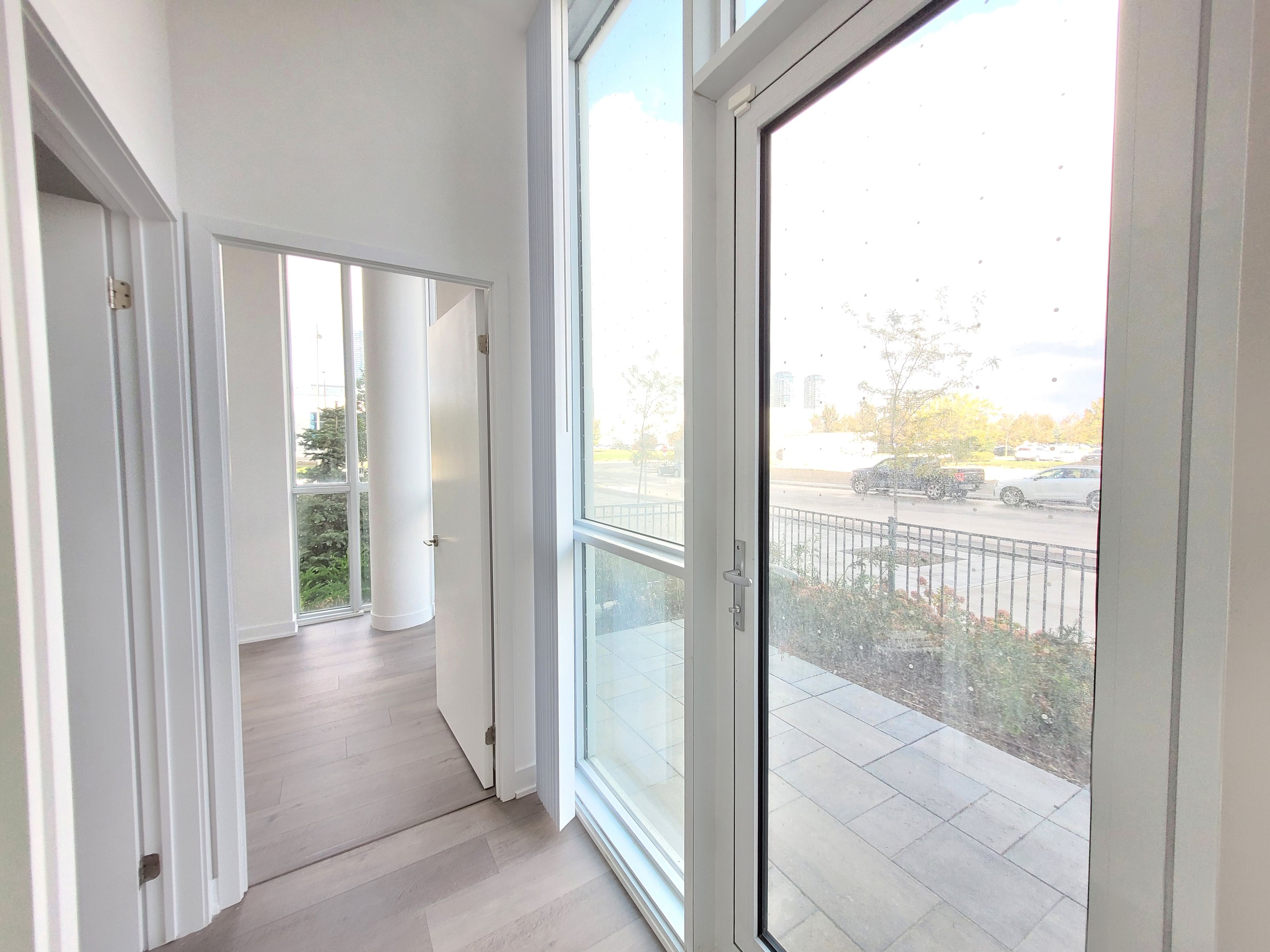 Mobilio south tower - unique ground level 2 bedroom & 1 bathroom corner unit. Open concept kitchen living room - 645 sq. Ft.,with high ceilings, ensuite laundry, stainless steel kitchen appliances included. Engineered hardwood floors, stone counter tops. 1 parking included