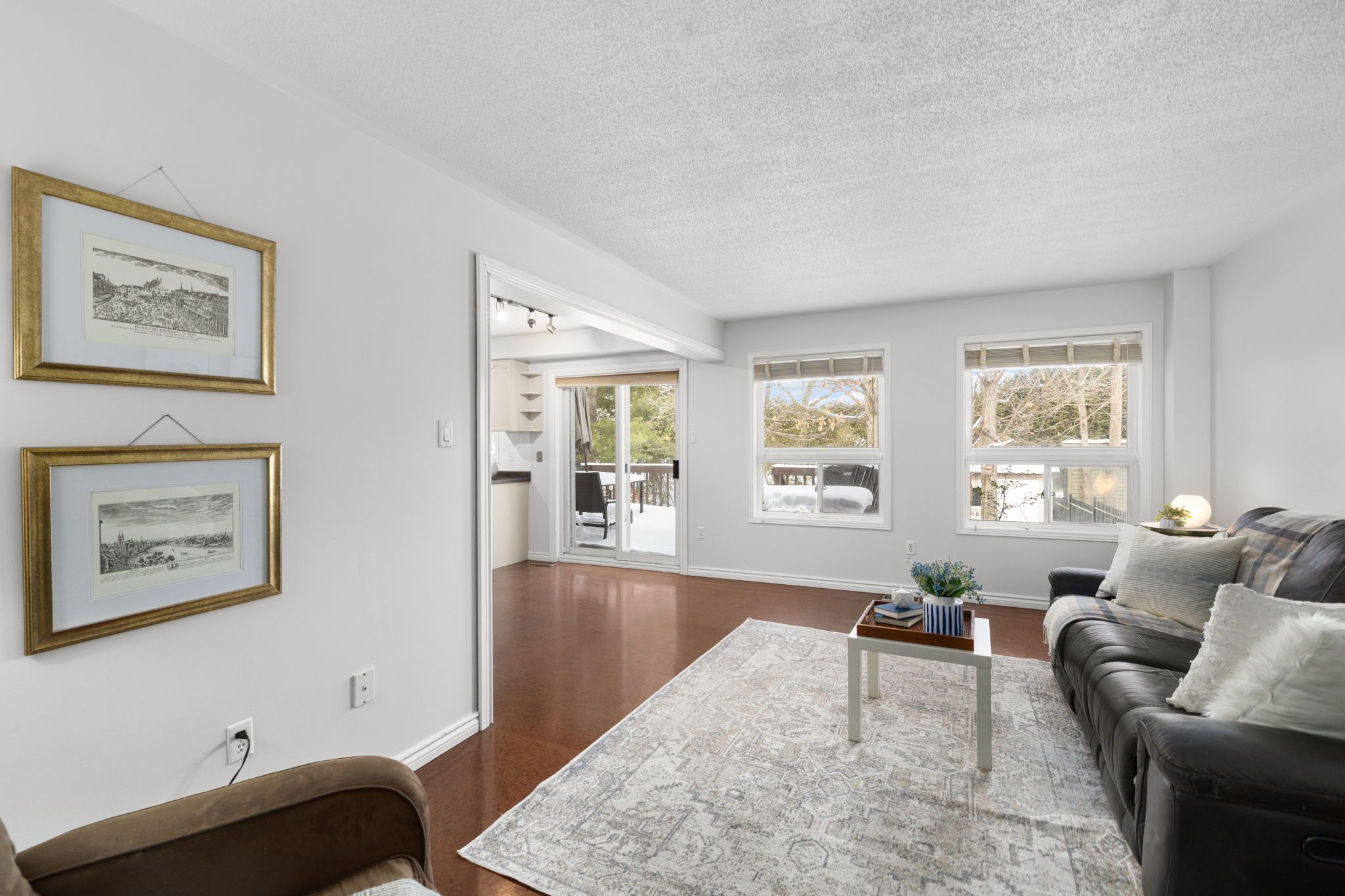 • Bright family room with a cozy fireplace connecting to the kitchen.