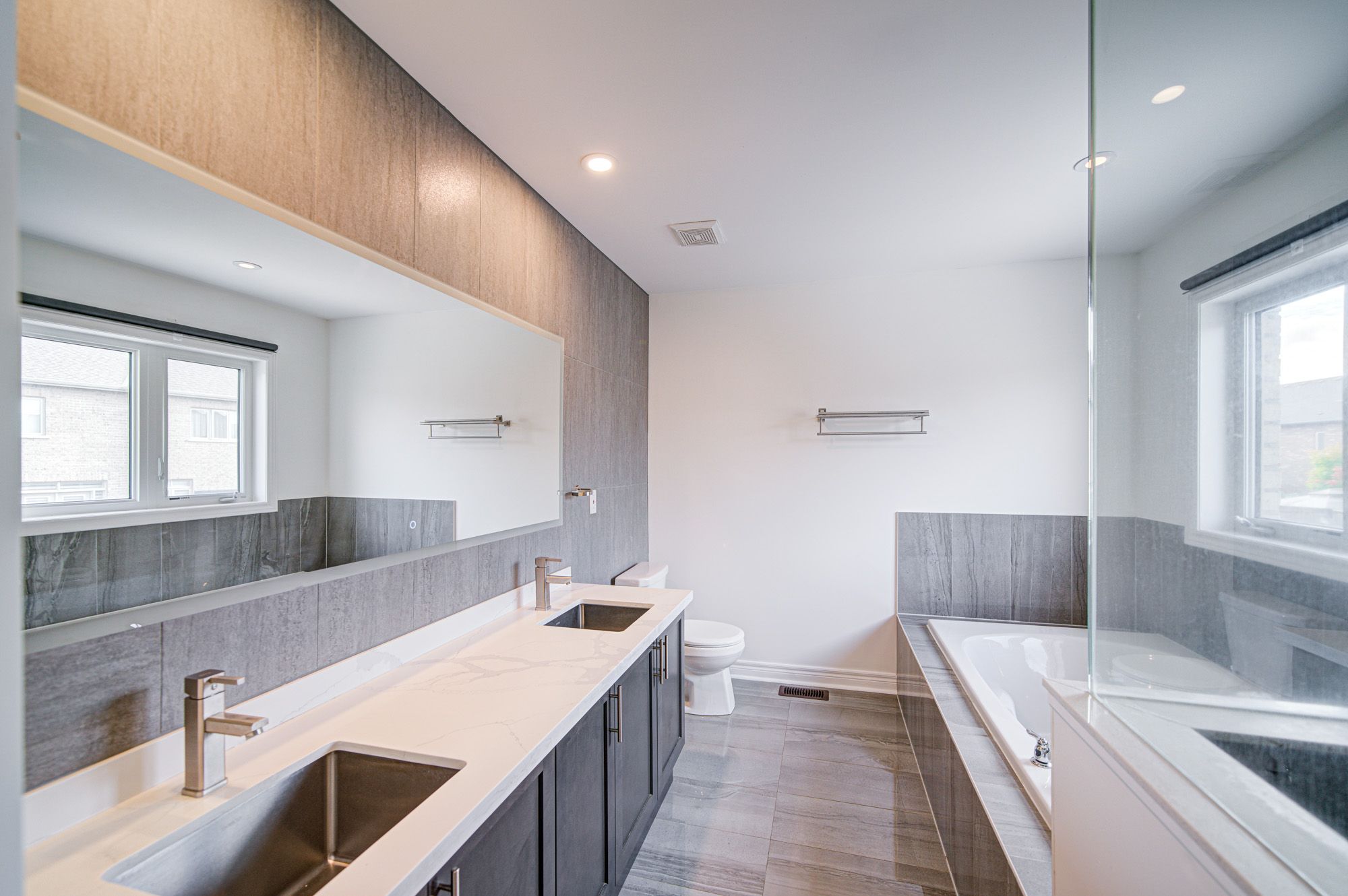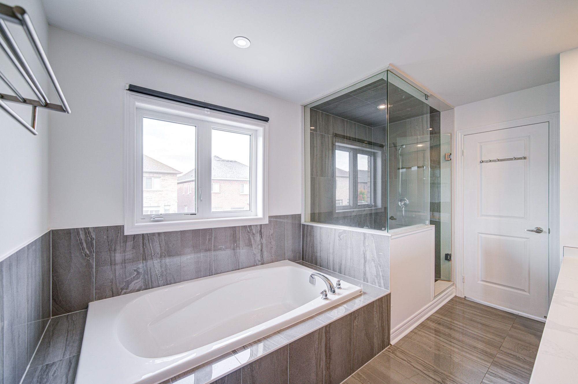 • Spacious master bedroom featuring a soaker tub and glass shower.