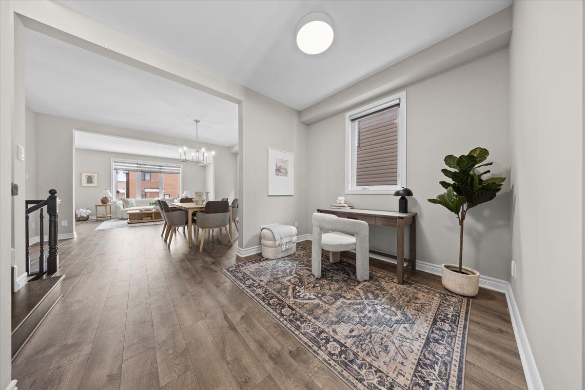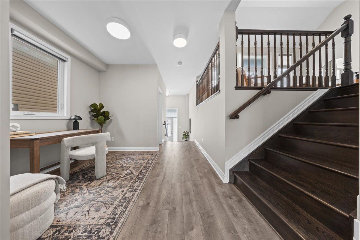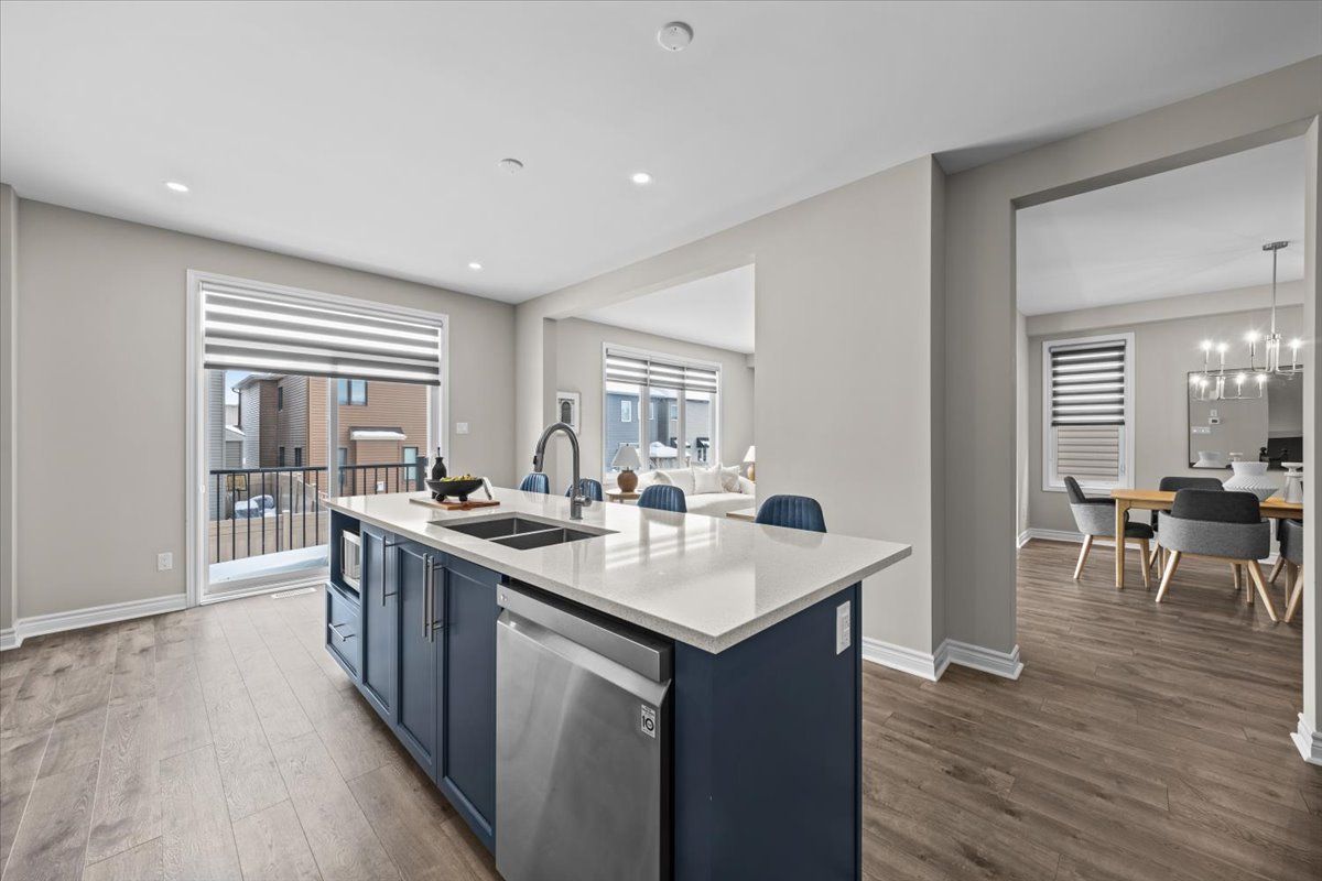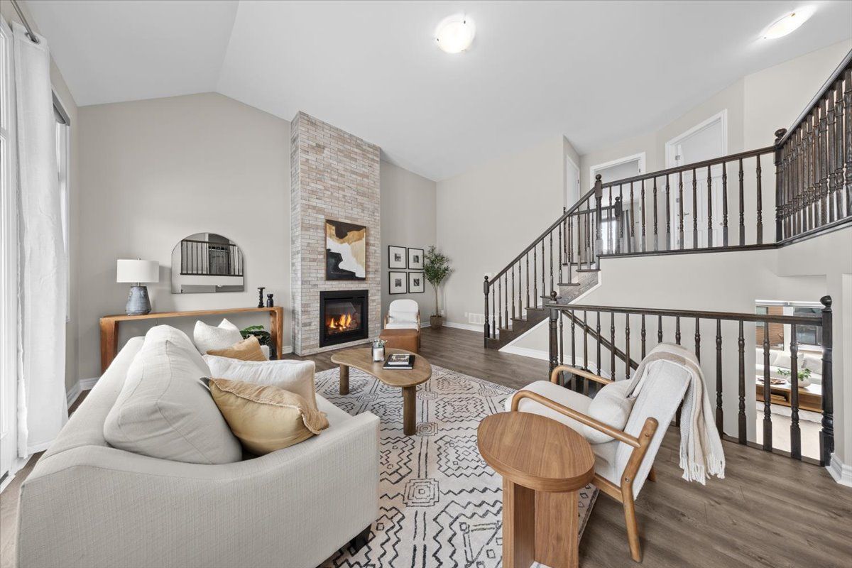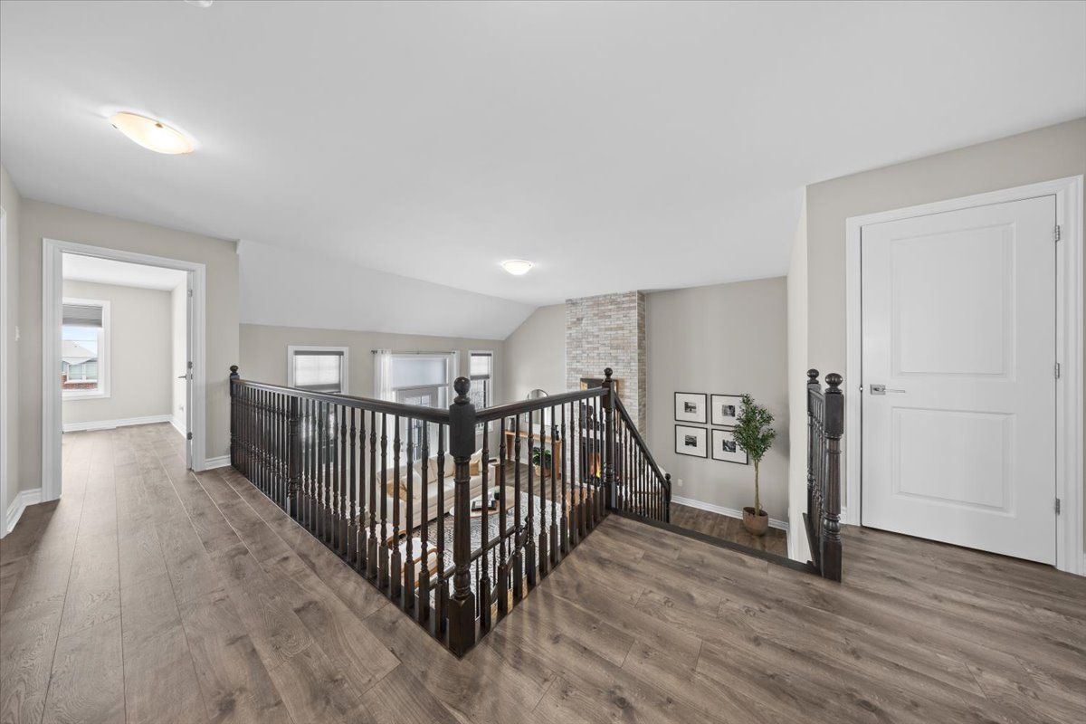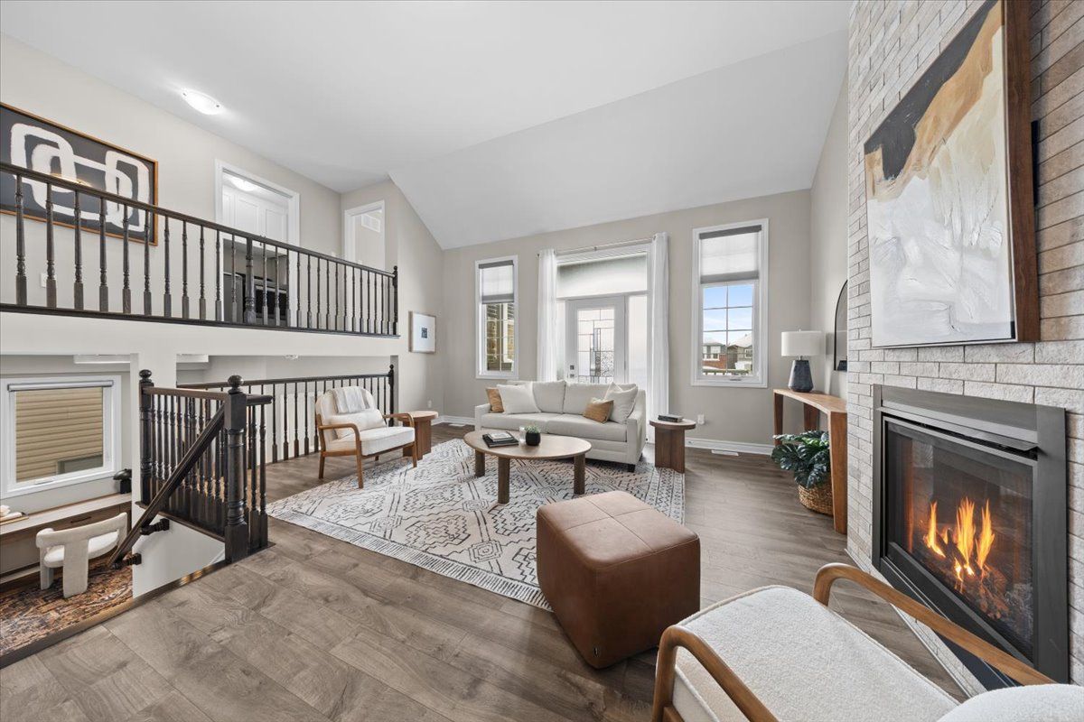 Well-designed home with a functional layout and quality finishes throughout. Covered front porch with arched entry leads to a tiled foyer with double-door closet and a grand front door with sidelights and transom windows. Hardwood staircase to the main level featuring pre-engineered hardwood flooring, 9-foot ceilings, powder room, and an open nook suitable for an office or play space. Formal dining area flows into the living room and kitchen with clear front-to-back sightlines. Kitchen includes an extended centre island with seating for four, quartz countertops, stainless steel appliances, floor-to-ceiling cabinetry, two pantry walls, two-tone cabinets, tiled backsplash, pot lights, and ample storage. Upper level offers a landing-style family room with gas fireplace and floor-to-ceiling stone feature, european-style balcony, and high ceilings. 3 bdrm + laundry room, and linen storage. Primary bedroom with rear-facing window, walk-in closet, and ensuite featuring a glass shower, soaker tub, and large vanity. Finished lower level with two oversized egress windows, full four-piece bathroom, recreation space, storage, mudroom, and direct access to the double car garage. Low-maintenance backyard with pvc deck, fencing, and turf grass. Colonial-style baseboards throughout. Steps away from pond, trails, schools, parks and amenities.