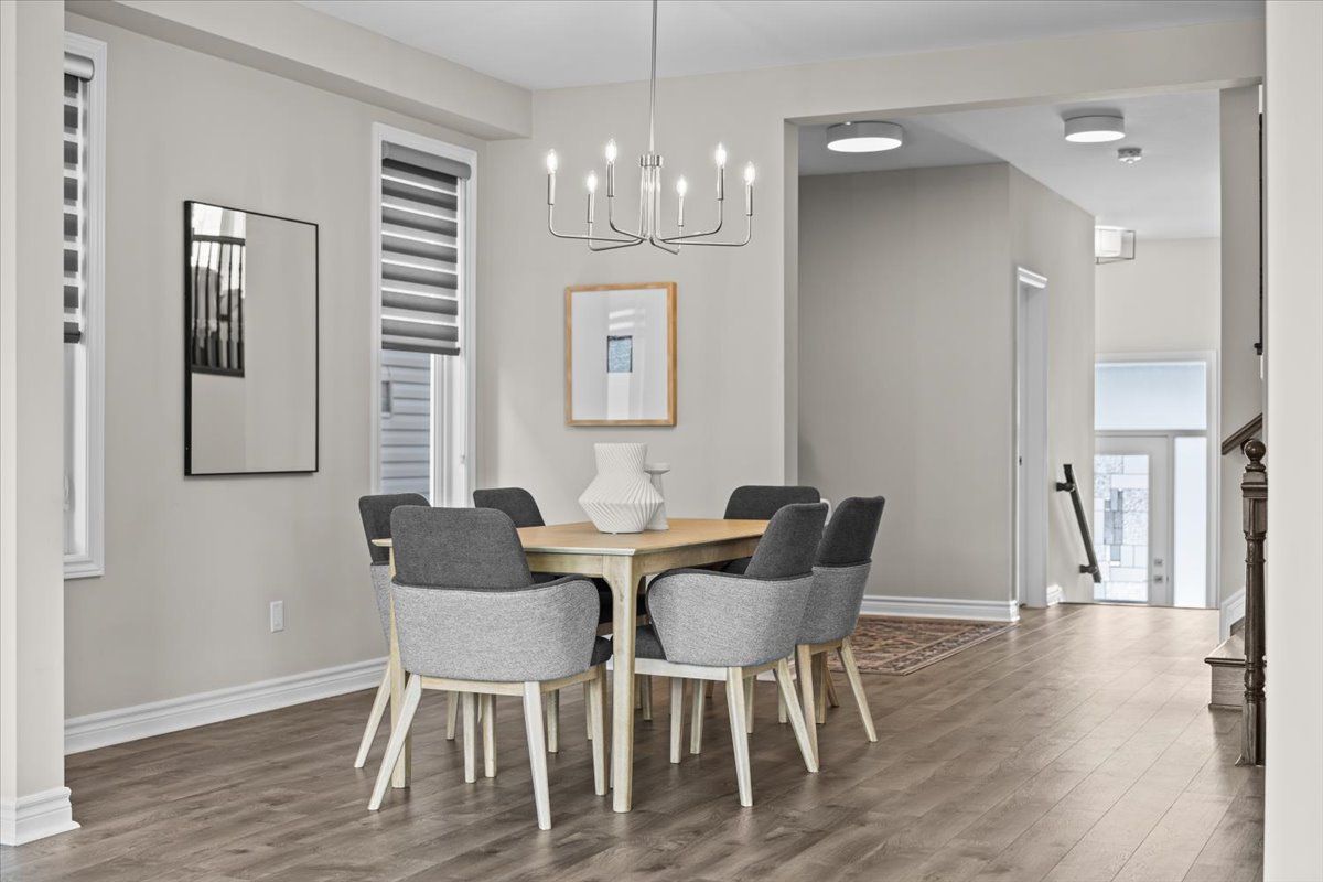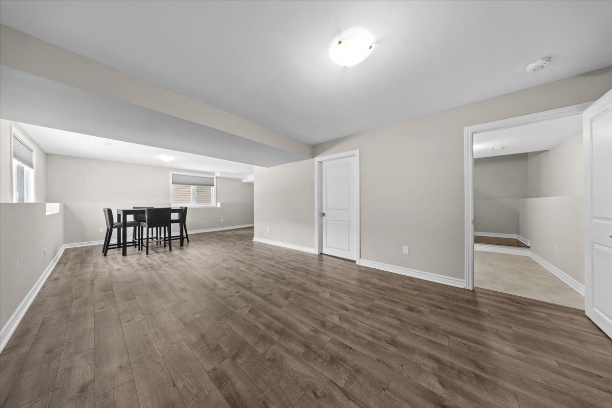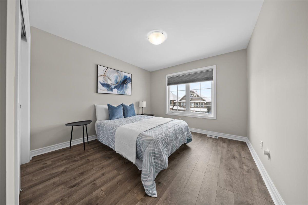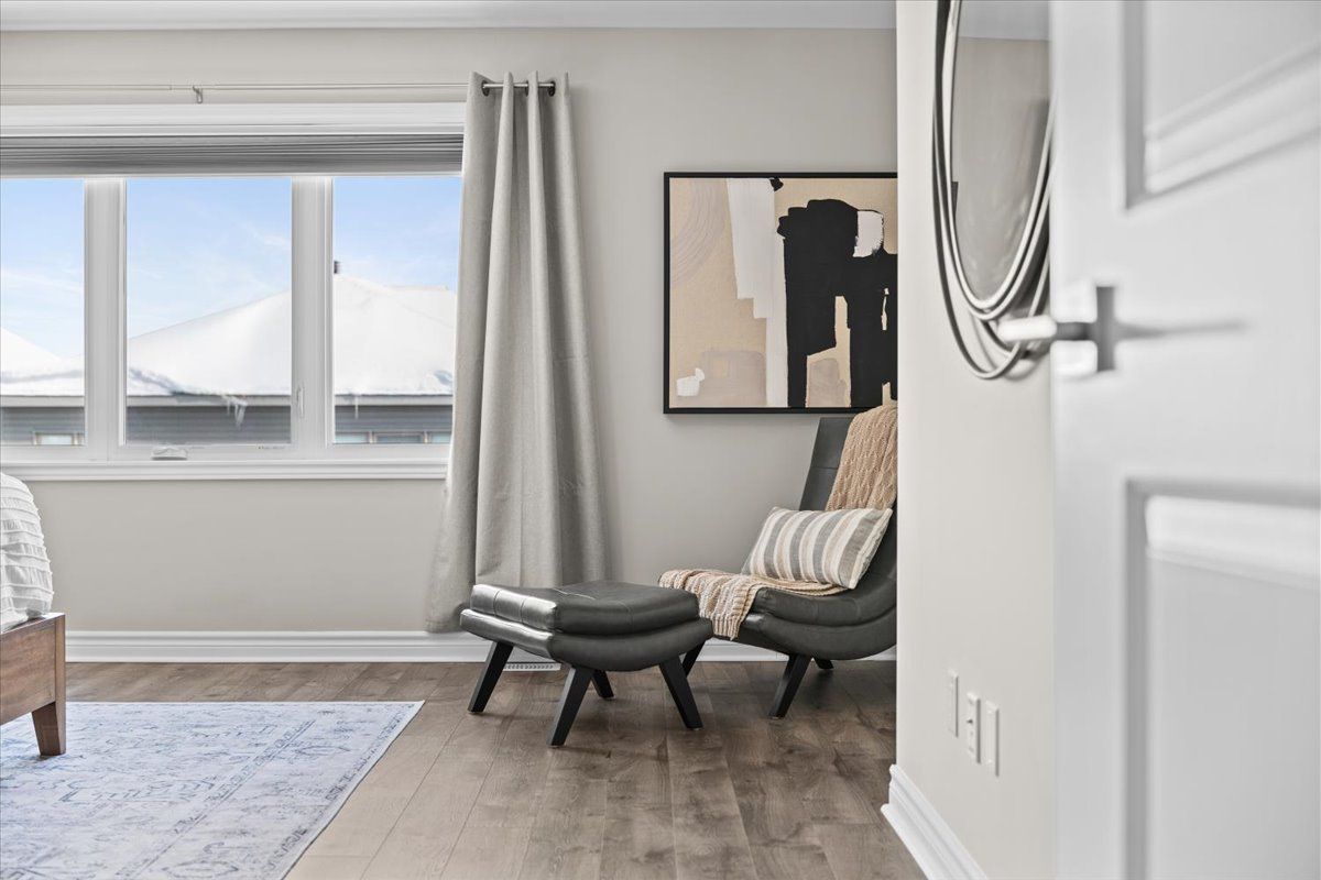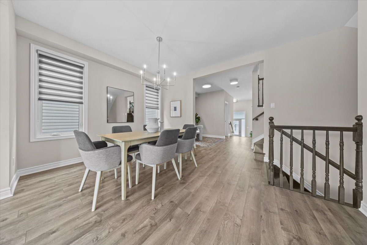 Well-designed home with a functional layout and quality finishes throughout. Covered front porch with arched entry leads to a tiled foyer with double-door closet and a grand front door with sidelights and transom windows. Hardwood staircase to the main level featuring pre-engineered hardwood flooring, 9-foot ceilings, powder room, and an open nook suitable for an office or play space. Formal dining area flows into the living room and kitchen with clear front-to-back sightlines. Kitchen includes an extended centre island with seating for four, quartz countertops, stainless steel appliances, floor-to-ceiling cabinetry, two pantry walls, two-tone cabinets, tiled backsplash, pot lights, and ample storage. Upper level offers a landing-style family room with gas fireplace and floor-to-ceiling stone feature, european-style balcony, and high ceilings. 3 bdrm + laundry room, and linen storage. Primary bedroom with rear-facing window, walk-in closet, and ensuite featuring a glass shower, soaker tub, and large vanity. Finished lower level with two oversized egress windows, full four-piece bathroom, recreation space, storage, mudroom, and direct access to the double car garage. Low-maintenance backyard with pvc deck, fencing, and turf grass. Colonial-style baseboards throughout. Steps away from pond, trails, schools, parks and amenities.