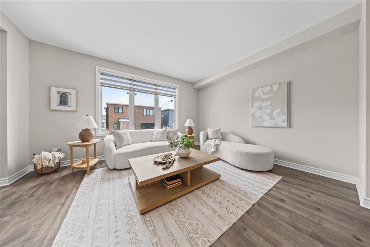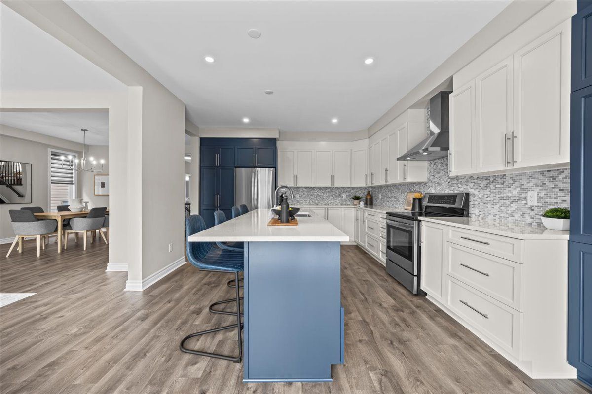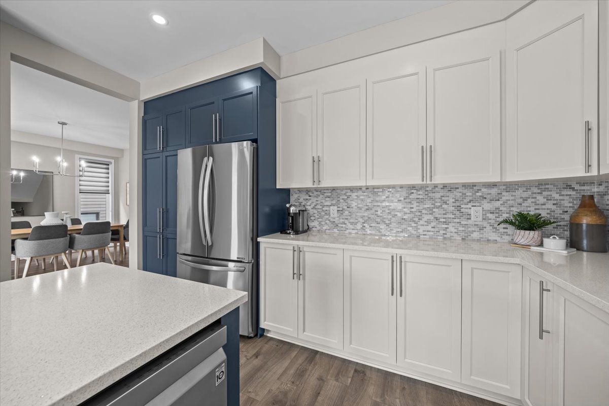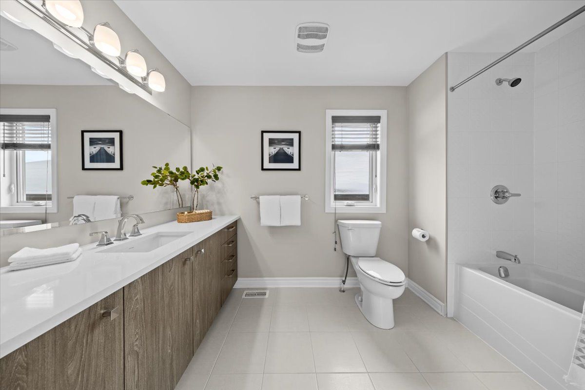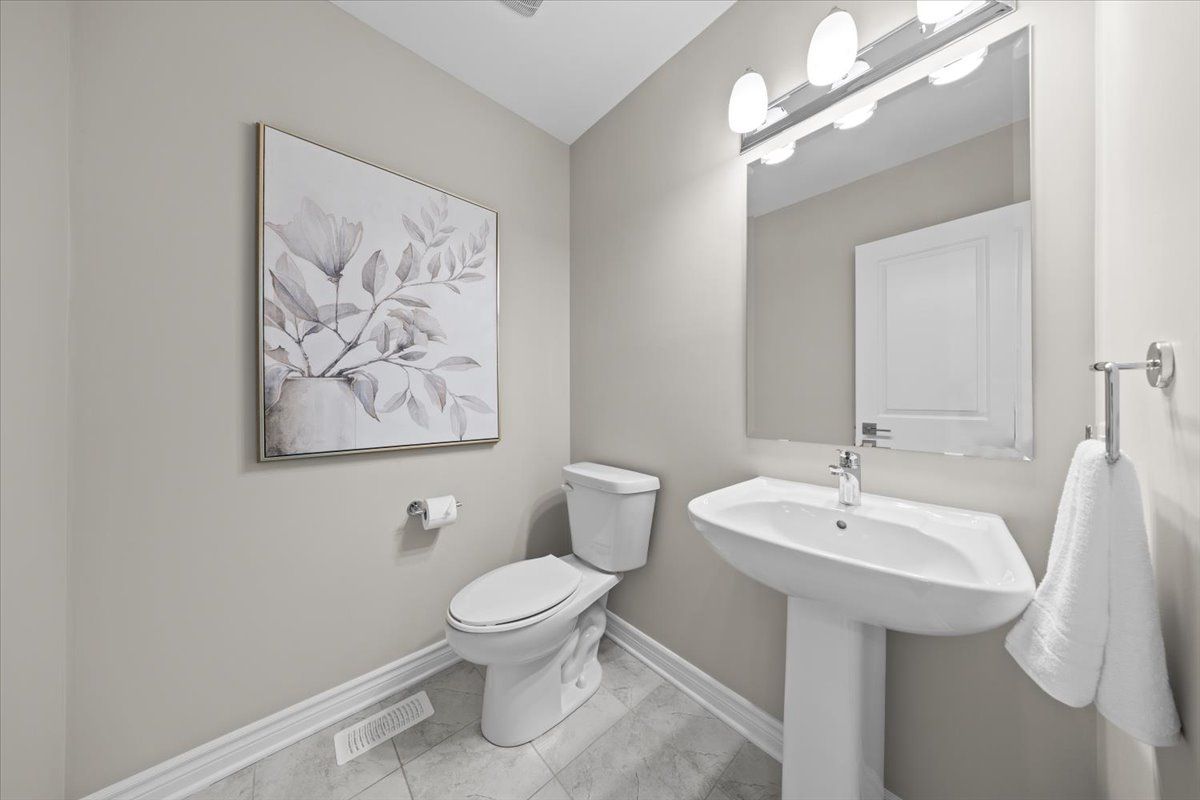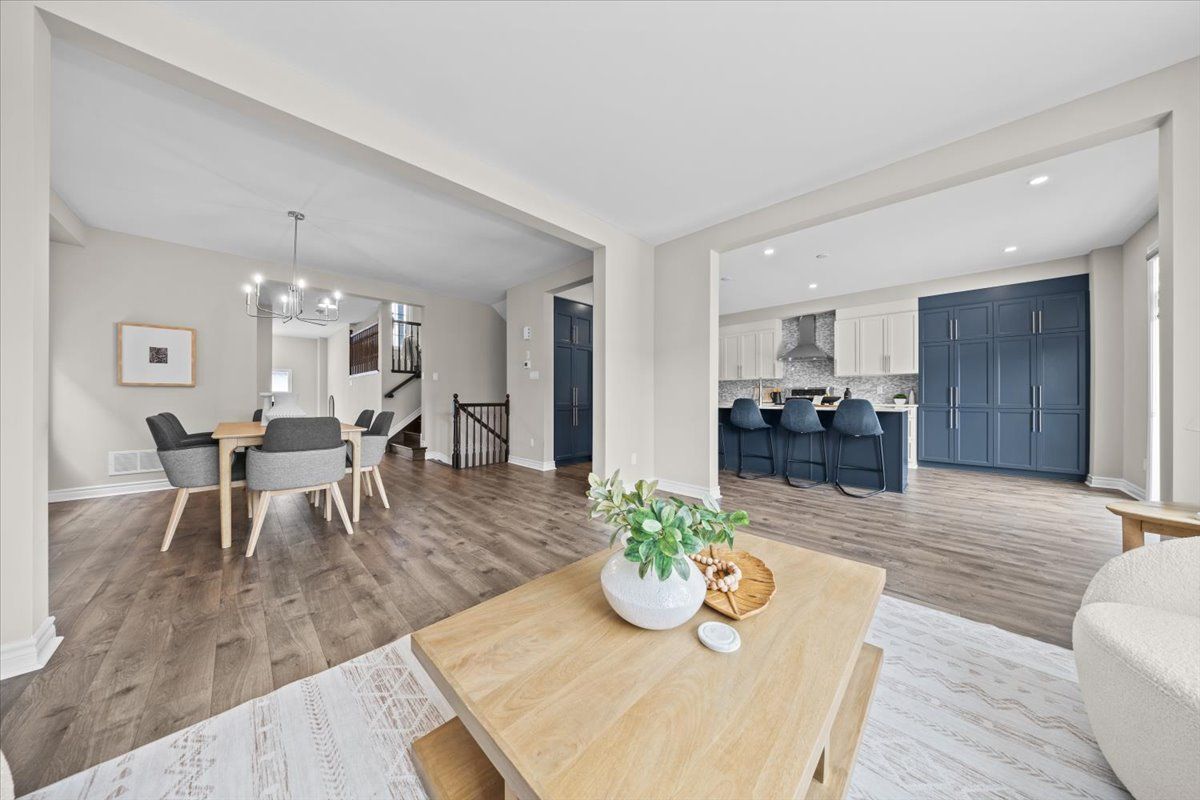 Well-designed home with a functional layout and quality finishes throughout. Covered front porch with arched entry leads to a tiled foyer with double-door closet and a grand front door with sidelights and transom windows. Hardwood staircase to the main level featuring pre-engineered hardwood flooring, 9-foot ceilings, powder room, and an open nook suitable for an office or play space. Formal dining area flows into the living room and kitchen with clear front-to-back sightlines. Kitchen includes an extended centre island with seating for four, quartz countertops, stainless steel appliances, floor-to-ceiling cabinetry, two pantry walls, two-tone cabinets, tiled backsplash, pot lights, and ample storage. Upper level offers a landing-style family room with gas fireplace and floor-to-ceiling stone feature, european-style balcony, and high ceilings. 3 bdrm + laundry room, and linen storage. Primary bedroom with rear-facing window, walk-in closet, and ensuite featuring a glass shower, soaker tub, and large vanity. Finished lower level with two oversized egress windows, full four-piece bathroom, recreation space, storage, mudroom, and direct access to the double car garage. Low-maintenance backyard with pvc deck, fencing, and turf grass. Colonial-style baseboards throughout. Steps away from pond, trails, schools, parks and amenities.