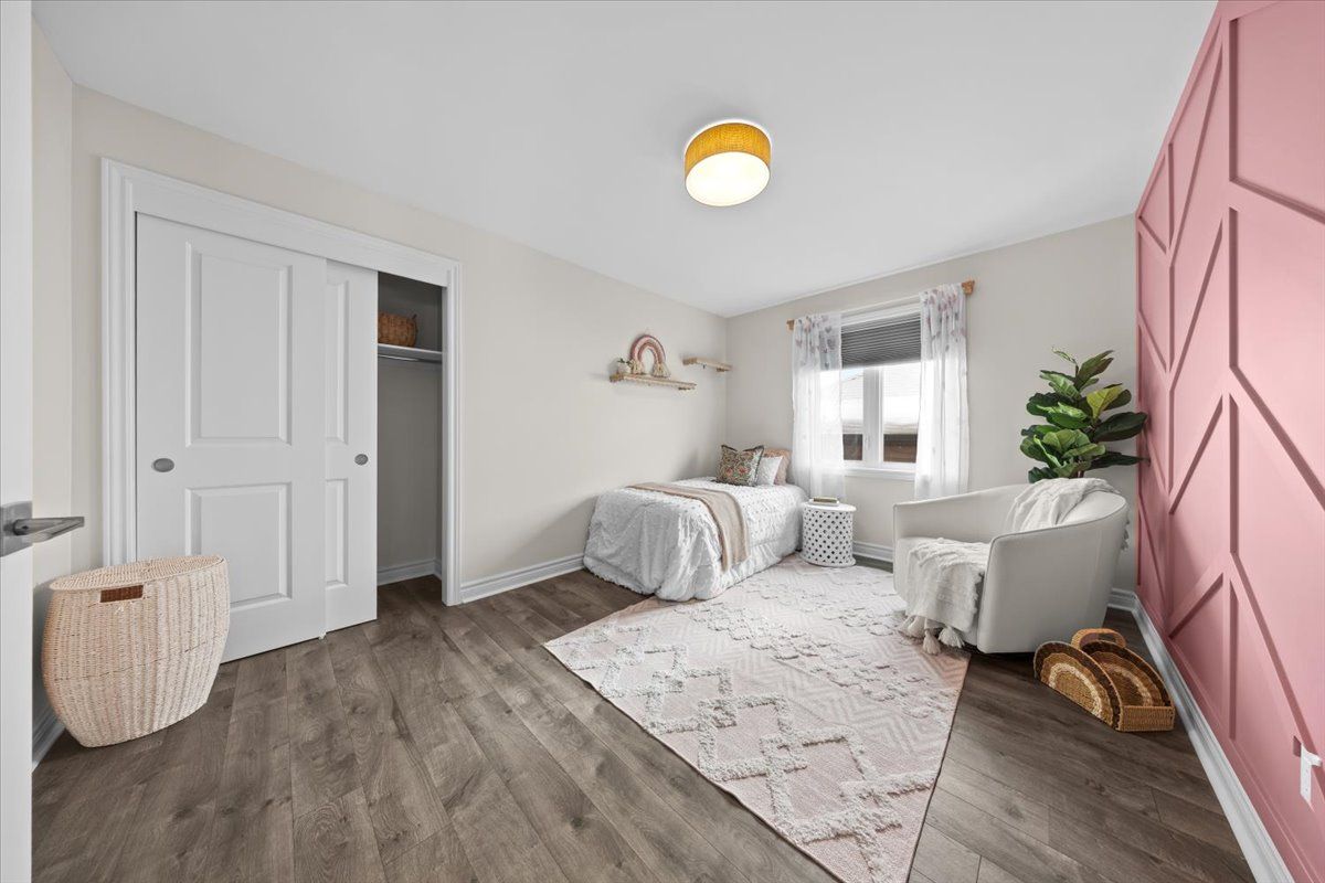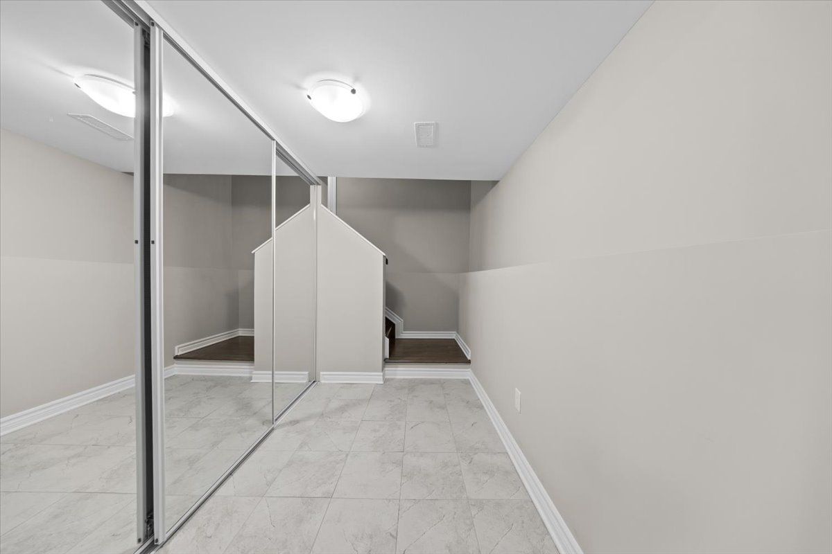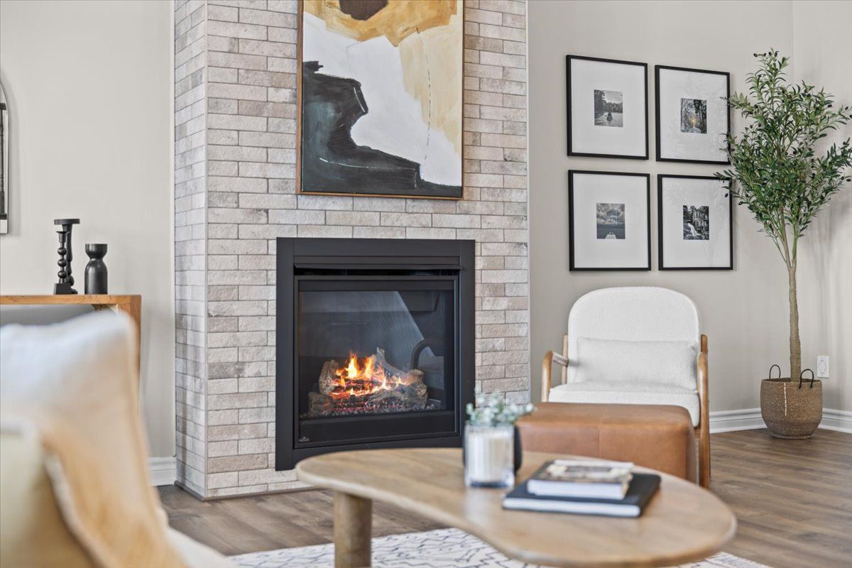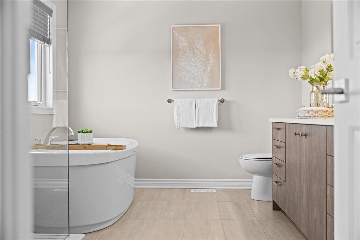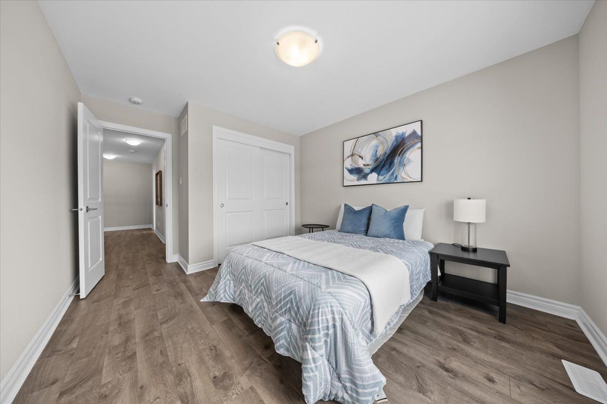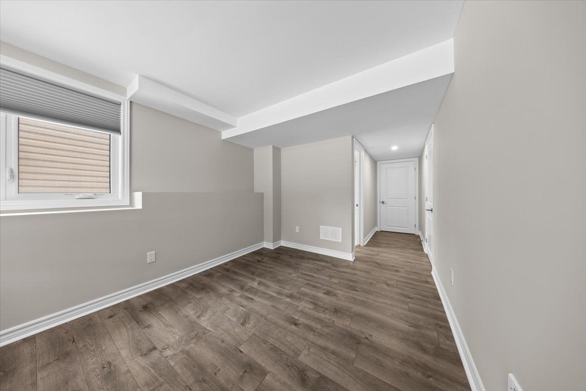 Well-designed home with a functional layout and quality finishes throughout. Covered front porch with arched entry leads to a tiled foyer with double-door closet and a grand front door with sidelights and transom windows. Hardwood staircase to the main level featuring pre-engineered hardwood flooring, 9-foot ceilings, powder room, and an open nook suitable for an office or play space. Formal dining area flows into the living room and kitchen with clear front-to-back sightlines. Kitchen includes an extended centre island with seating for four, quartz countertops, stainless steel appliances, floor-to-ceiling cabinetry, two pantry walls, two-tone cabinets, tiled backsplash, pot lights, and ample storage. Upper level offers a landing-style family room with gas fireplace and floor-to-ceiling stone feature, european-style balcony, and high ceilings. 3 bdrm + laundry room, and linen storage. Primary bedroom with rear-facing window, walk-in closet, and ensuite featuring a glass shower, soaker tub, and large vanity. Finished lower level with two oversized egress windows, full four-piece bathroom, recreation space, storage, mudroom, and direct access to the double car garage. Low-maintenance backyard with pvc deck, fencing, and turf grass. Colonial-style baseboards throughout. Steps away from pond, trails, schools, parks and amenities.