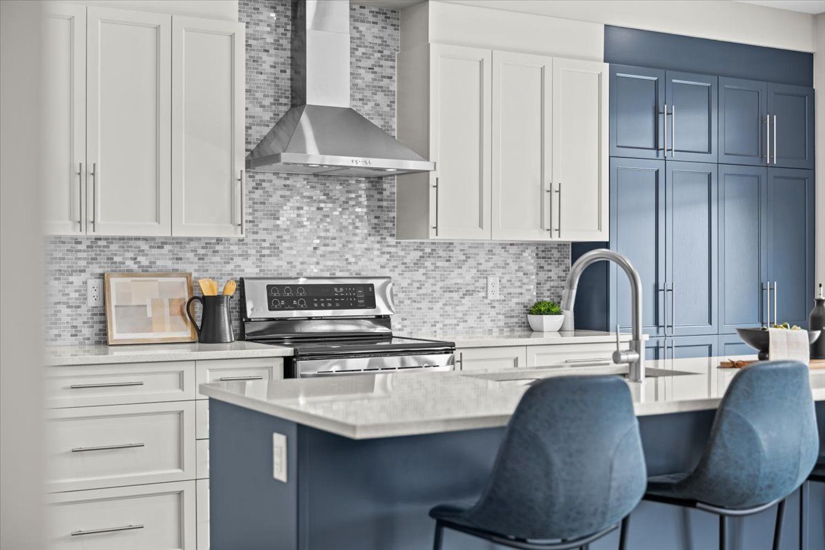 • Open kitchen with quartz countertops and seating for four at the island.