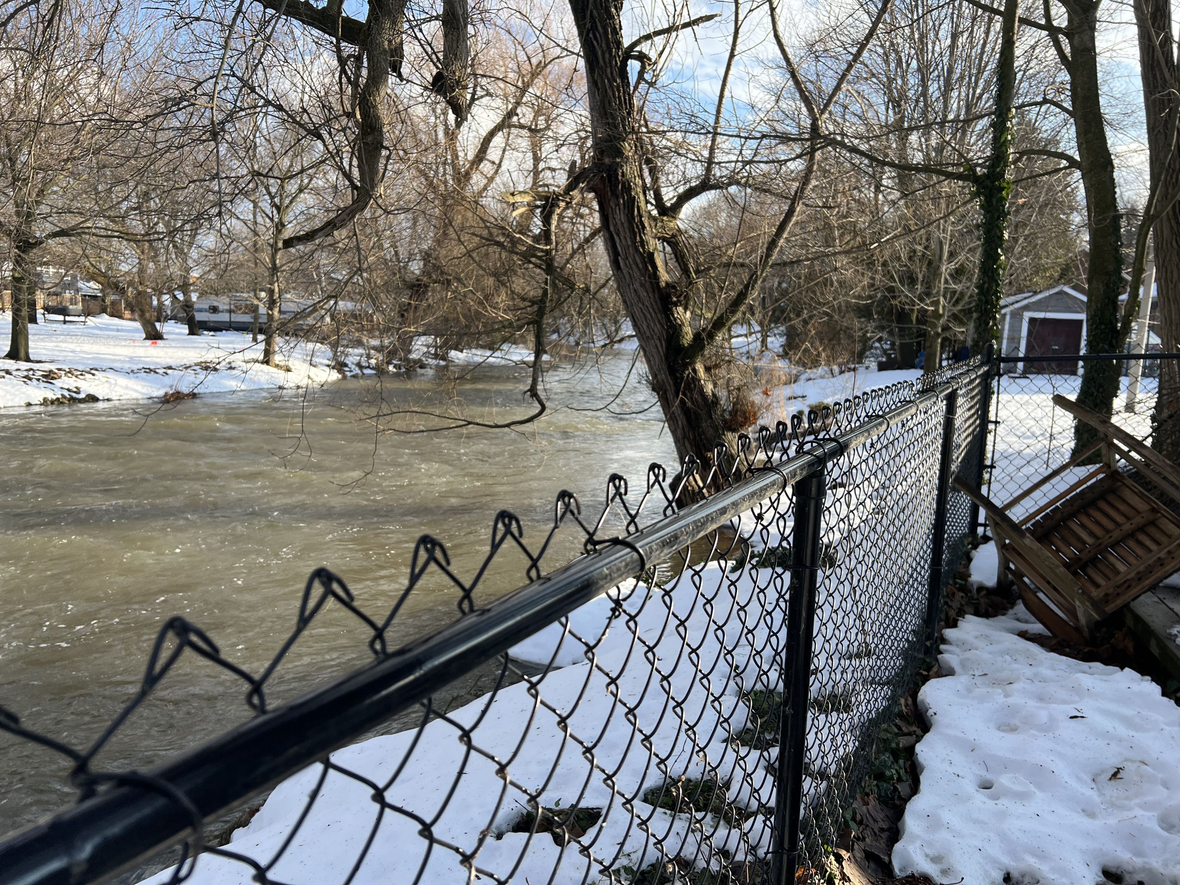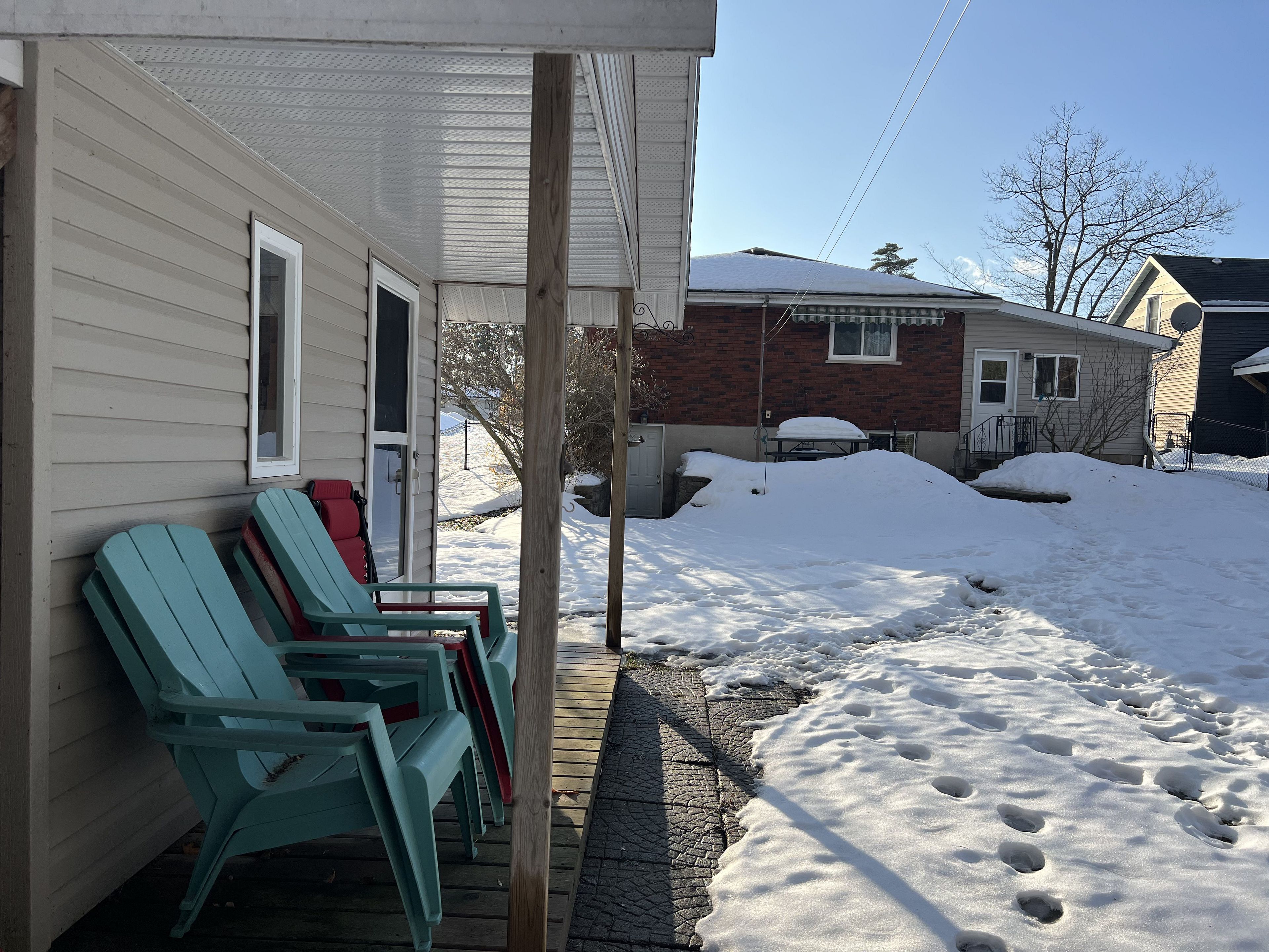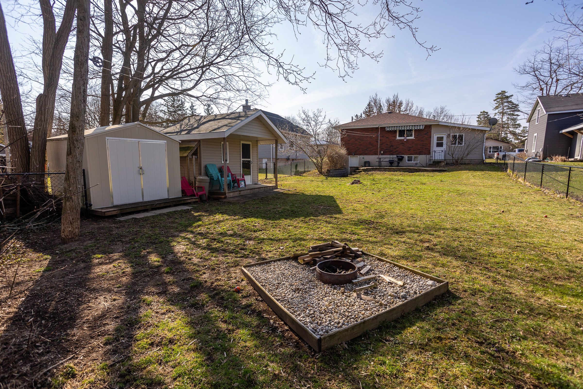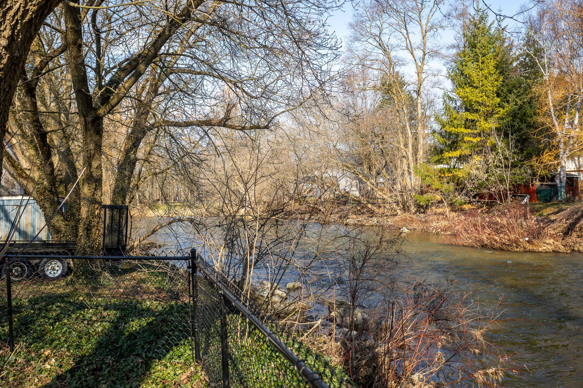 • Private fenced yard with stone patio and river views for outdoor enjoyment.