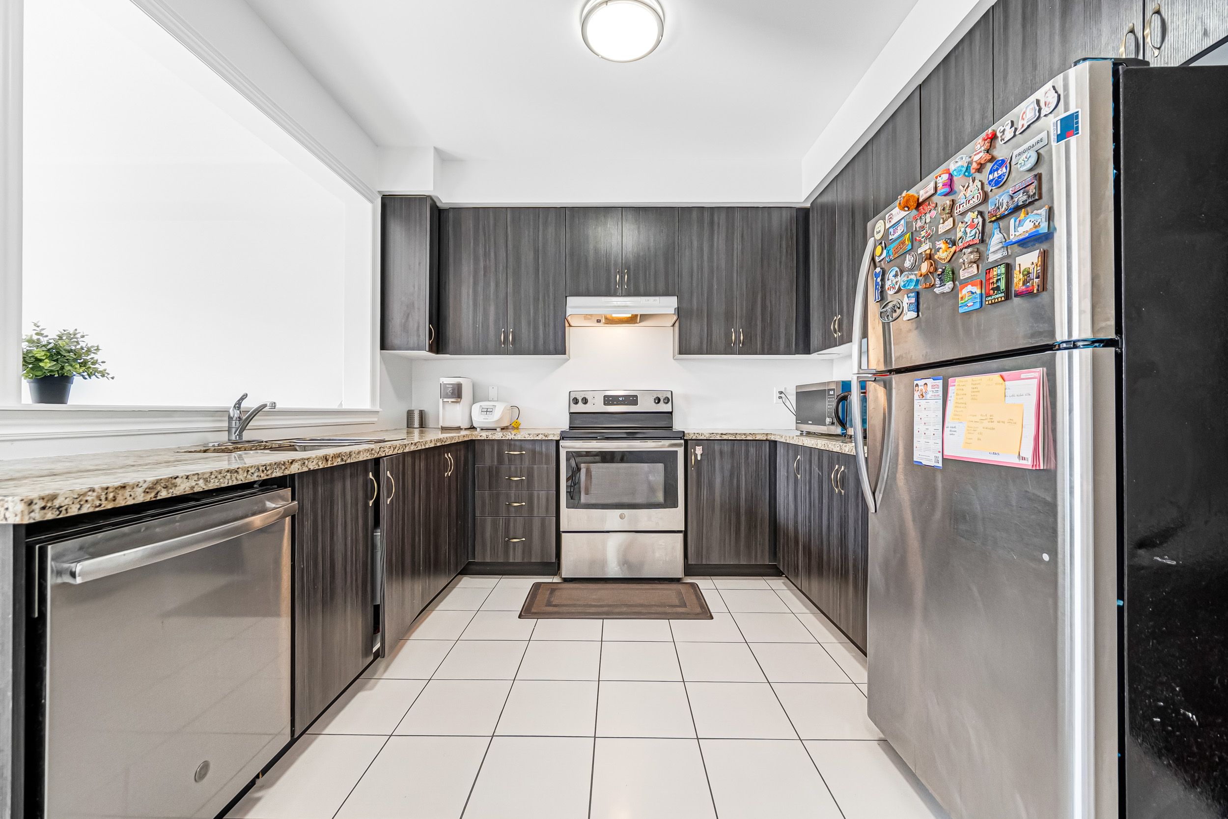 • Modern kitchen with stainless steel appliances and quartz countertops.