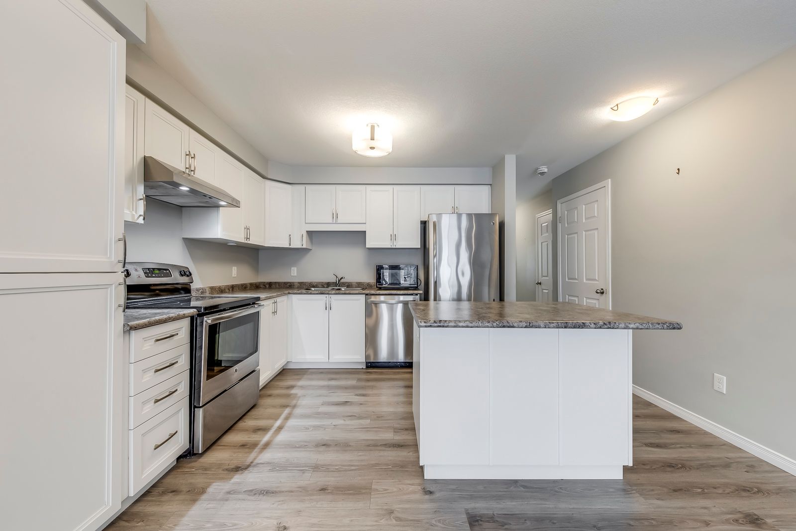 • Modern kitchen equipped with gorgeous granite countertop for entertaining.