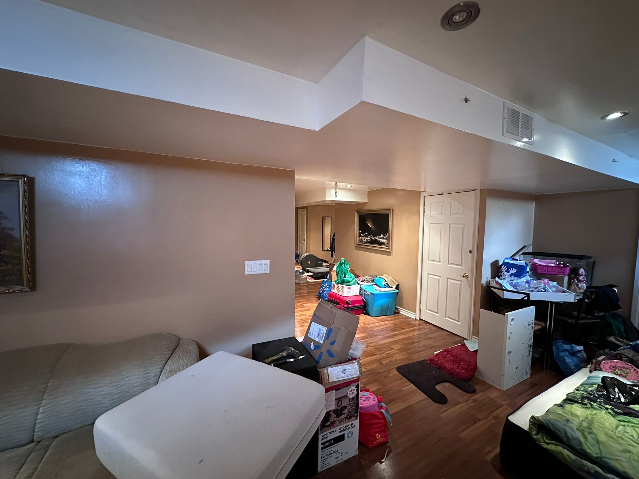 • Bright open-concept layout with a modern kitchen and laminate flooring.
