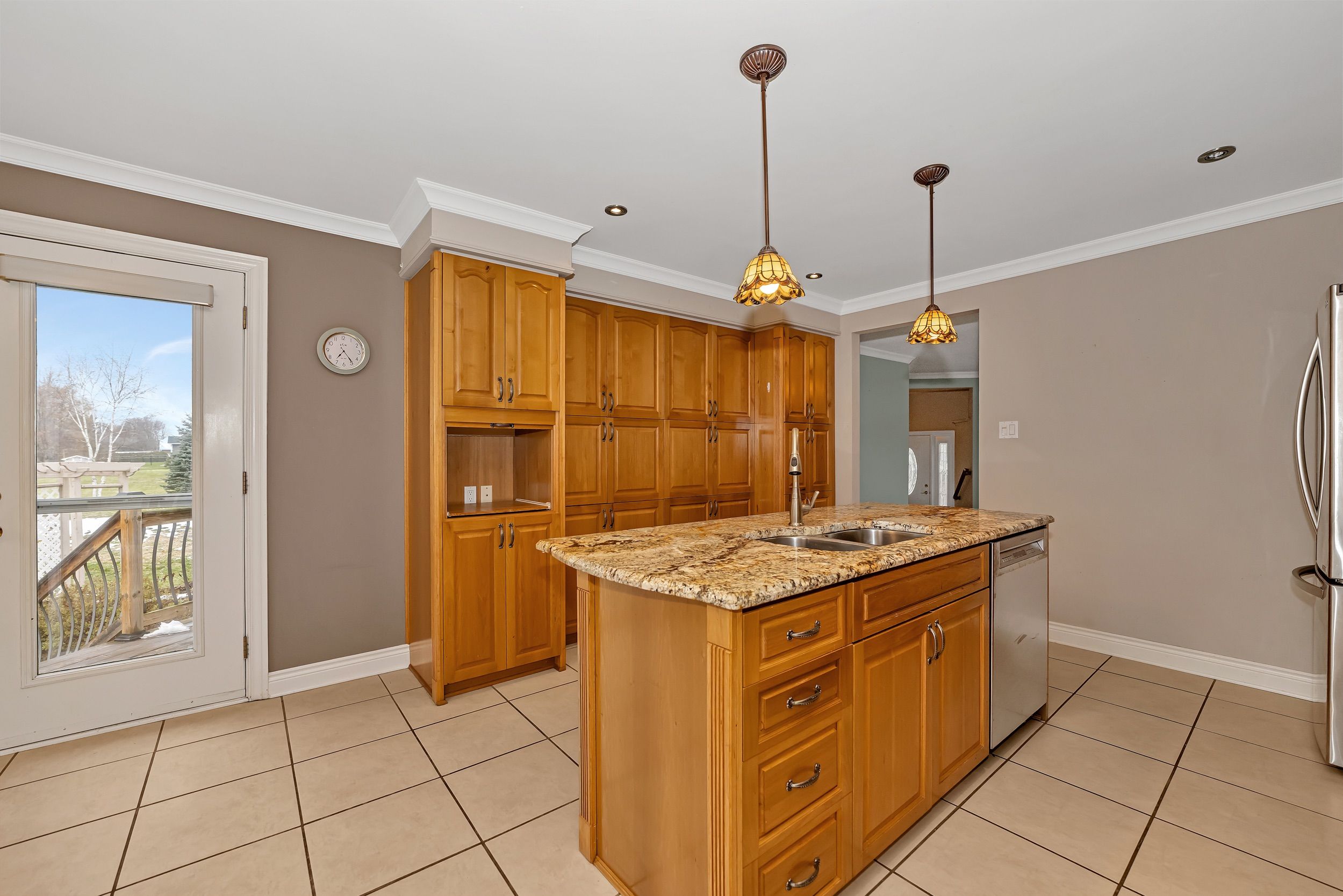 • Bright kitchen with granite island and updated stainless steel appliances.