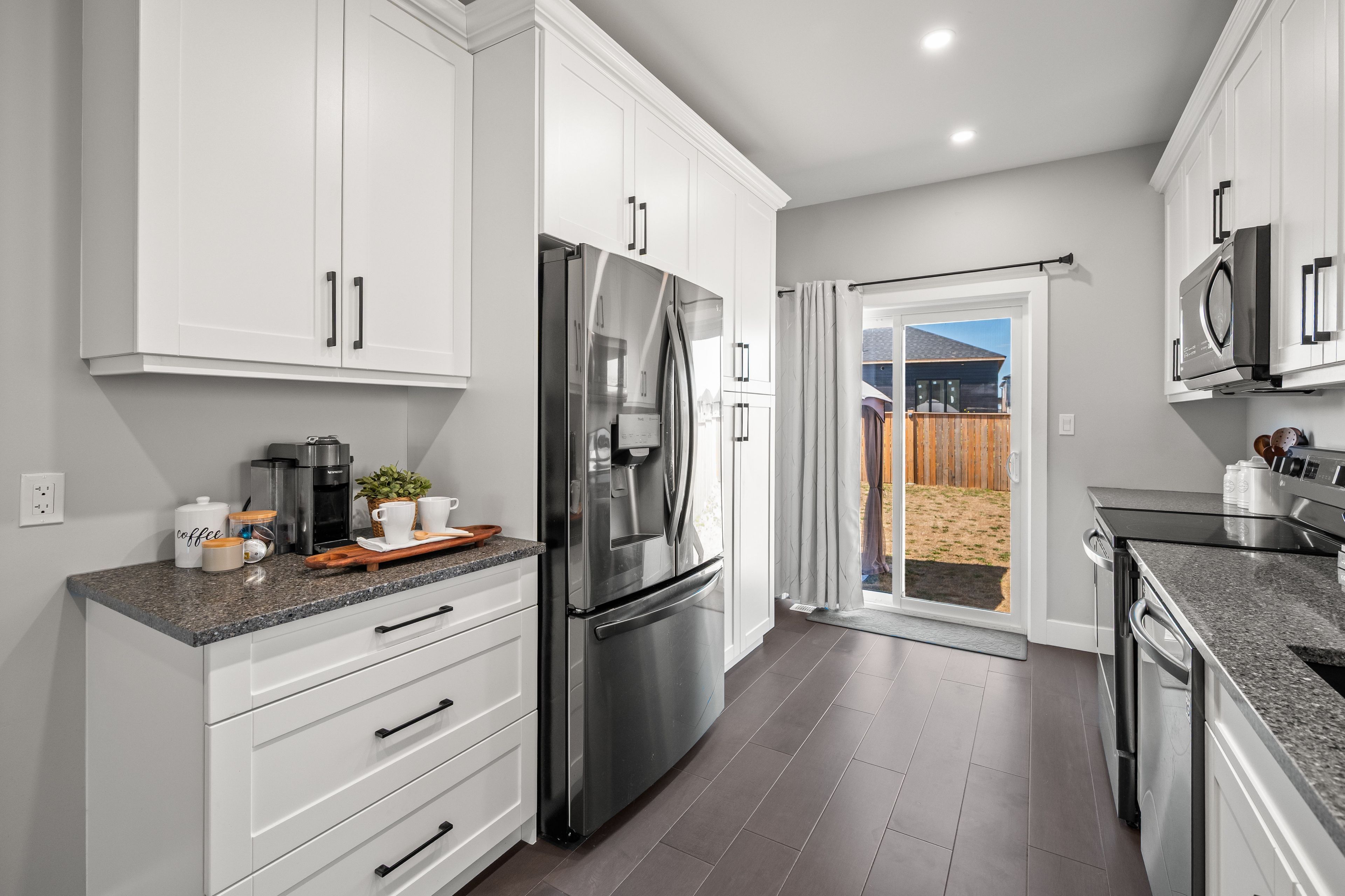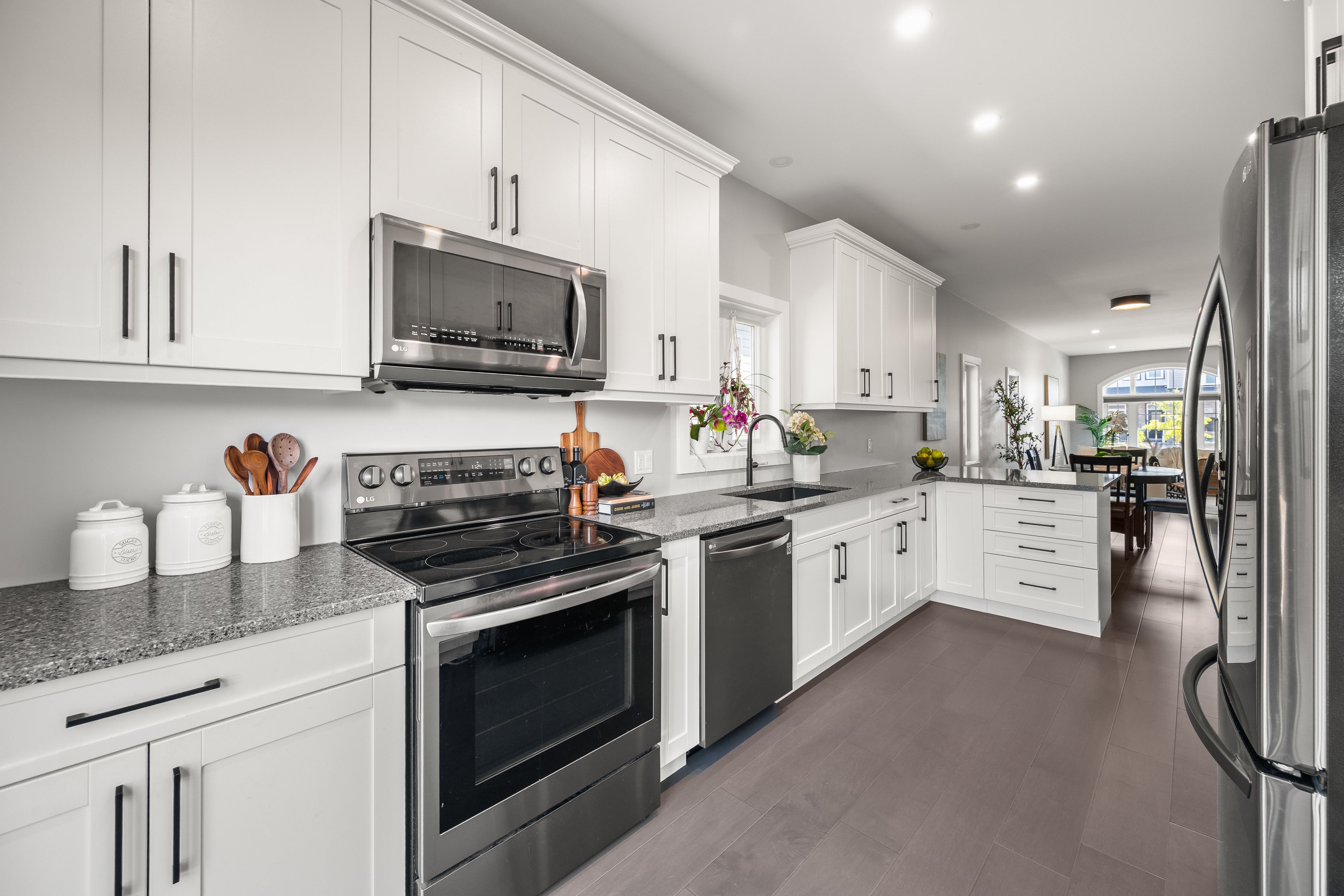 • Stunning custom kitchen features quartz countertops and a dine-up island.