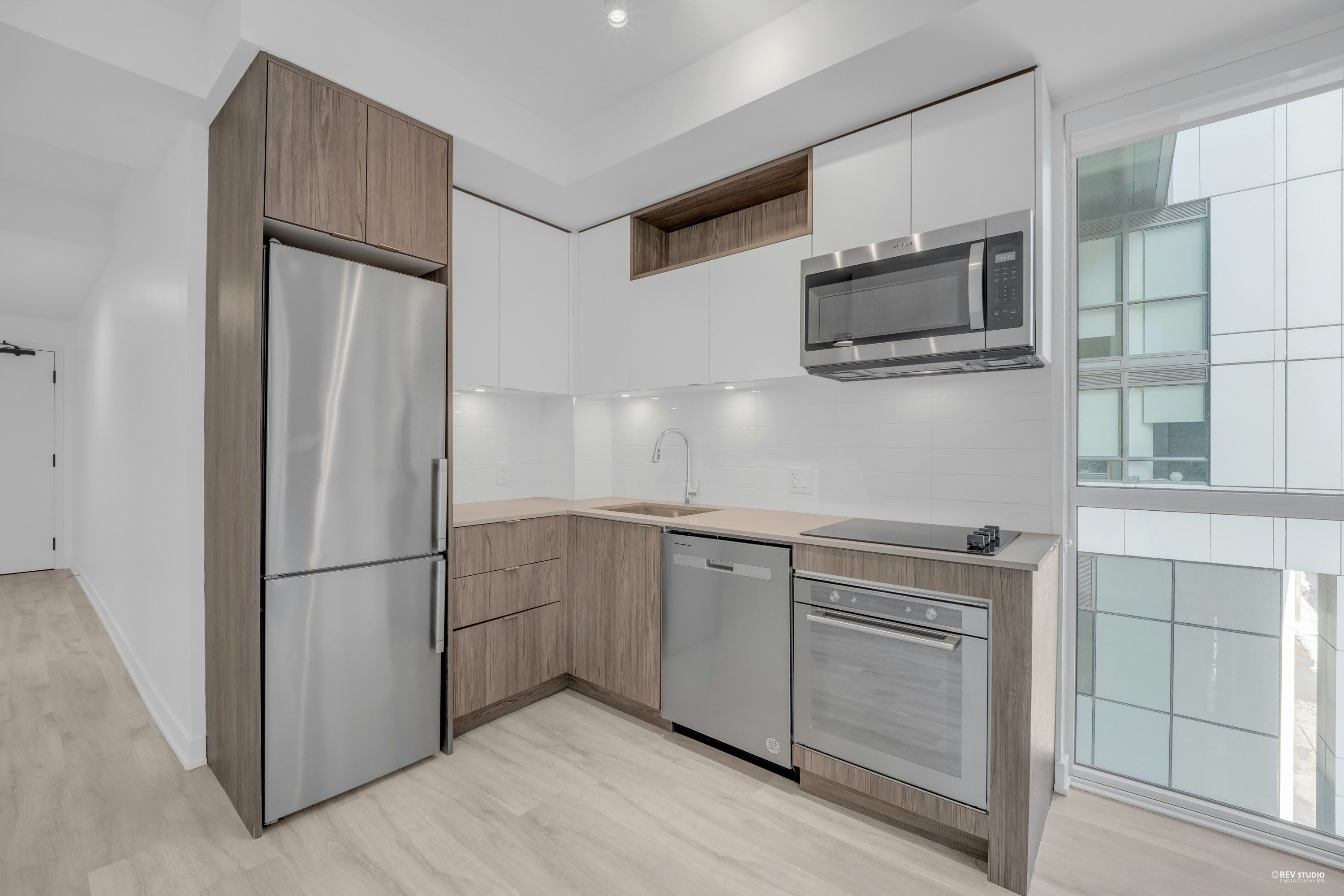 • Contemporary kitchen with high-end appliances for easy cooking.