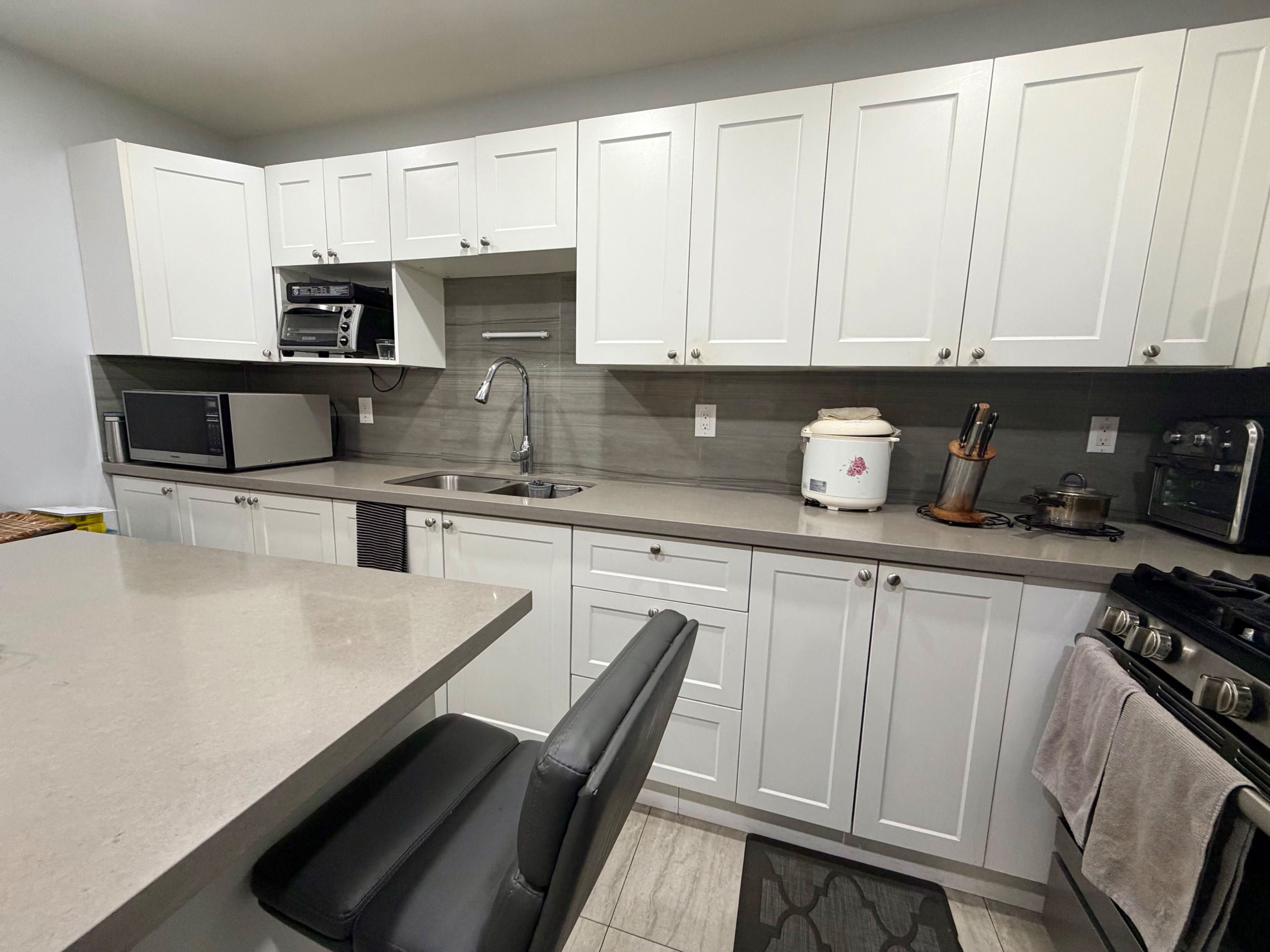 • Modern kitchen with granite island and stainless steel appliances.
