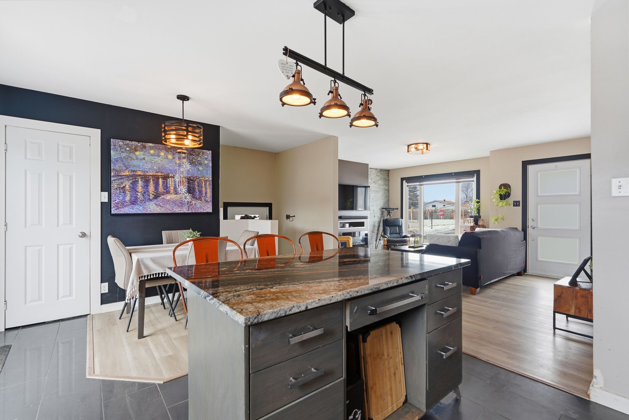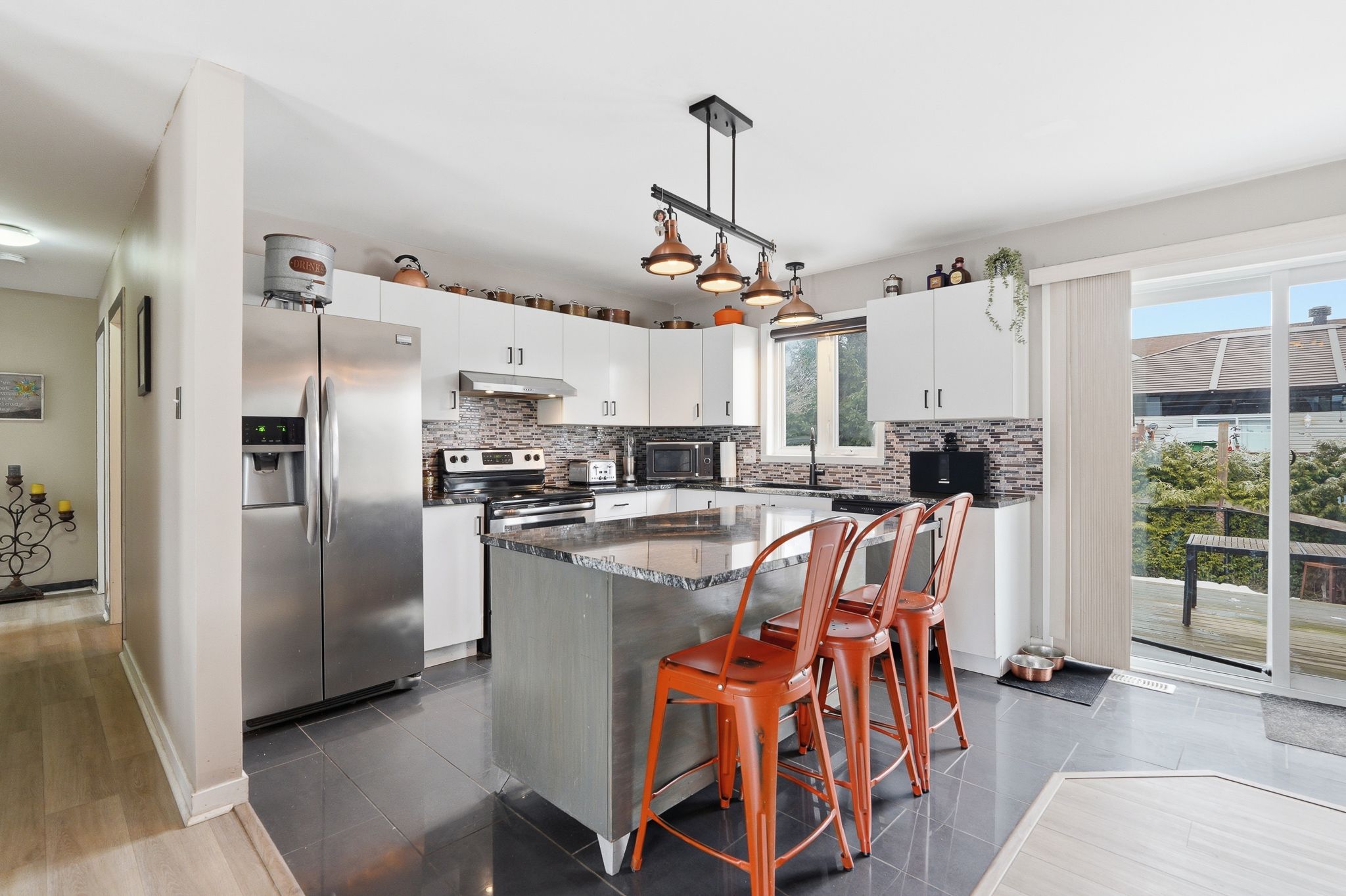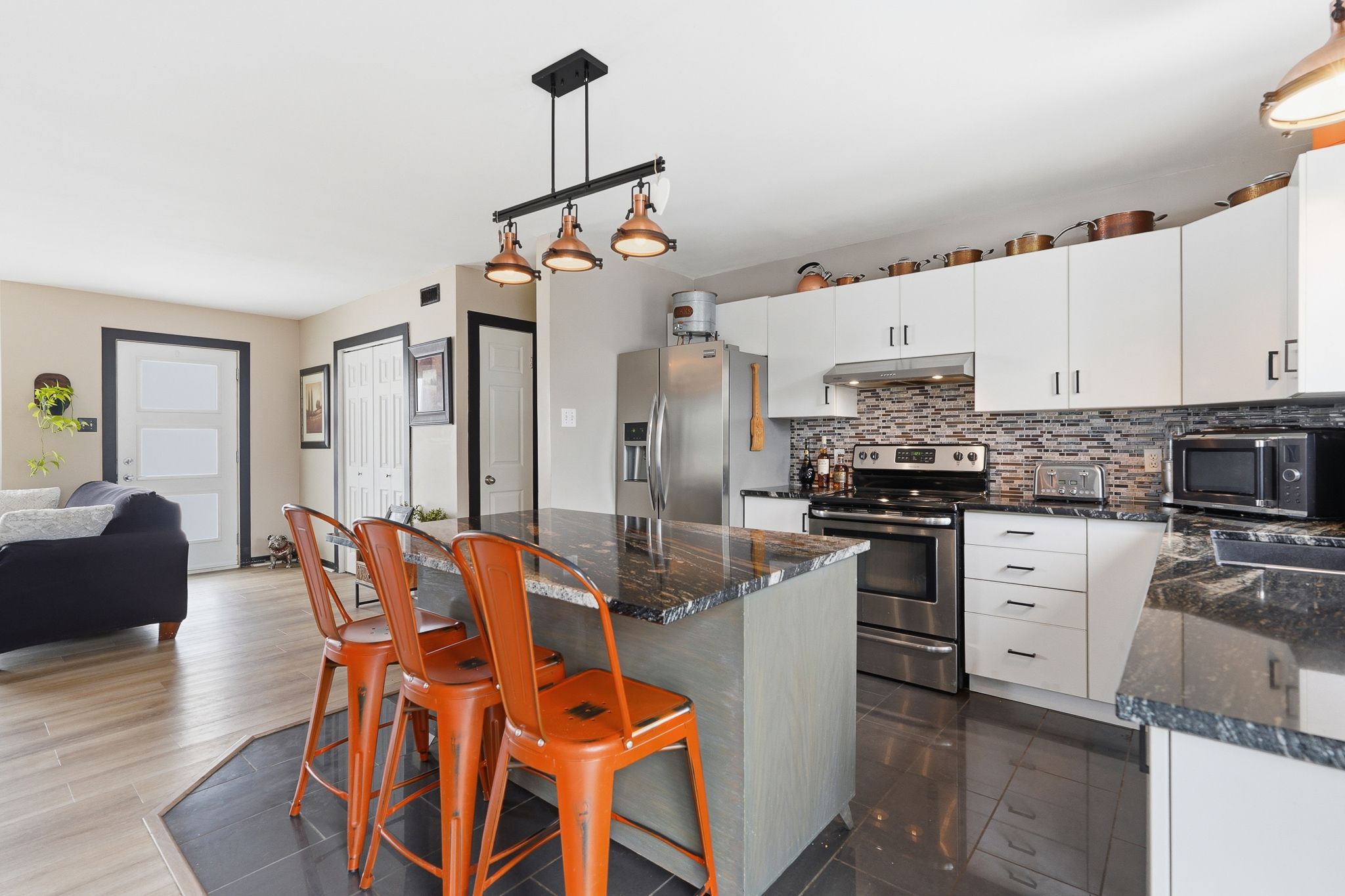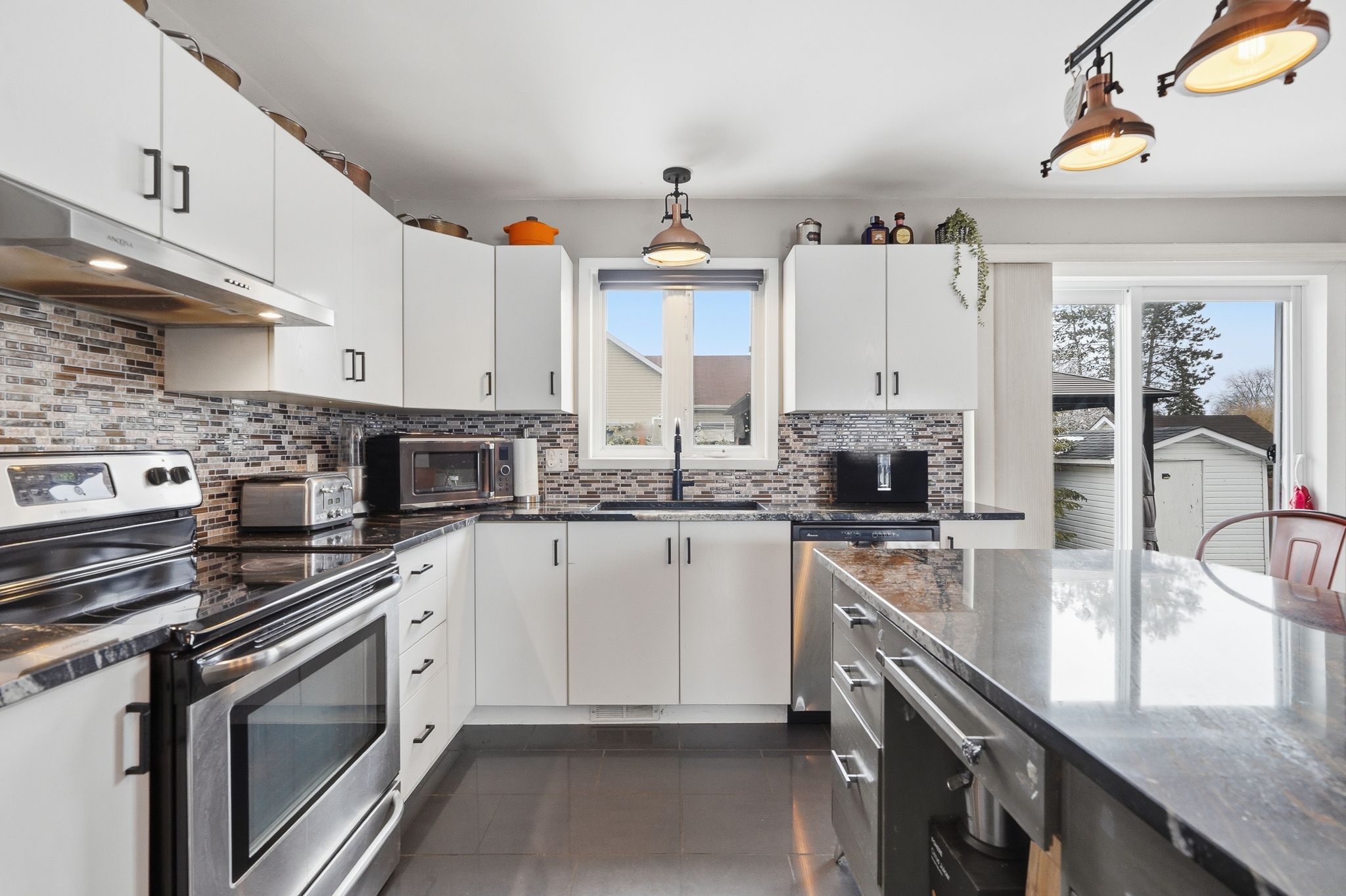 • Kitchen features granite countertops and ample cabinet space.
