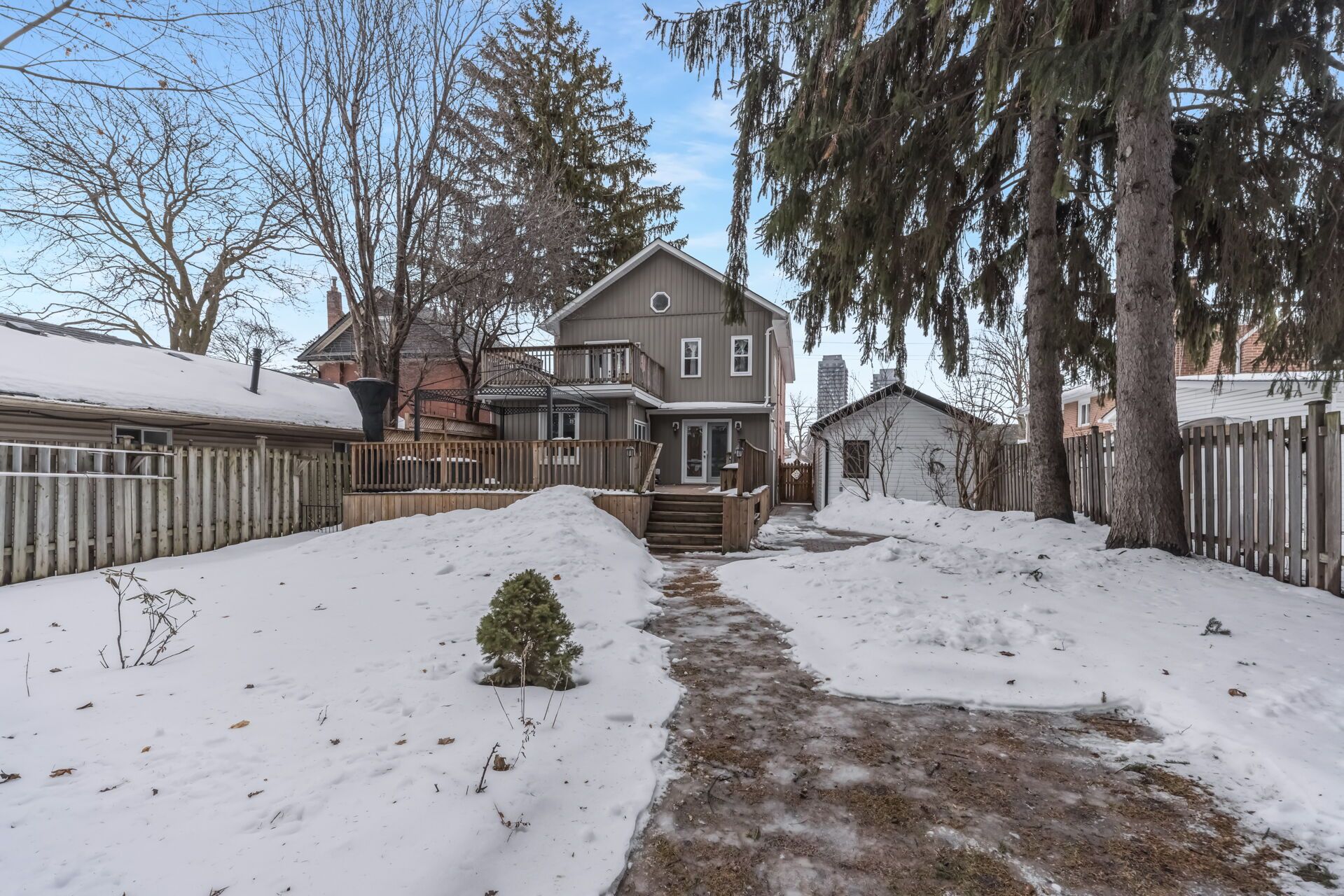 • Large, tree-lined yard with a multi-tiered deck and updated garage.