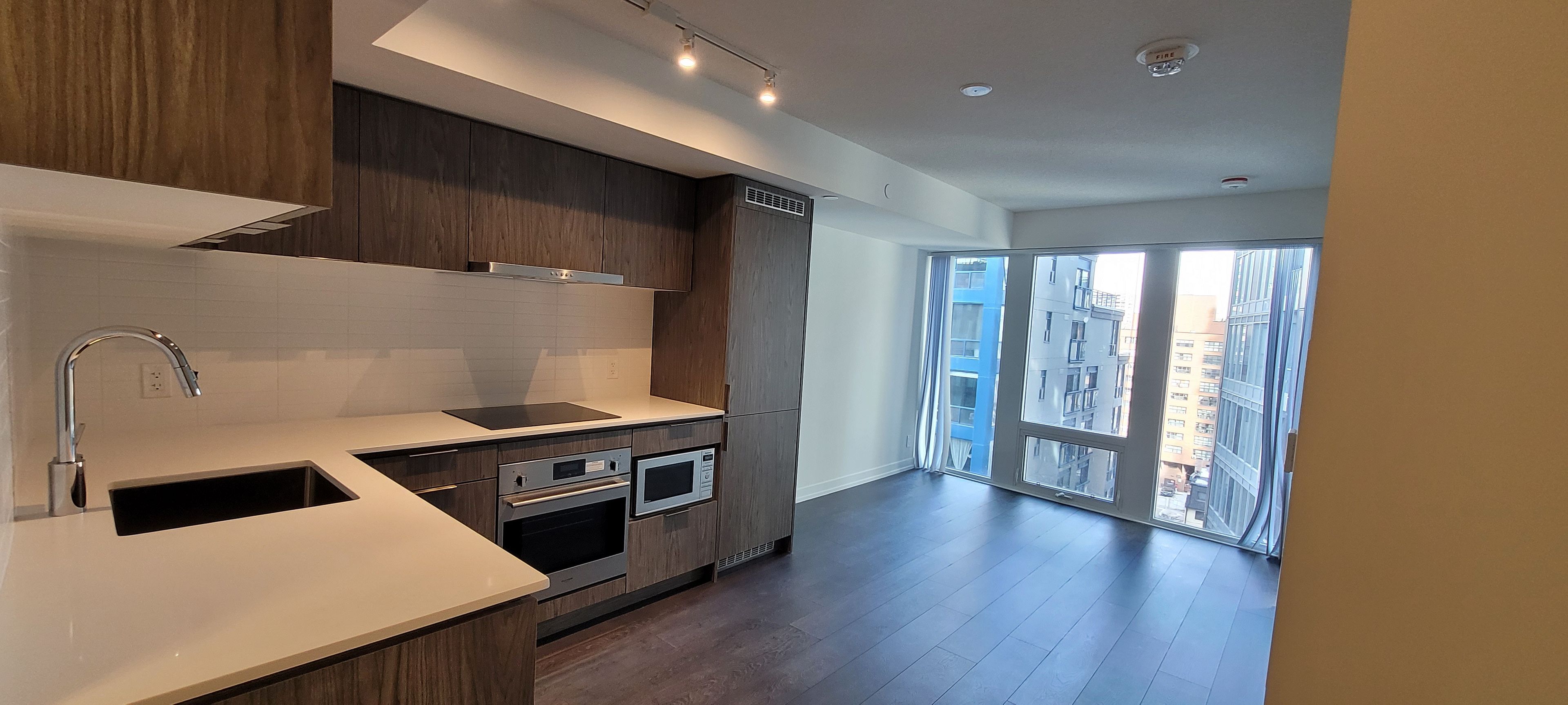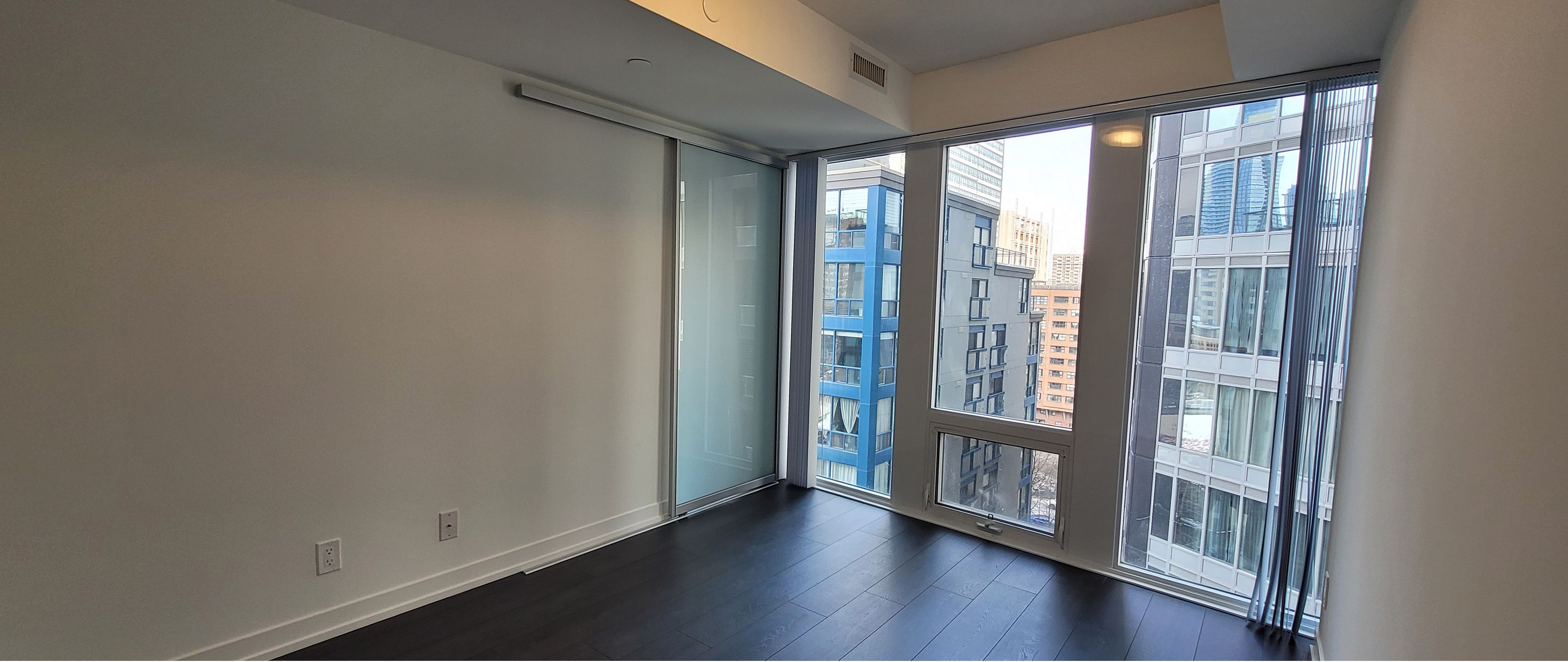 Fleur condo by menkes. Right beside st. Michael's cathedral basilica and hospital. Close to queen subway and ryerson university. 1 bed + 1 den. Den can be used as 2nd bedroom. Convenient l-shape kitchen with quartz countertop, ceramic tile backs plash and decorative track lighting. Glass sliding door to bedroom. Vertical blinds and closet shelves. Own locker conveniently located at the same level.