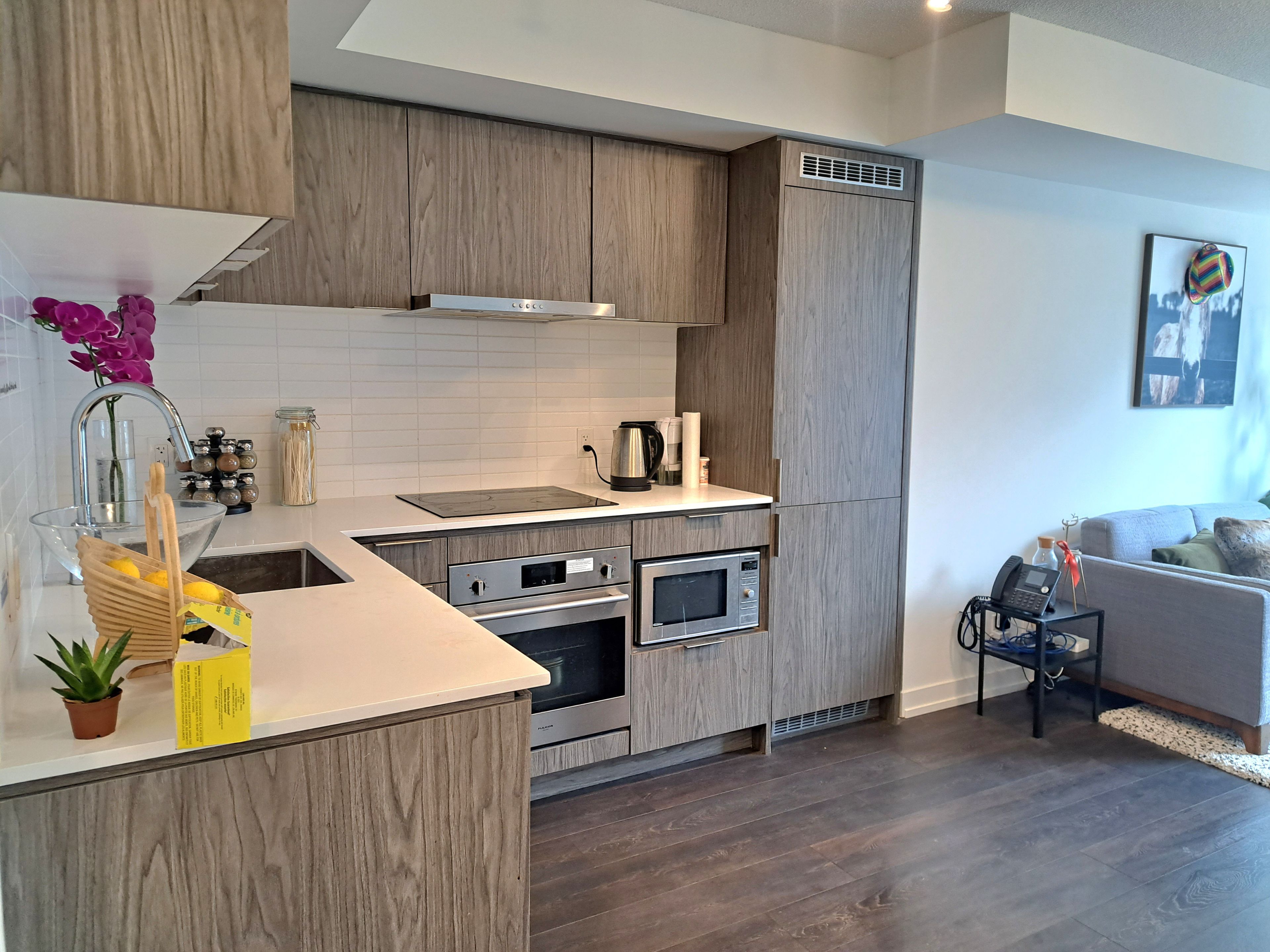 • Modern open-concept kitchen featuring built-in appliances.