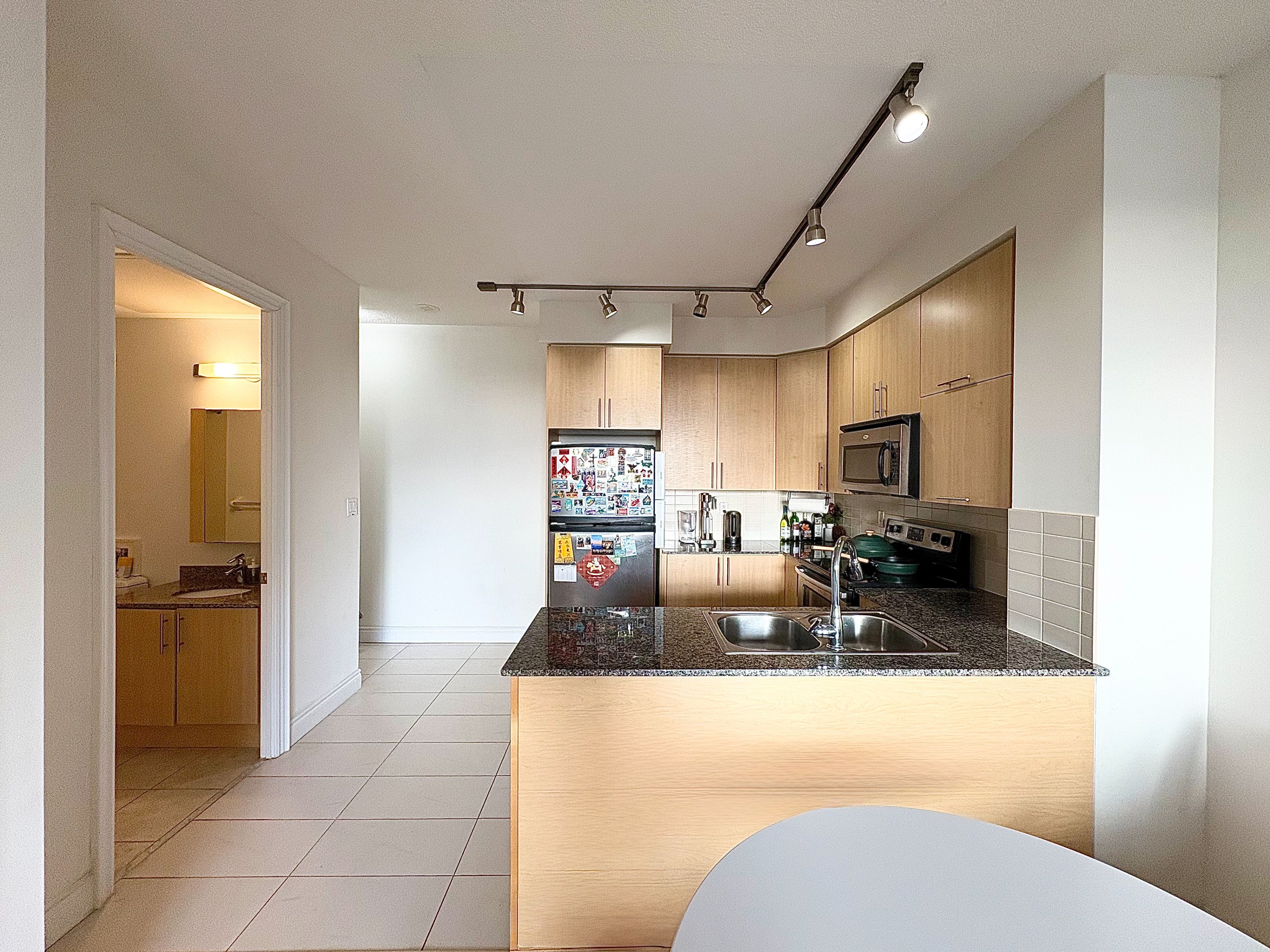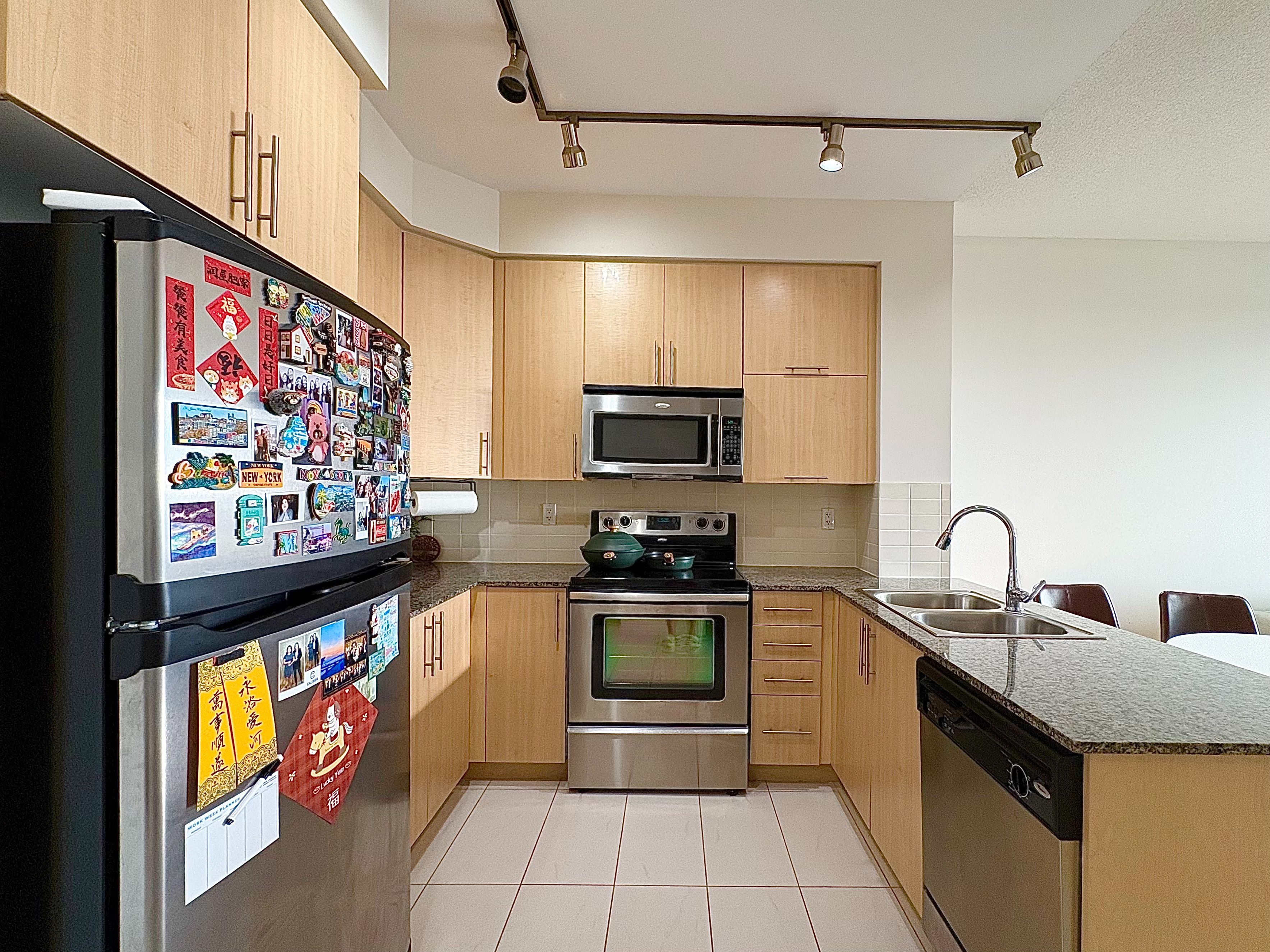 • Modern kitchen features granite counters and stainless appliances.