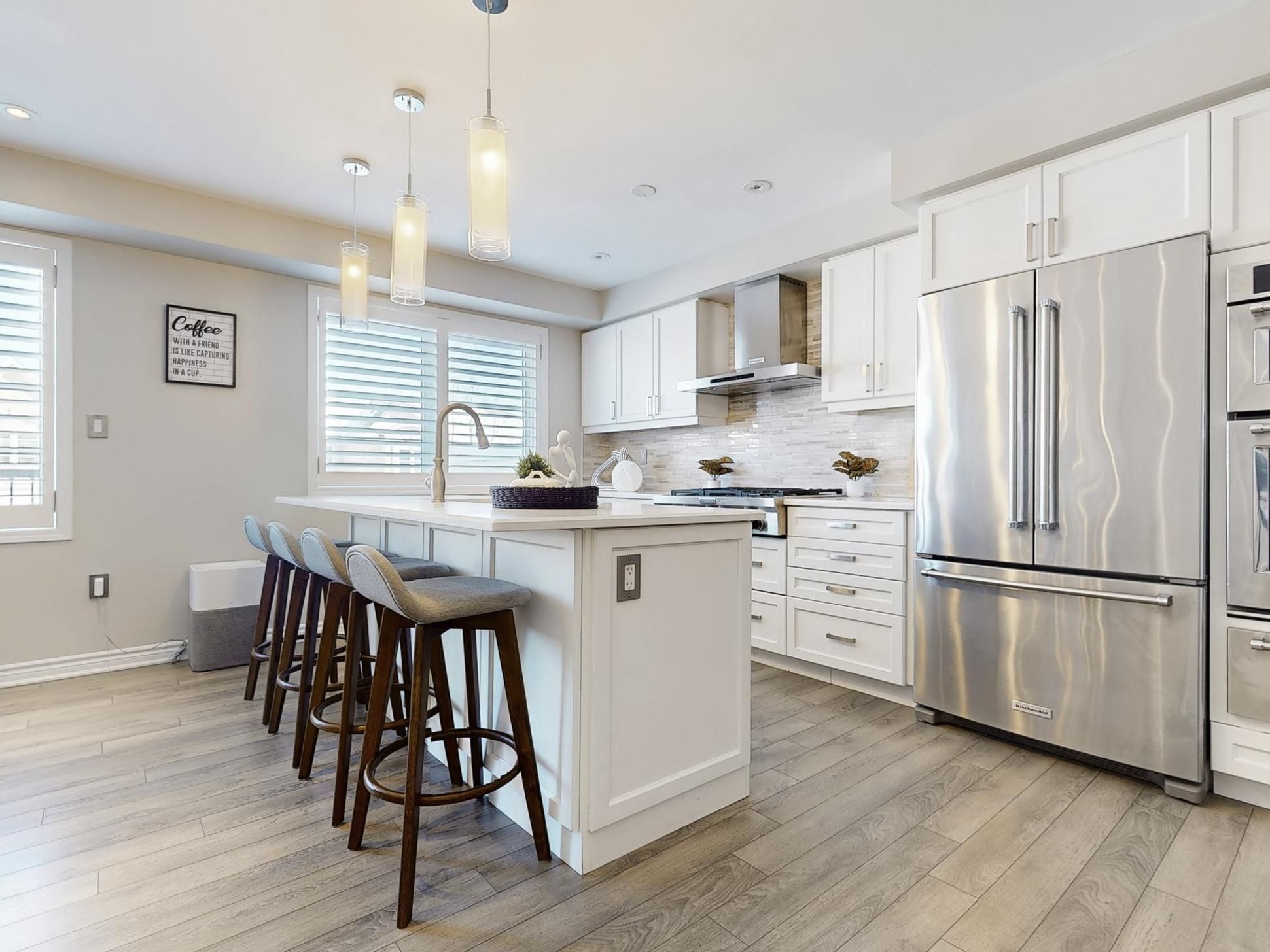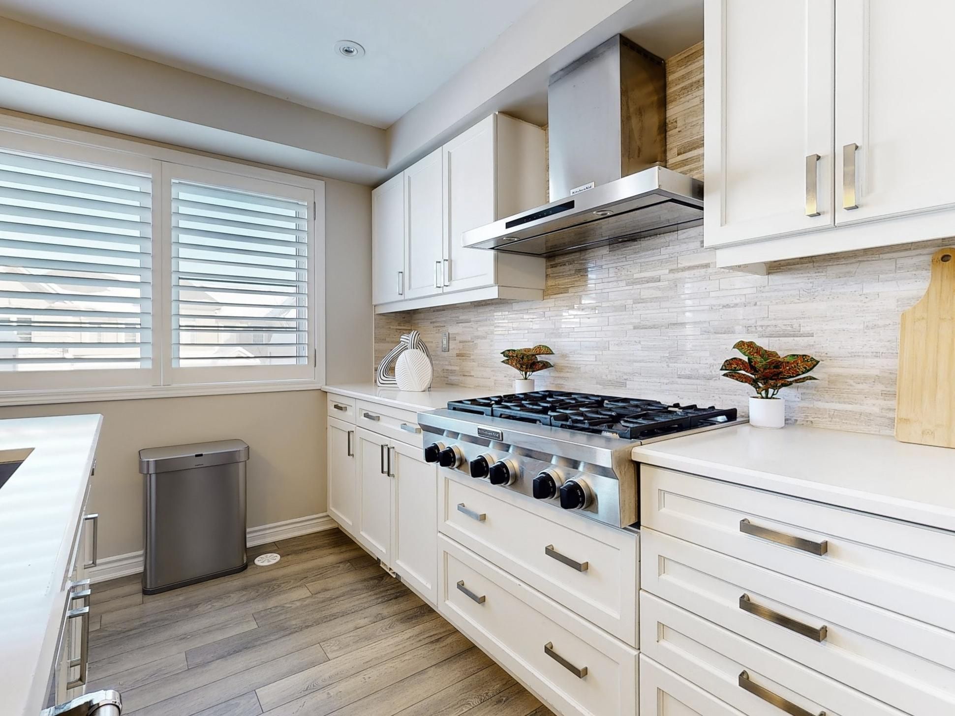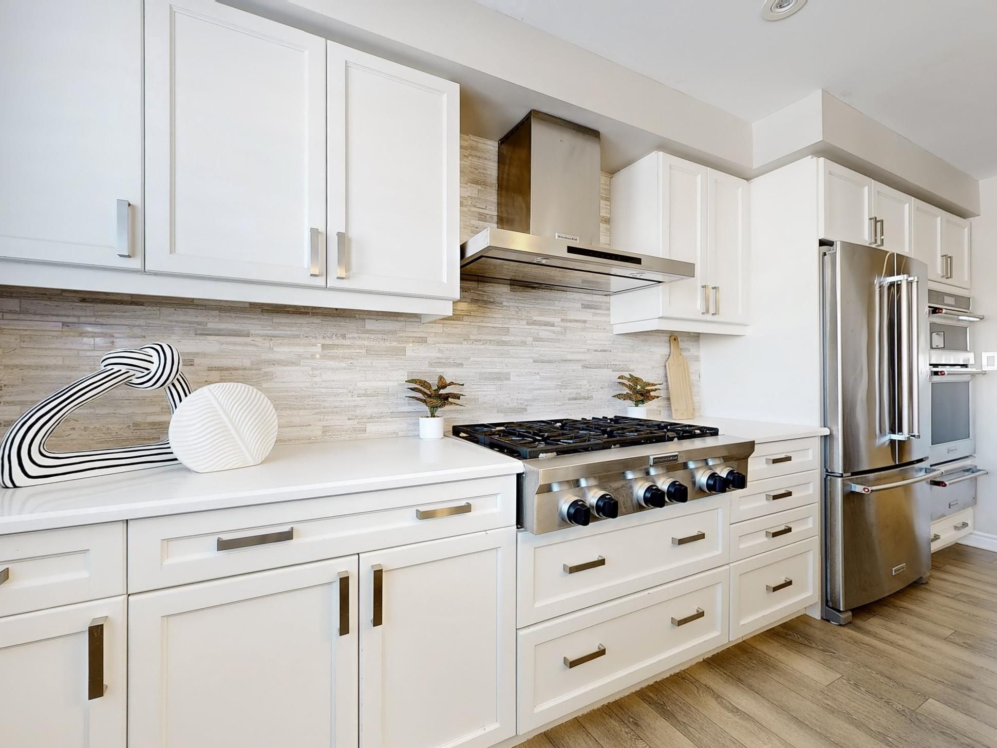 • Modern chef's kitchen featuring quartz counters and upgraded appliances.