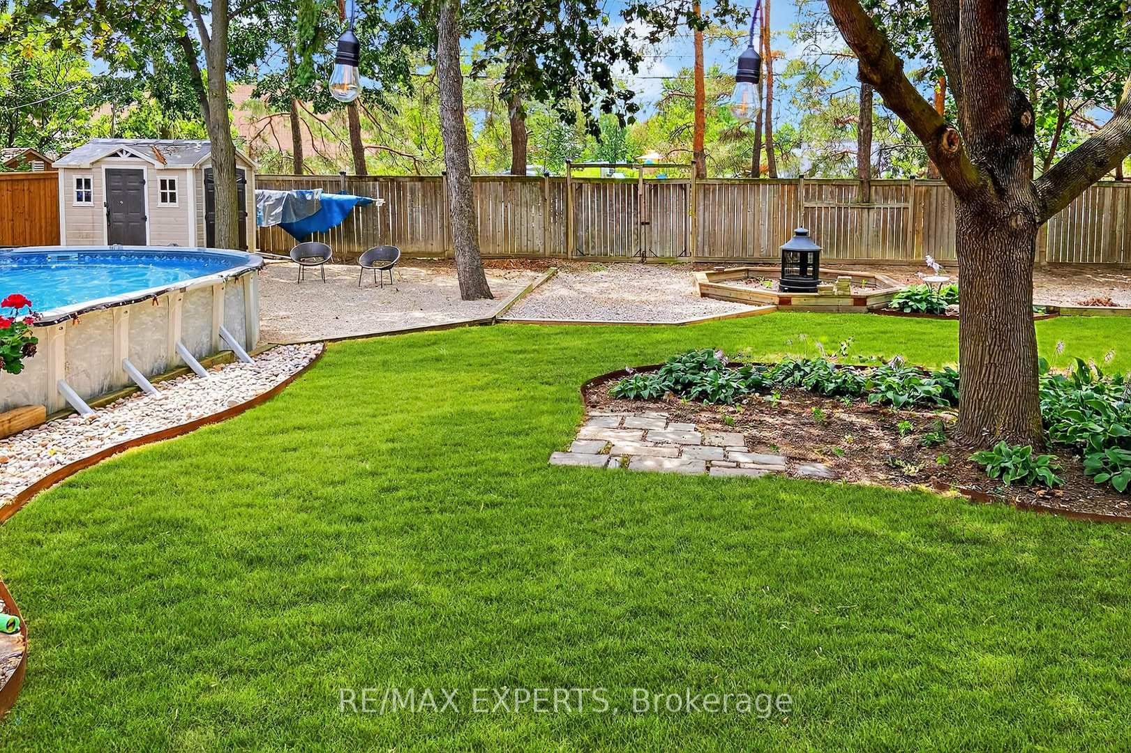 • Private backyard with above-ground pool, fire pit, and landscaped area.