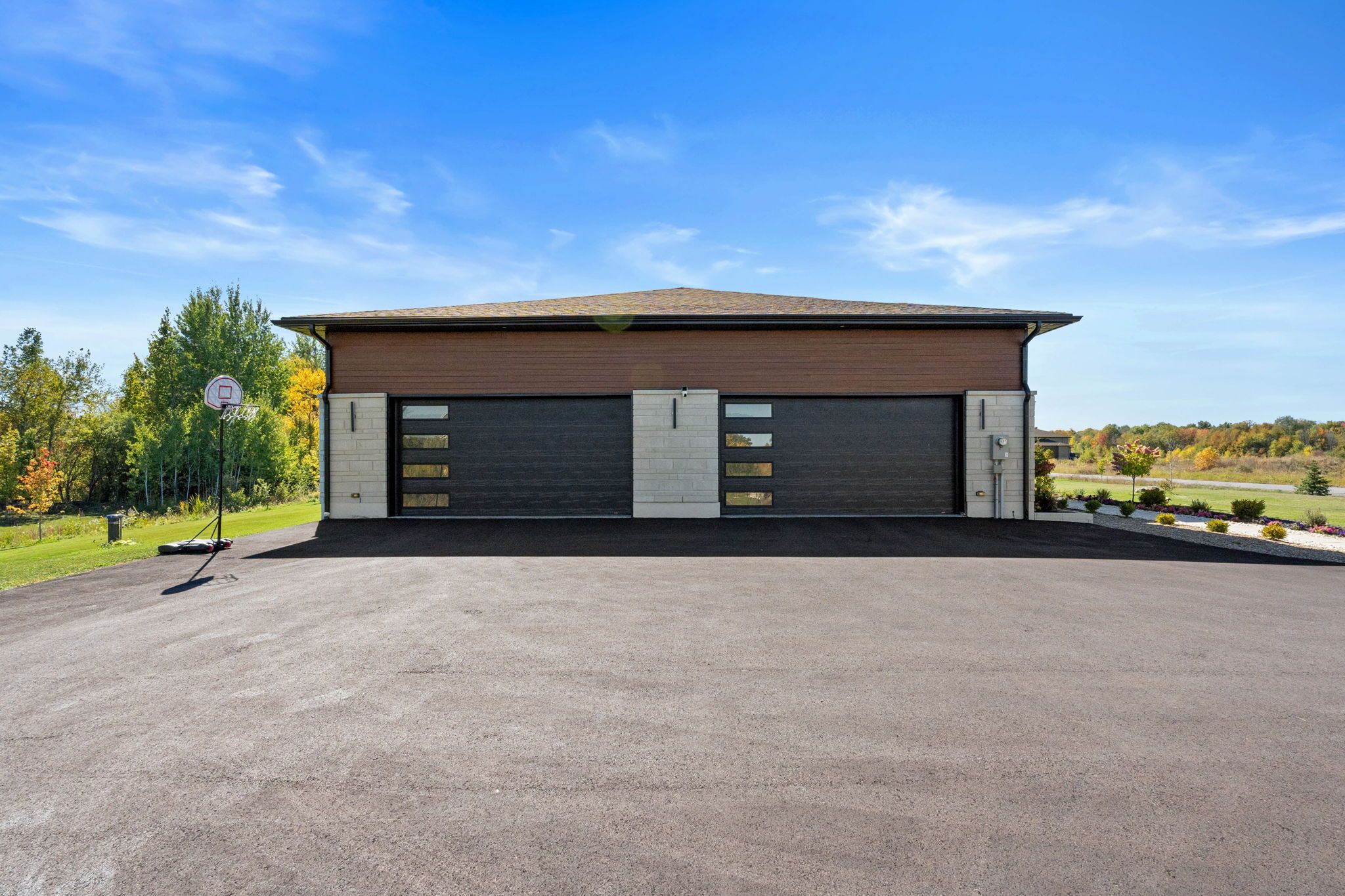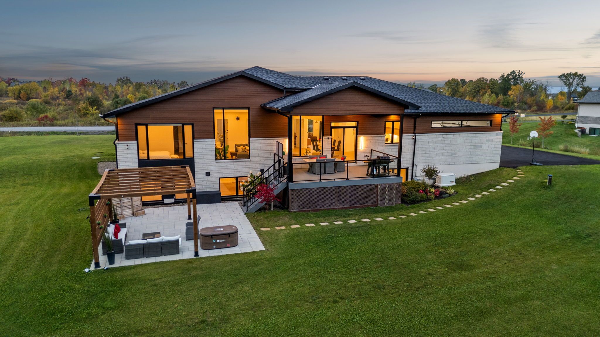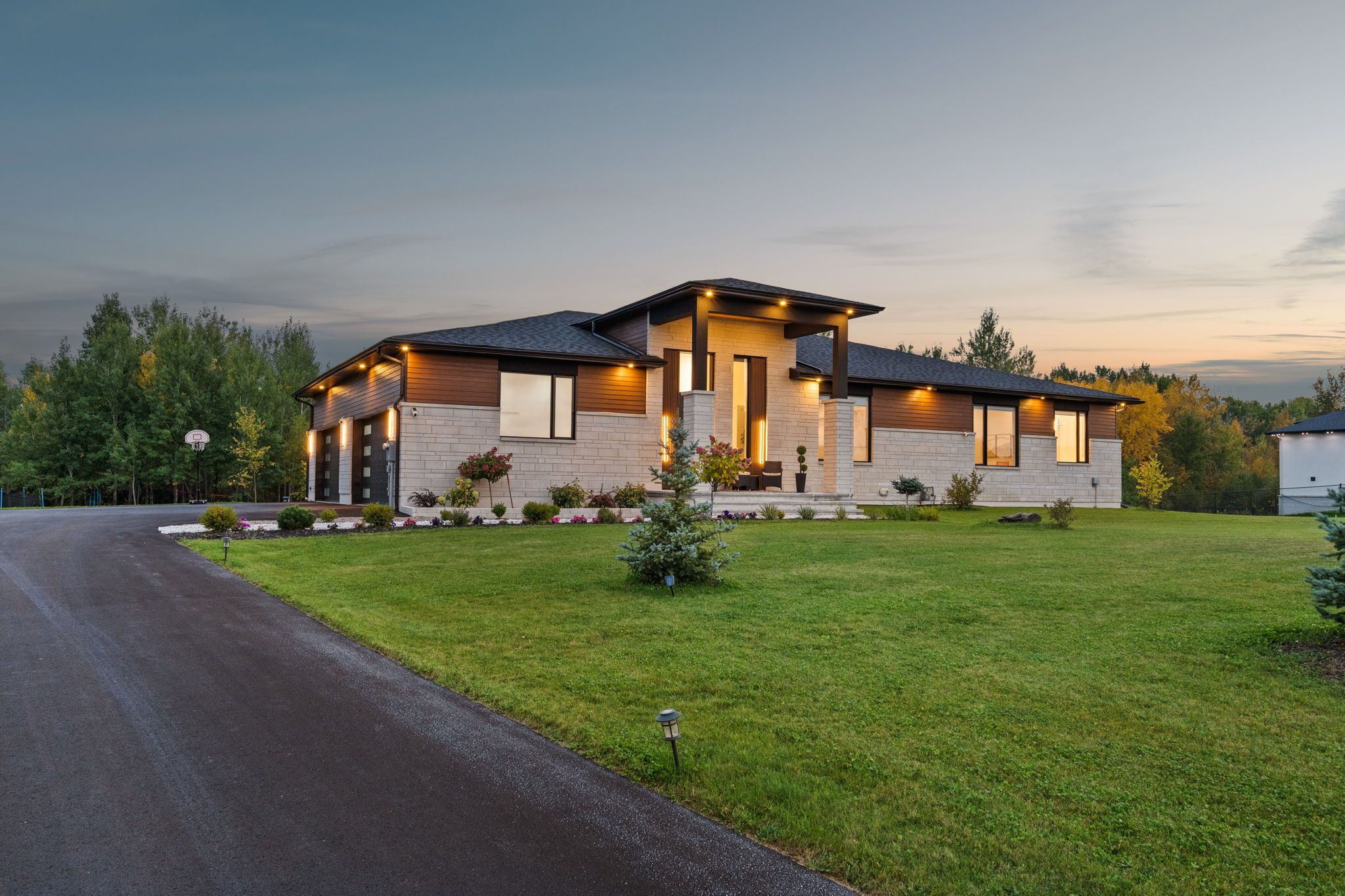 This custom-built luxury bungalow offers over 5600 sq ft of total finished living space, set on a rare estate-sized lot of over 2 acres in an upscale, low-density community. Built in 2023, the home combines modern design with exceptional space and privacy, while remaining conveniently located near major amenities and ottawa's high-tech employment hub. The thoughtfully designed layout includes 5 bedrooms and 4 bathrooms, with 3 bedrooms on the main level and 2 bedrooms in the lower level, ideal for multi-generational living, flexible family needs, or home office use. Ceiling heights reach up to 15 ft in the foyer and living room, with 10 ft ceilings across the main level, complemented by large black-framed double-pane windows that flood the home with natural light and enhance its architectural presence. The open-concept living area flows seamlessly into a modern kitchen featuring a waterfall quartz island, full-height quartz backsplash, custom soft-close cabinetry, and a premium appliance package. The primary suite offers a private retreat with a spa-inspired ensuite, including a freestanding soaking tub, glass-enclosed rain shower with body jets, and a custom walk-in closet. The lower level extends the living space with a spacious recreation area, electric fireplace (included), dedicated home gym, additional bedrooms, and a full bathroom finished to the same high standard as the main floor. Outdoors, the property features professionally landscaped grounds, interlock patios and walkways, a covered terrace, custom pergola, mature trees, multi-zone irrigation, and architectural exterior lighting. Additional highlights include a 4-car attached garage with epoxy flooring, extensive parking, smart home technology, comprehensive led lighting, full security system, and electric fireplaces on both levels. This move-in-ready bungalow presents a rare opportunity to enjoy space, privacy, and modern luxury in one of the area's most desirable communities.
