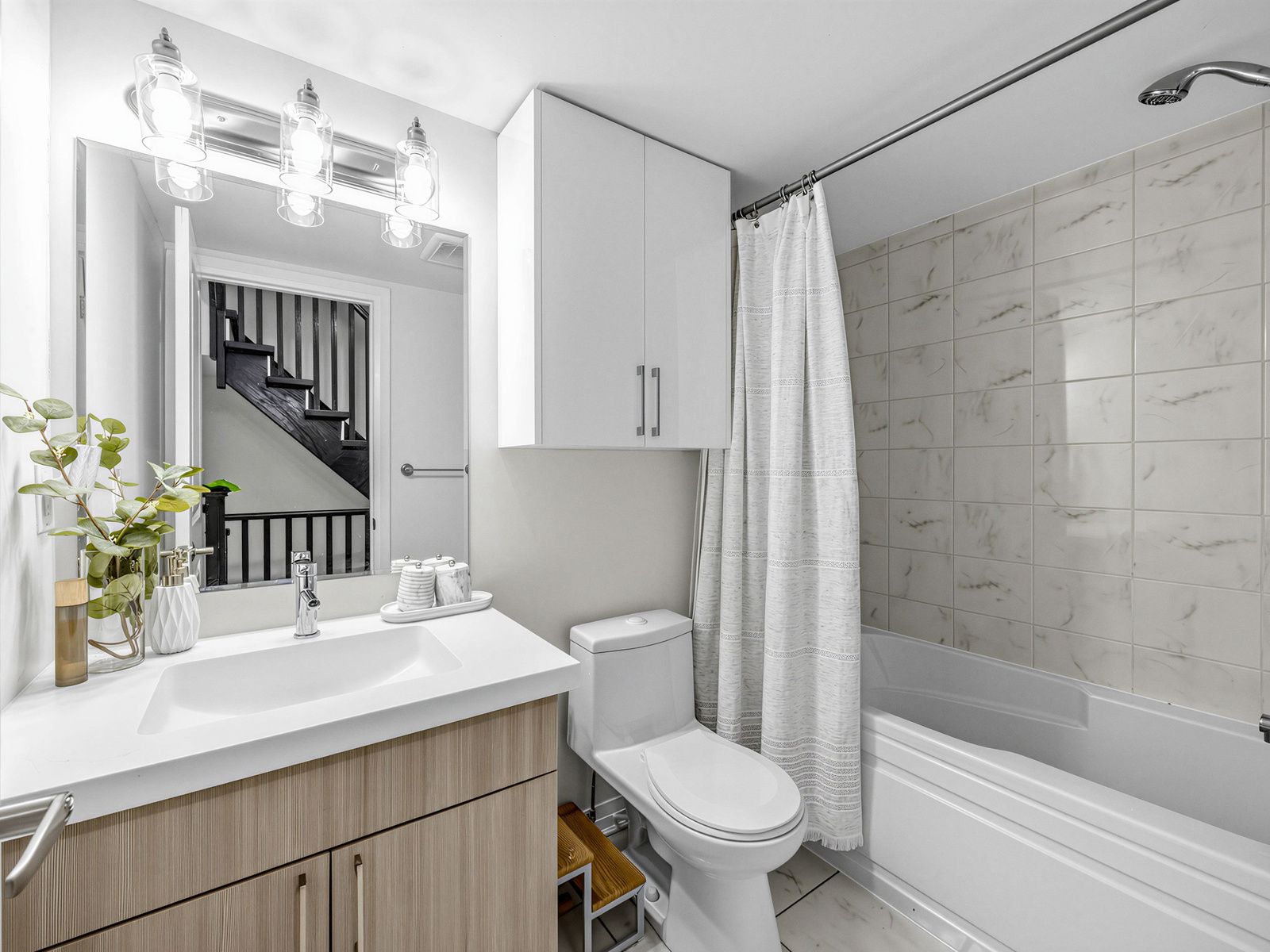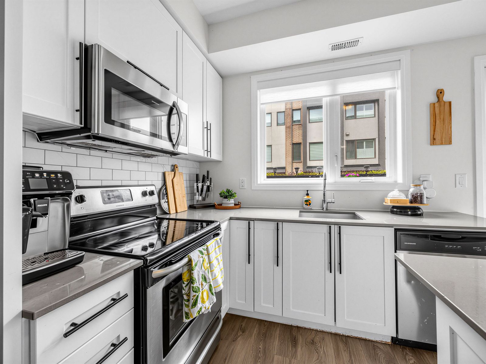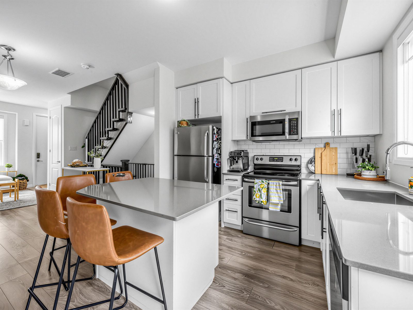 • Sleek kitchen with quartz countertops and custom cabinetry for extra storage.