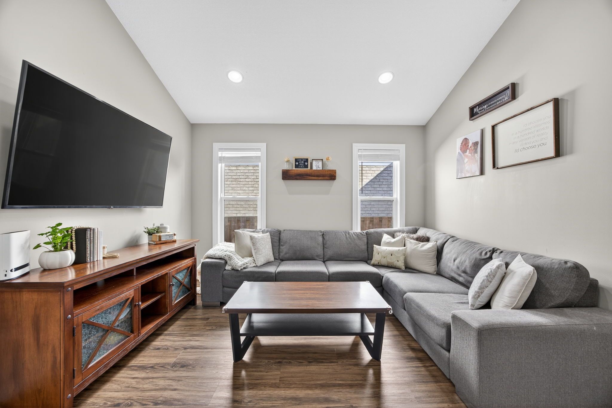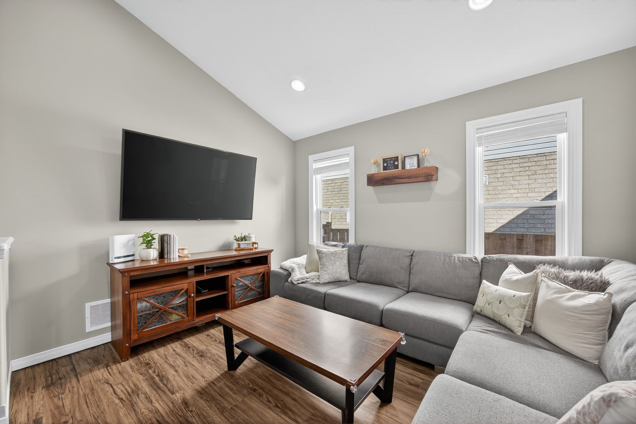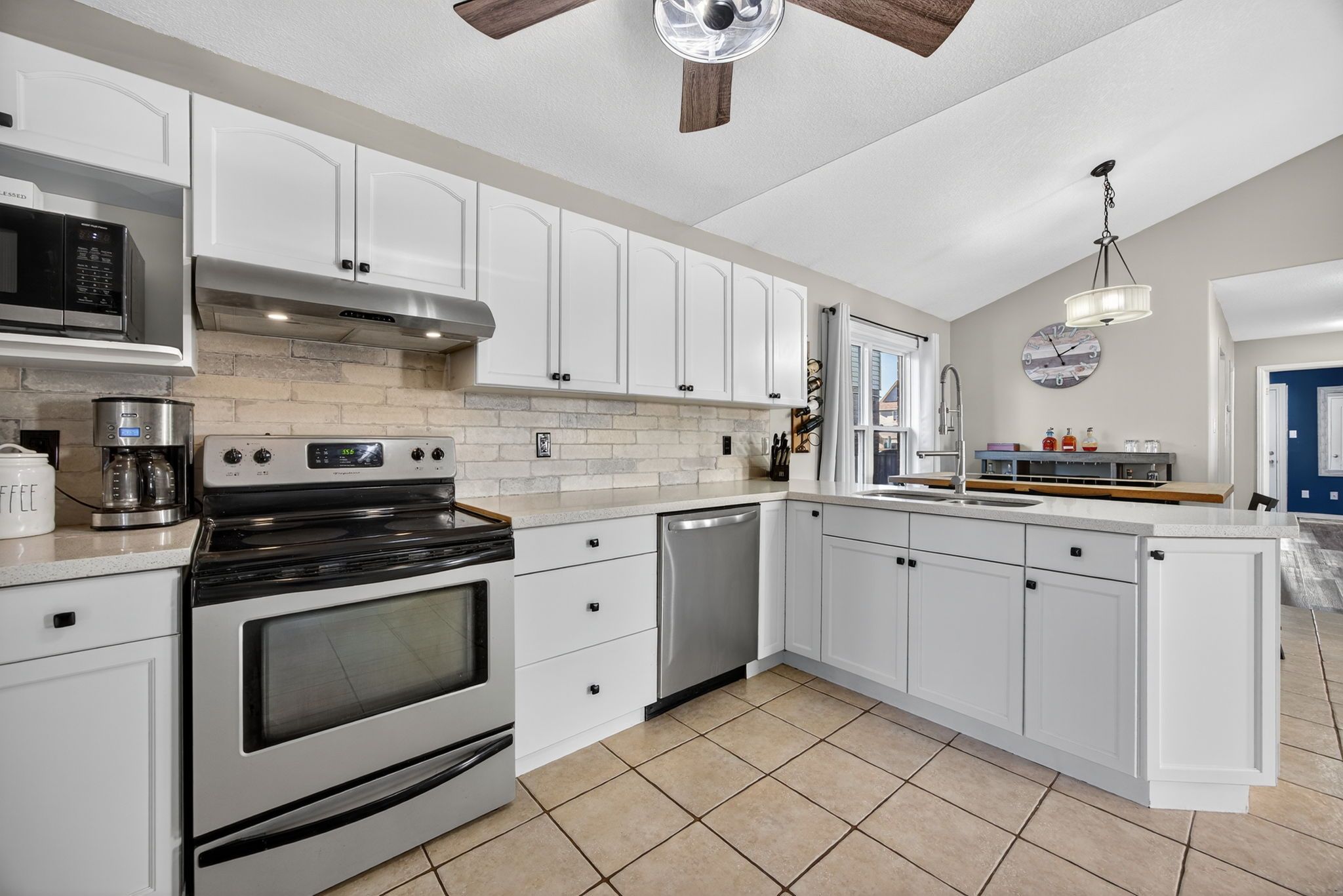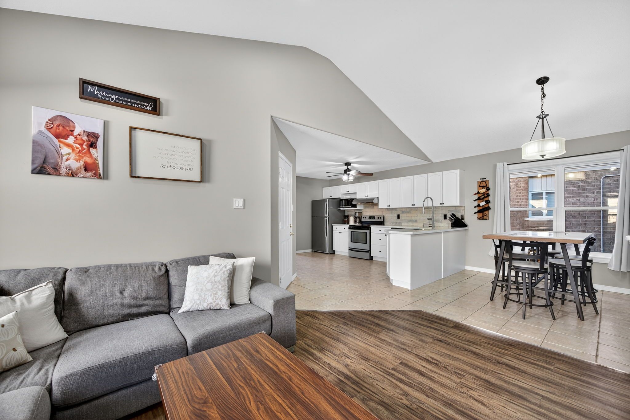 • Open-concept layout with a spacious kitchen and cathedral ceiling.