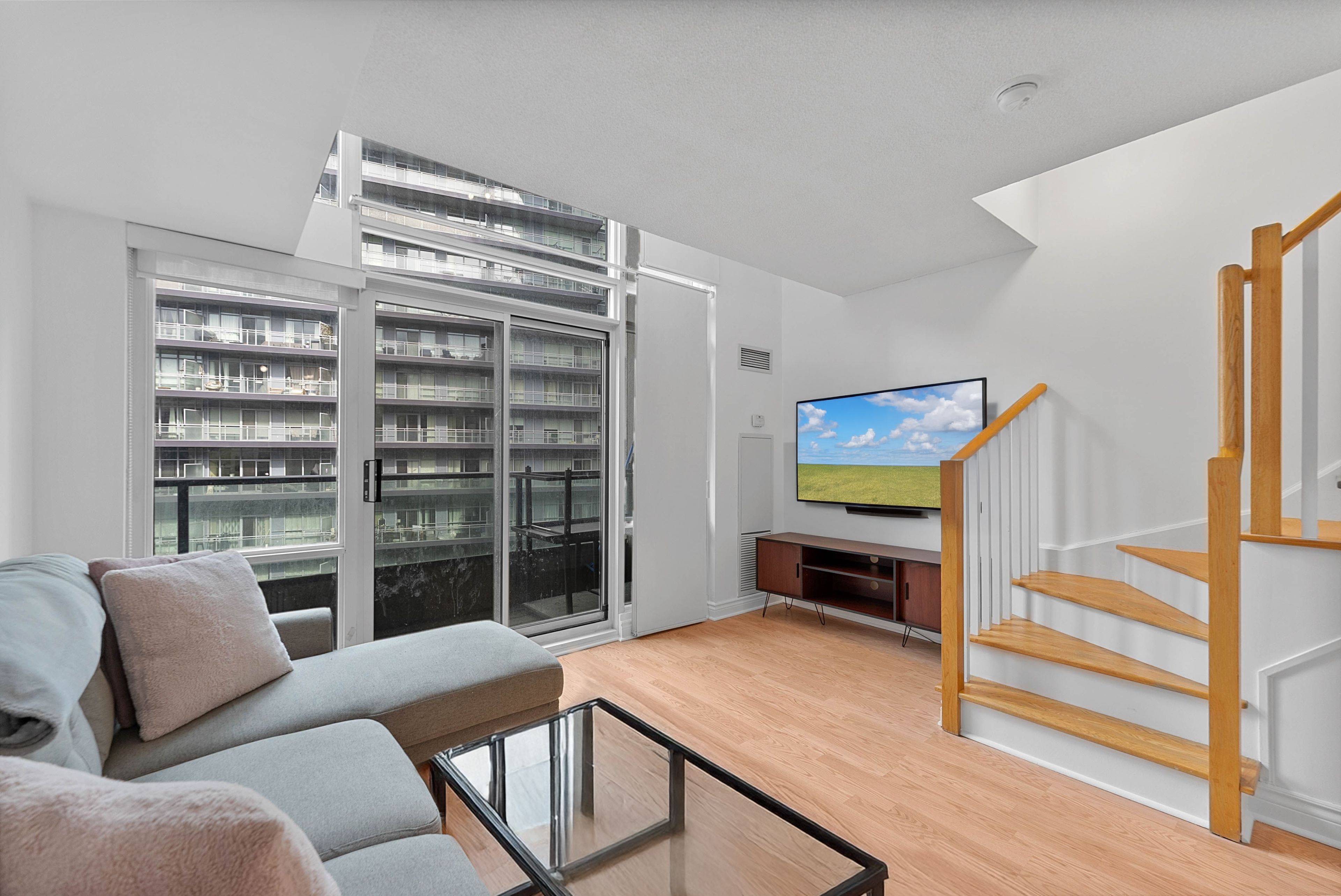 Turn-key and freshly painted, this bright two-storey suite offers a functional layout and exceptional natural light. The kitchen is generously sized and overlooking the living room, creating an open and connected main living space . The living room features a walk-out to the balcony and dramatic two-storey, floor-to-ceiling windows that fill the suite with natural light. A convenient 2-piece powder room completes the main level. Upstairs, the spacious bedroom includes in-suite laundry and a private ensuite bath, offering a comfortable and practical retreat. Ideally located close to everyday amenities, with loblaws across the street and the fleet streetcar at your doorstep. Enjoy being minutes from the waterfront and green space at coronation park. Parking and locker included.