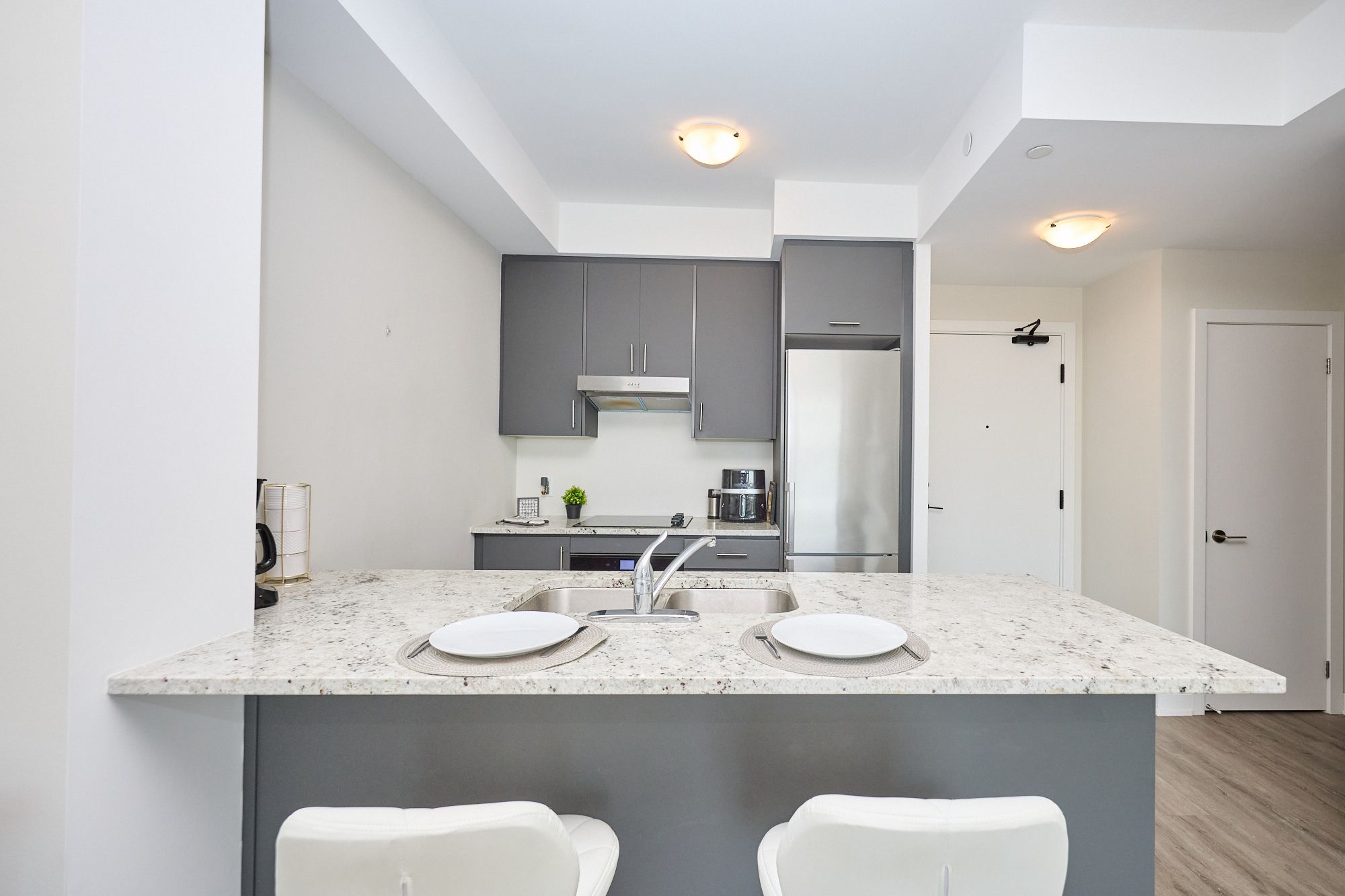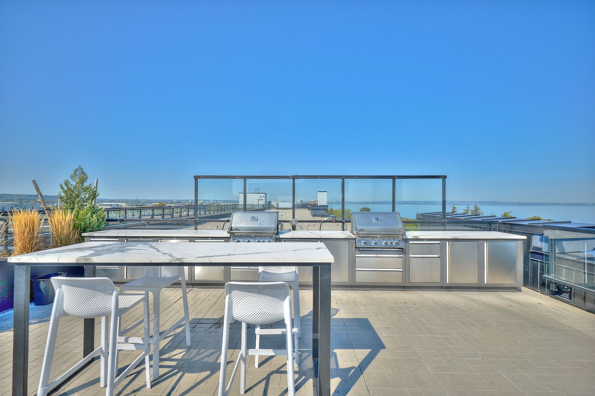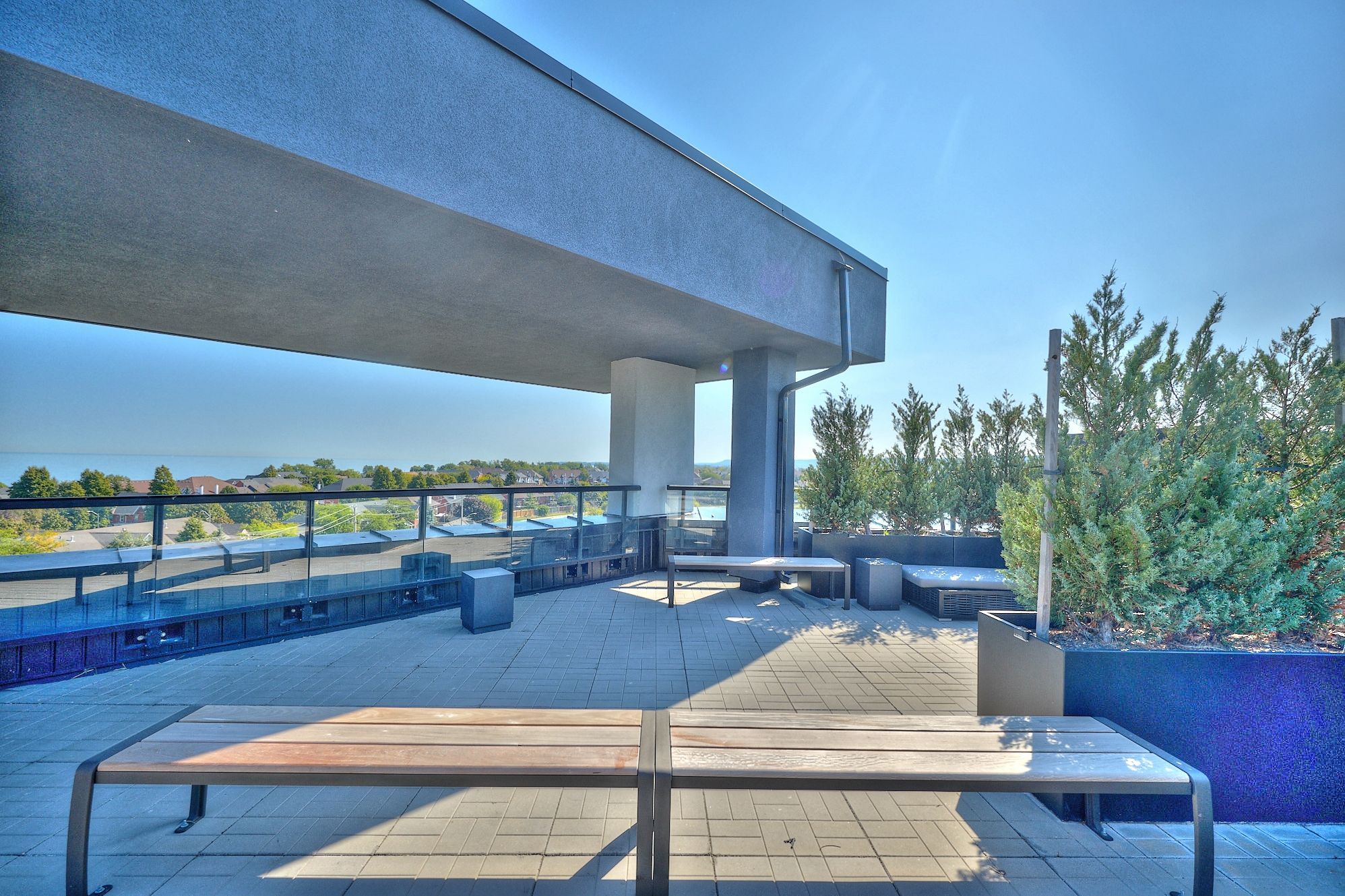 Experience elevated condo living in this beautifully designed suite built by the renowned desantis homes in the como building. Featuring a spacious open-concept layout, this residence is adorned with chic finishes and large windows that flood the space with natural light. The kitchen is both stylish and functional, complete with a breakfast bar perfect for casual dining, while in-suite laundry adds everyday convenience. Step outside to a generously sized balcony that offers additional living space ideal for relaxing or entertaining. This unit includes a dedicated underground parking spot and a private storage locker, offering both security and convenience for your lifestyle. Residents enjoy access to an impressive array of building amenities, including a rooftop terrace with breathtaking views of lake ontario, outfitted with bbqs, loungers, and a welcoming seating area. Pet lovers will appreciate the on-site dog park and pet grooming spa, while the media room and party room provide space for social gatherings and entertainment. Located in a prime spot for commuters, this home is just minutes from the qew and within walking distance to the lake, blending convenience with lifestyle in one exceptional package.