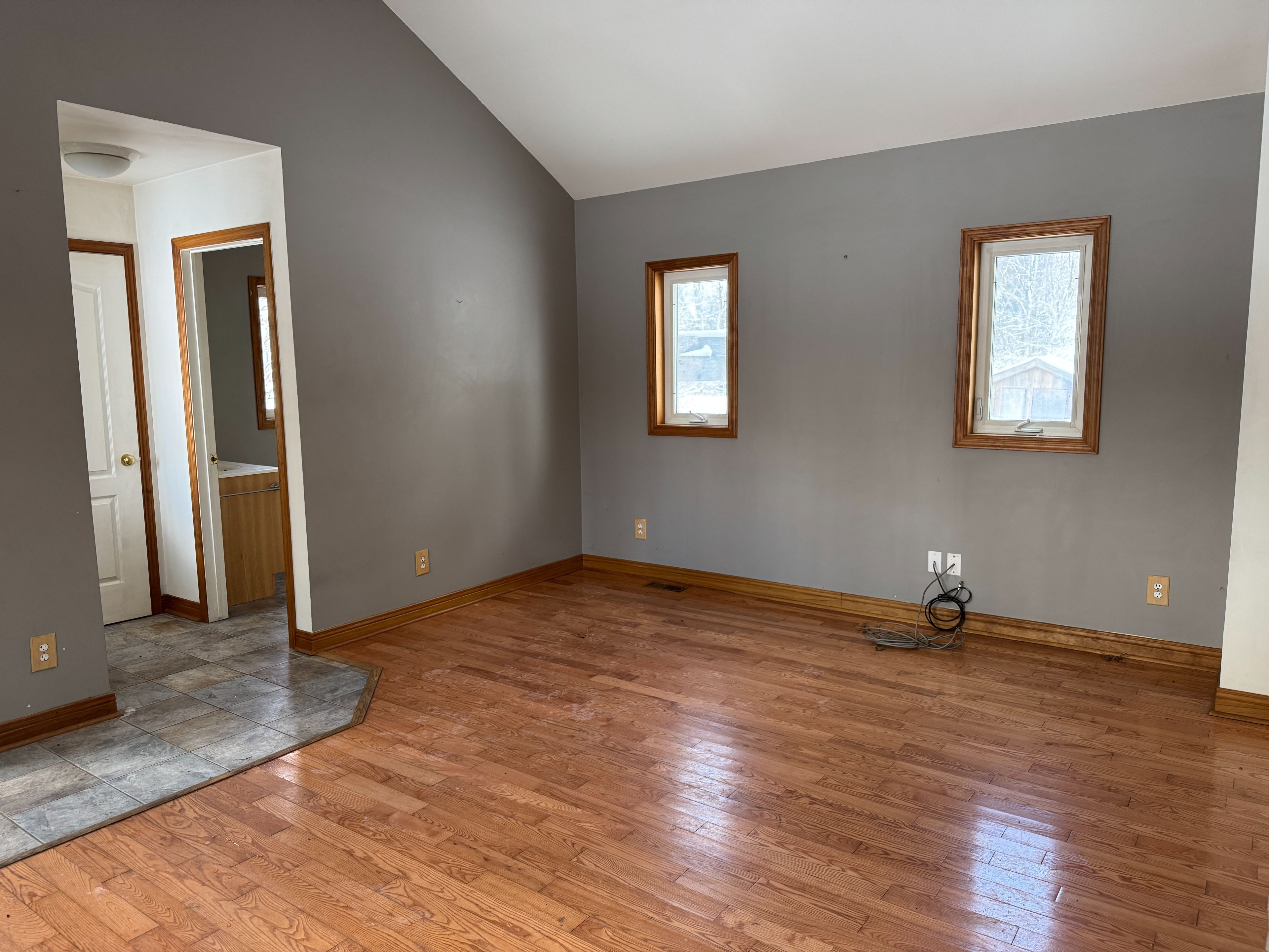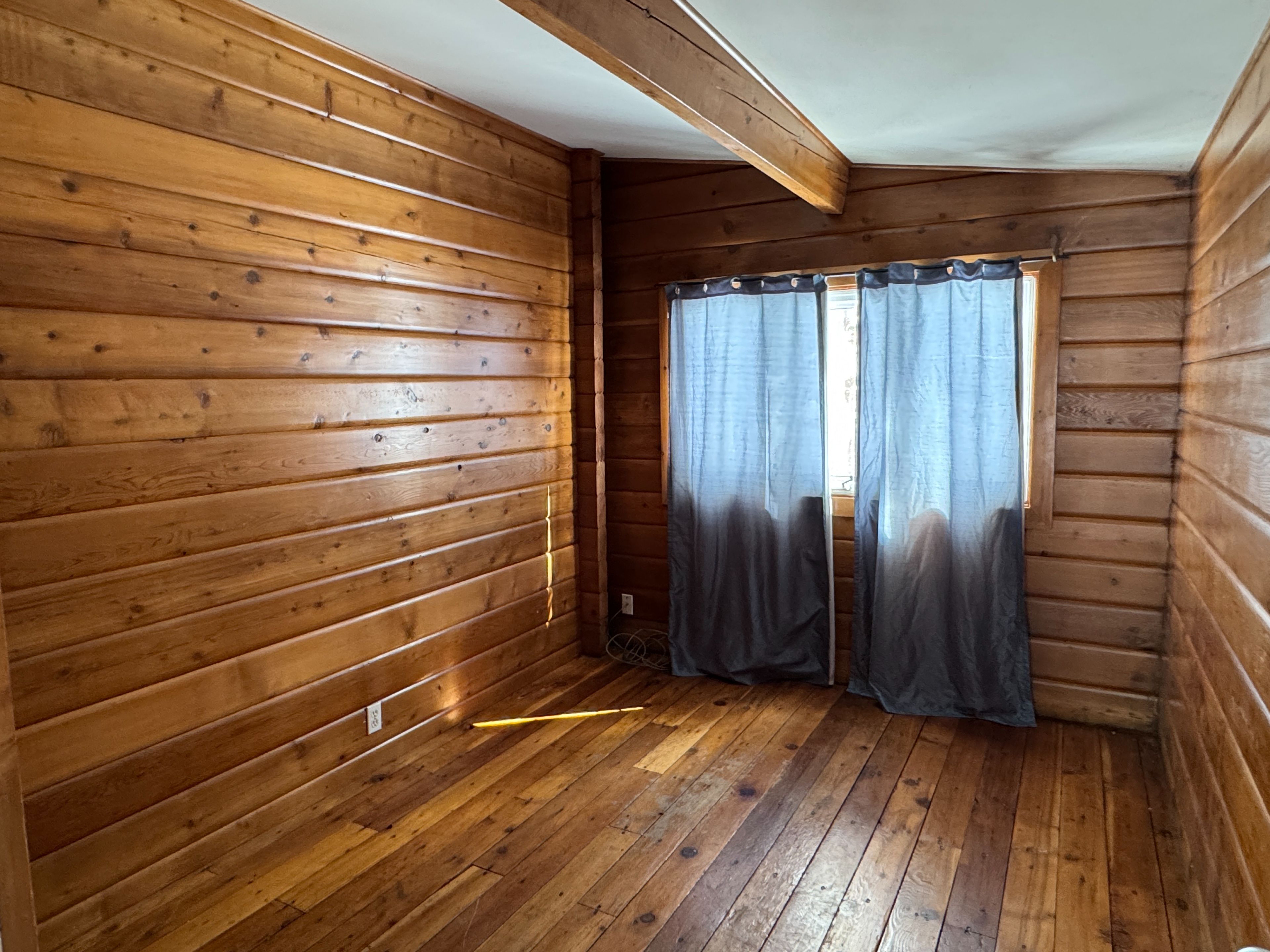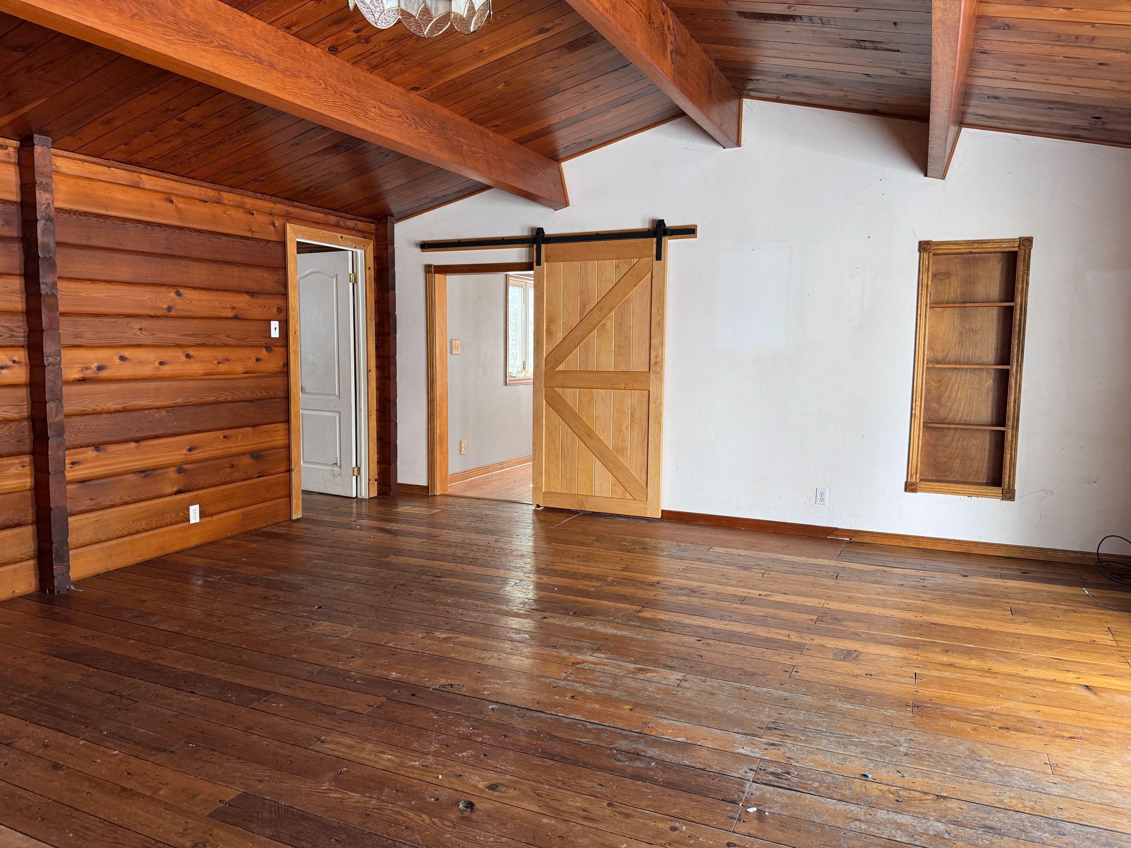 • Spacious main living area with rustic wood floors for a warm vibe.