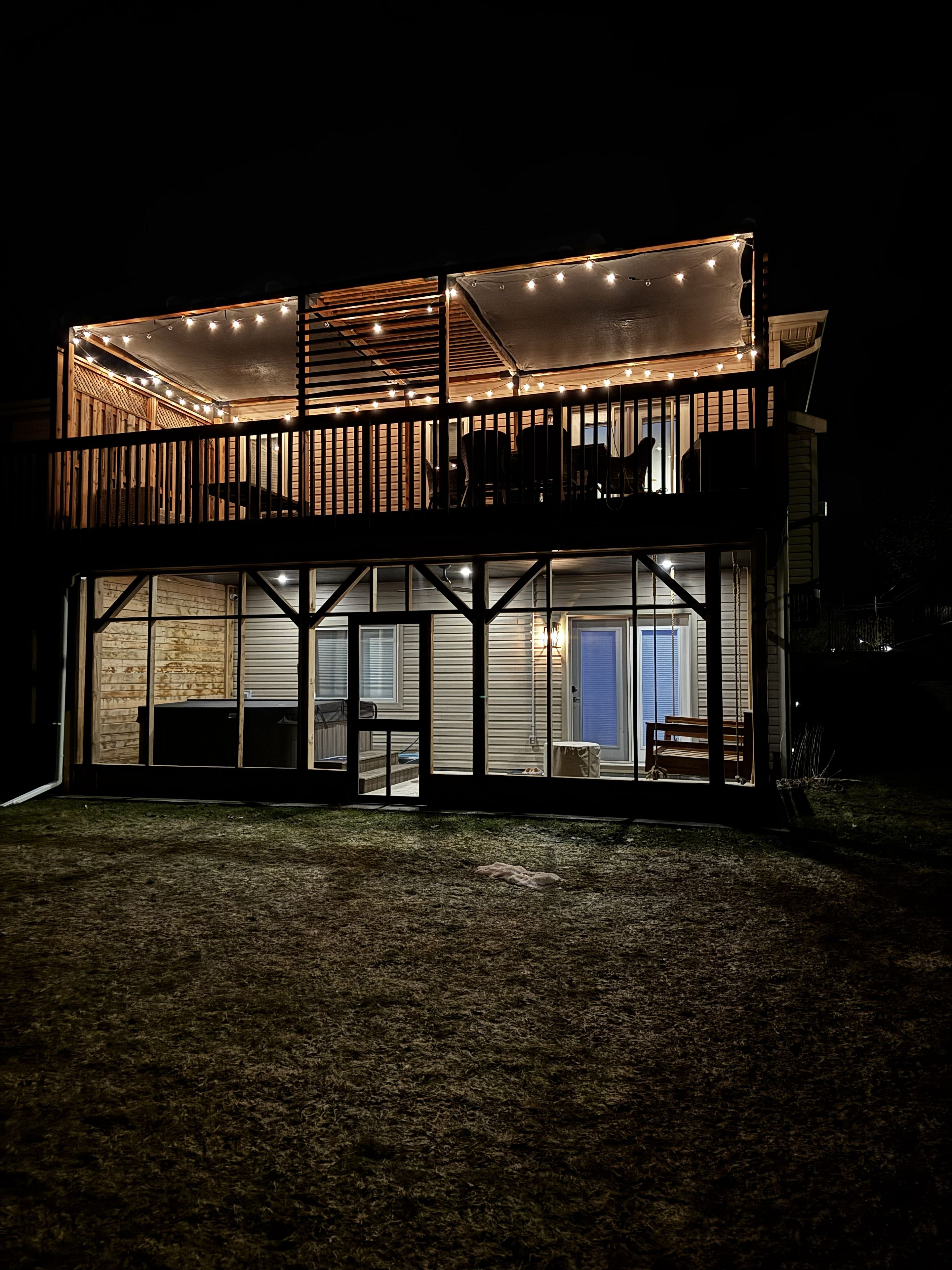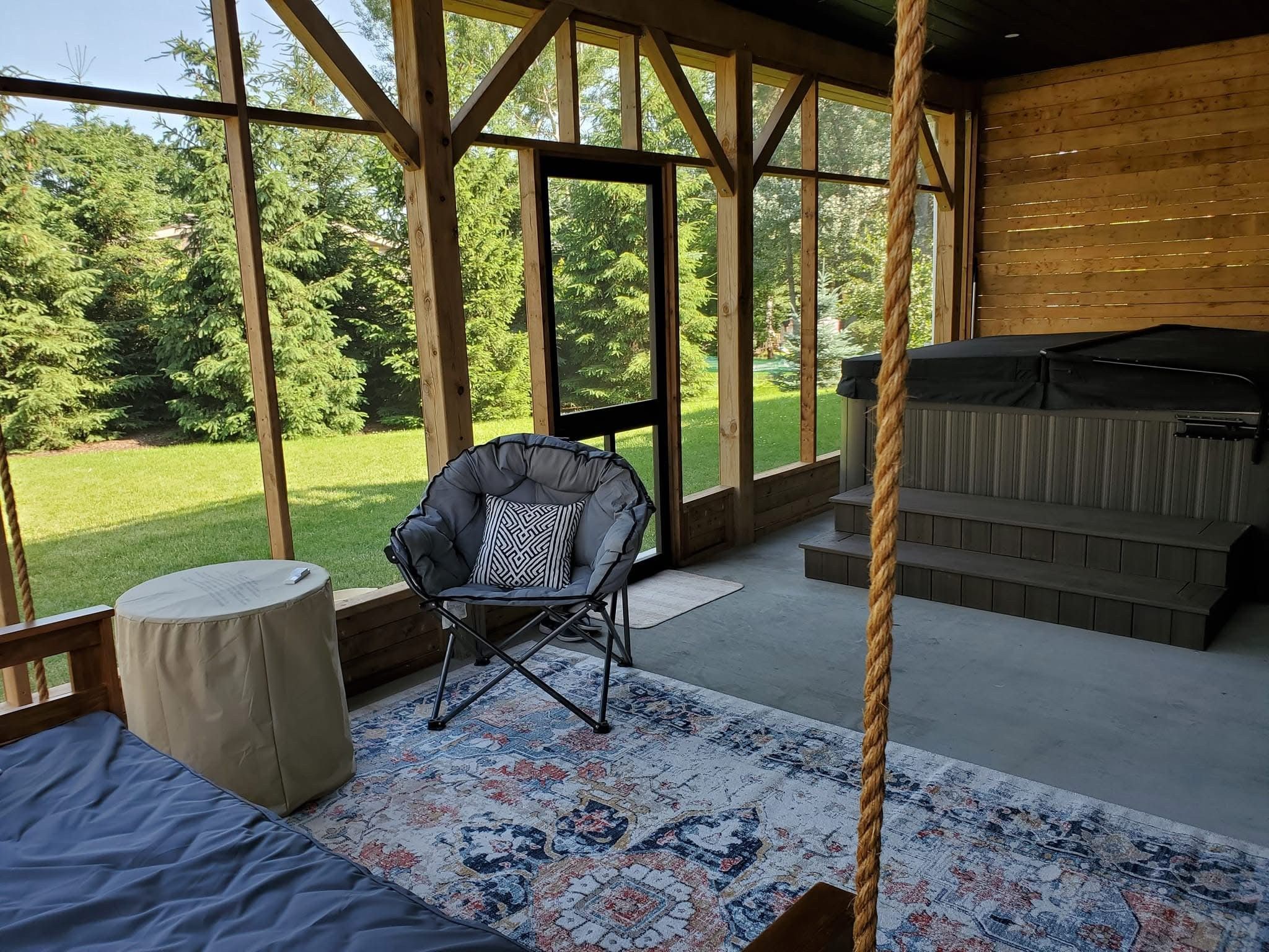 • Private upper deck and screened-in porch featuring a hot tub for relaxation.