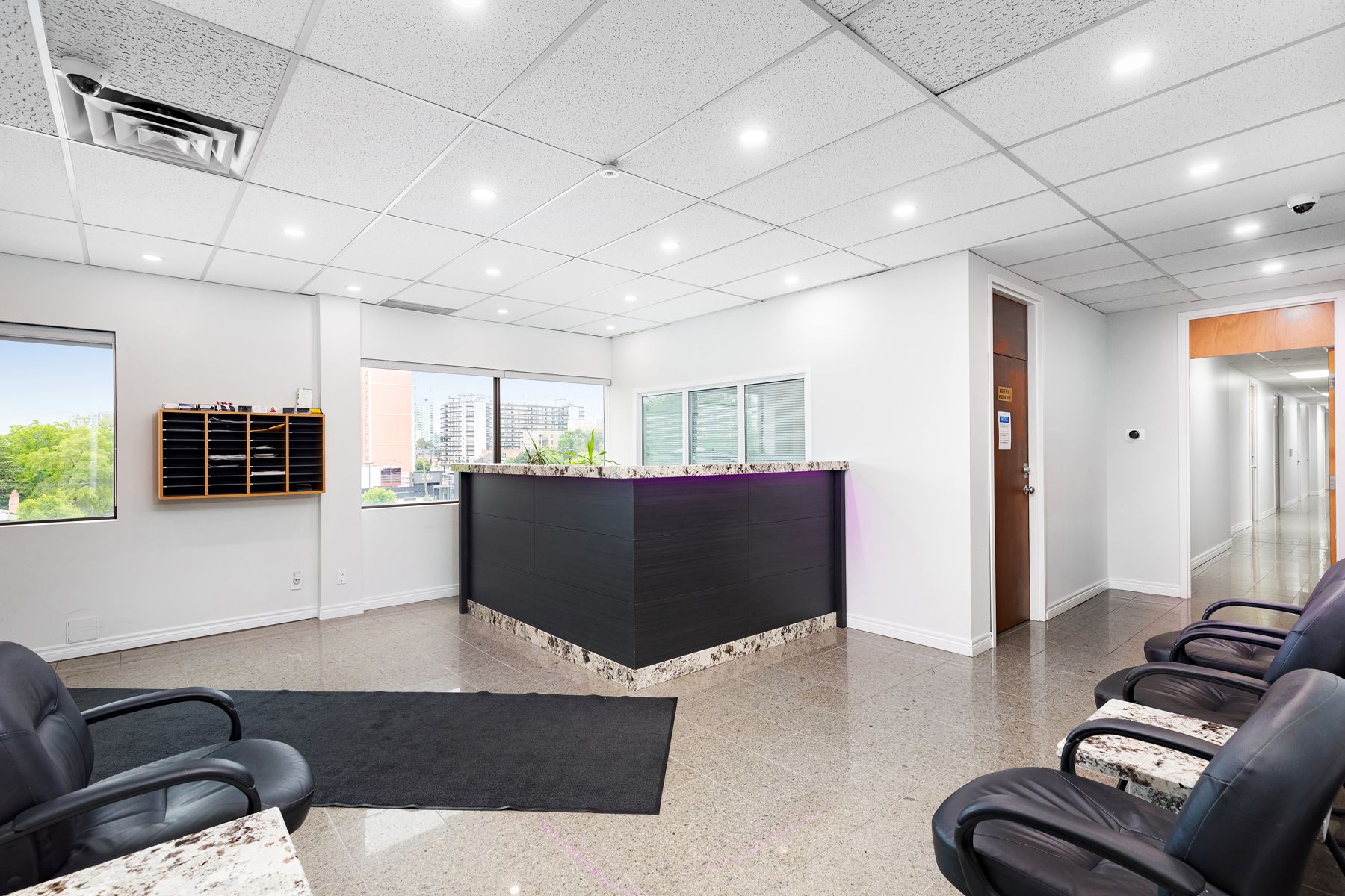 Office space suitable for professional use, beauty and personal care services, or medical professionals, featuring prominent outdoor signage for rent. Conveniently located near the subway and popular dining options such as tim hortons and pizza hut. Office space also provides access to a boardroom.