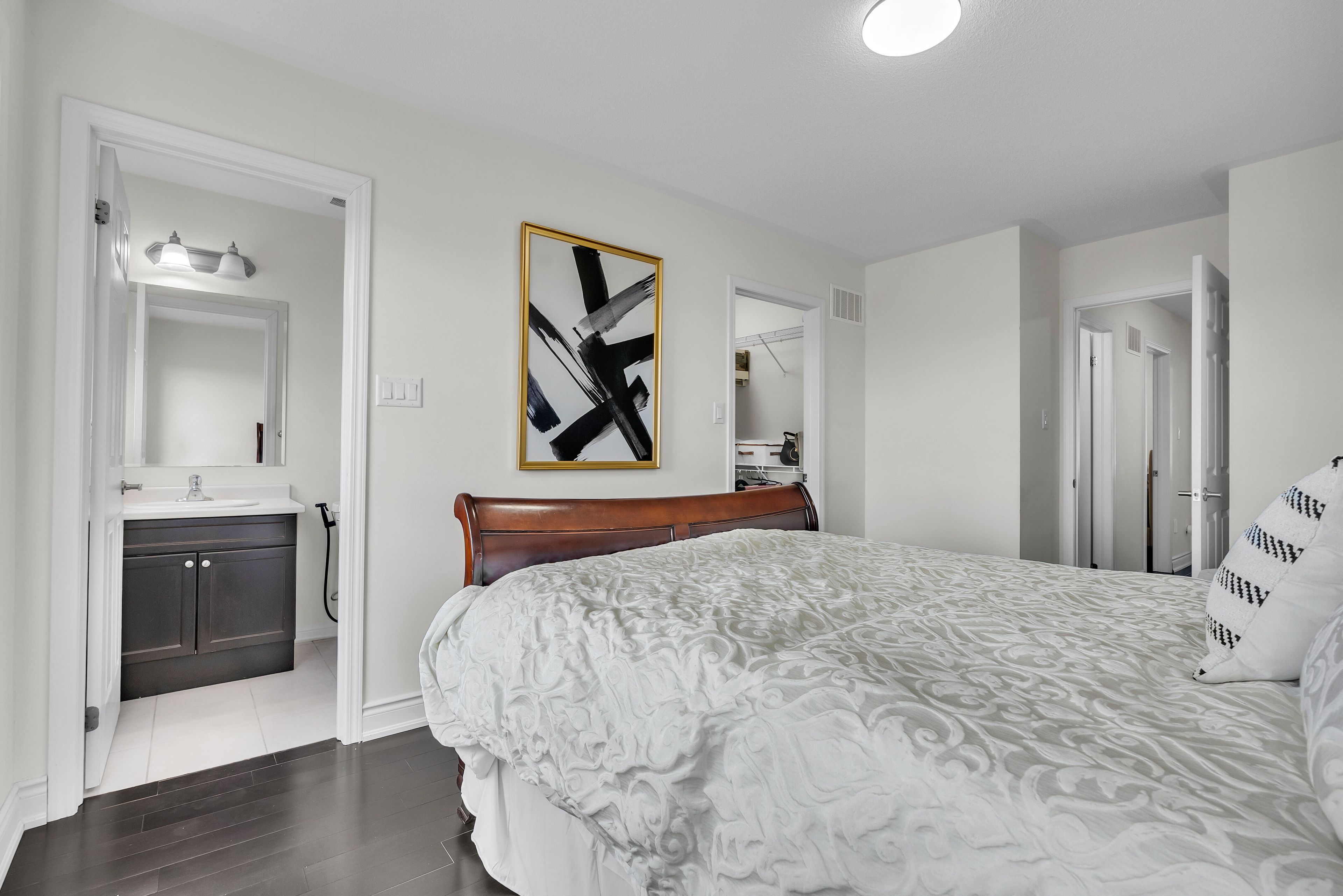 This bright and spacious townhome backs onto beautiful ravine greenery and features a well-thought-out layout, including a ground-level room that opens to the backyard. The main floor boasts an open-concept living and dining area with south-facing exposure, filling the home with natural light throughout the day. The kitchen is generously sized, with ample cabinetry, a modern backsplash, and a large breakfast area. A convenient 2-piece powder room completes the main level, which is finished with beautiful hardwood floors (installed in 2022). Upstairs, the primary bedroom offers a large walk-in closet and a 3-piece ensuite. Two additional well-sized bedrooms share a 4-piece bathroom, with all rooms featuring hardwood floors and plenty of natural light. The ground level includes a flexible space with a door, ideal for a second sitting space, home office, or hobby room. This level also has the laundry and access to the garage with extensive shelving for storage. One of the standout features of this home is the rare backyard, offering a private retreat that opens onto lush greenery and a ravine. This is a desirable location, minutes to schools, parks, shopping, milton district hospital, go station, and future wilfrid laurier university milton campus. Outdoor enthusiasts will appreciate easy access to rattlesnake point and sherwood community centre, with the upcoming tremaine rd 401 interchange nearby for added convenience.