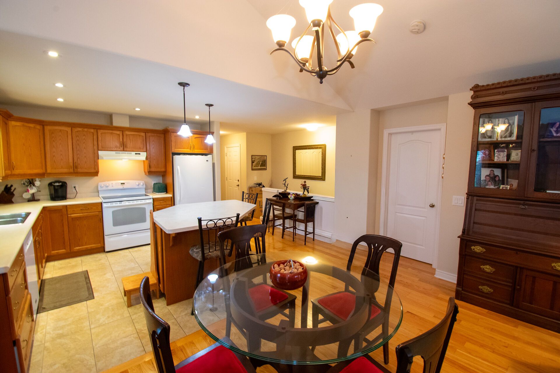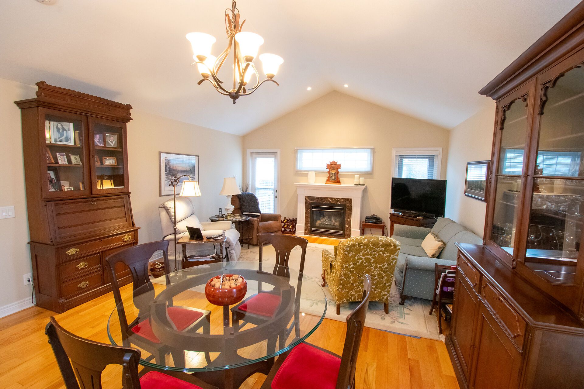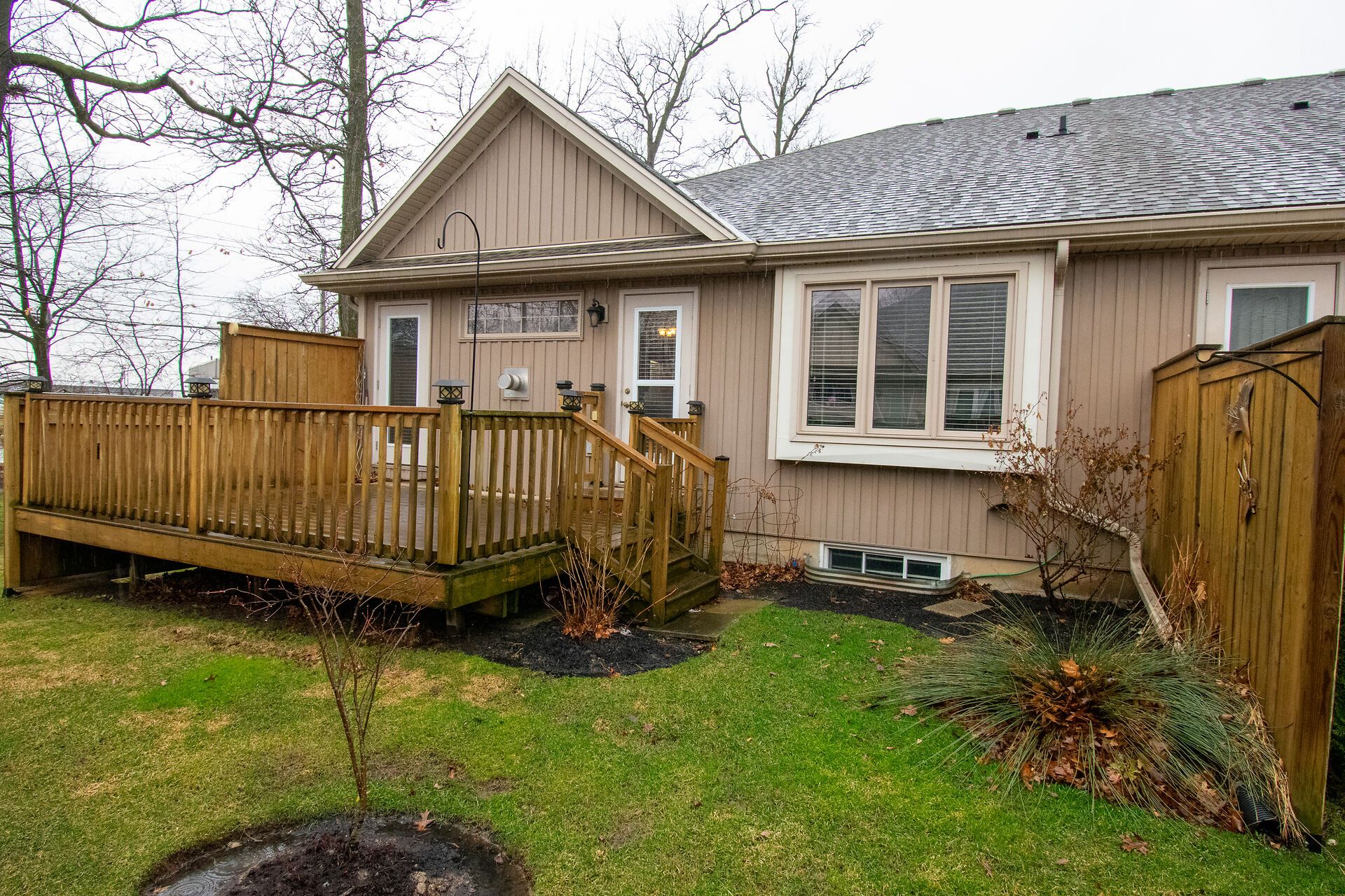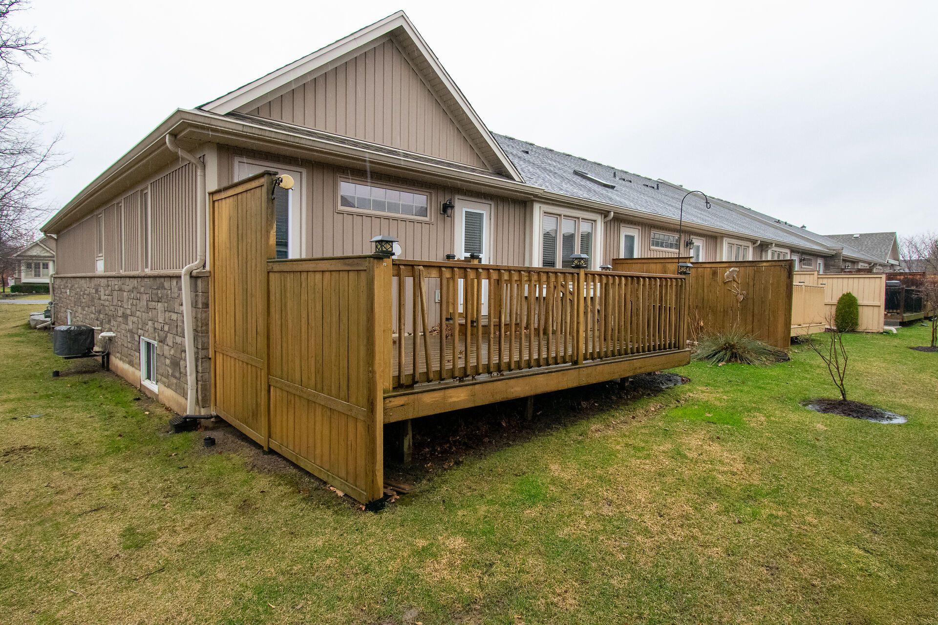 "well cared for end unit vacant land condo townhome in quiet brockwood terrace 16 unit complex. This well cared for 2 bedroom and 2 bath end unit vacant land condo townhome with single attached garage with inside access is a great opportunity for someone looking to downsize"", as you enter into the large foyer, you are greeted with a spacious area with tray ceiling & tile floors & inside access to the garage. Continue on, you will notice a good sized guest bedroom/ seating area with large closet and off the bedroom you have main floor laundry and separate 4pc main bath. At the end of the foyer, you head into the stunning open concept elmwood kitchen and great room area with vaulted ceiling & hardwood flooring & gas fireplace. In the updated kitchen you have plenty of counter & cabinet space (pull out drawers & spice drawer) with island & pot lighting and built-in appliances. In the great room you have dining area and living room combo w/ plenty of natural light, gas fireplace and separate door leading to a large deck area with gazebo. Off the kitchen you head into a generous sized master bedroom with tray ceiling, walk-in closet and large 3pc ensuite. Upstairs also offers an abundance of closet space. Once you have completed the main level you can head downstairs you notice a full height unfinished basement with full height and easy to finish offer. Close to amenities, welland canal, outlet mall & approx 10 mins to niagara on the lake