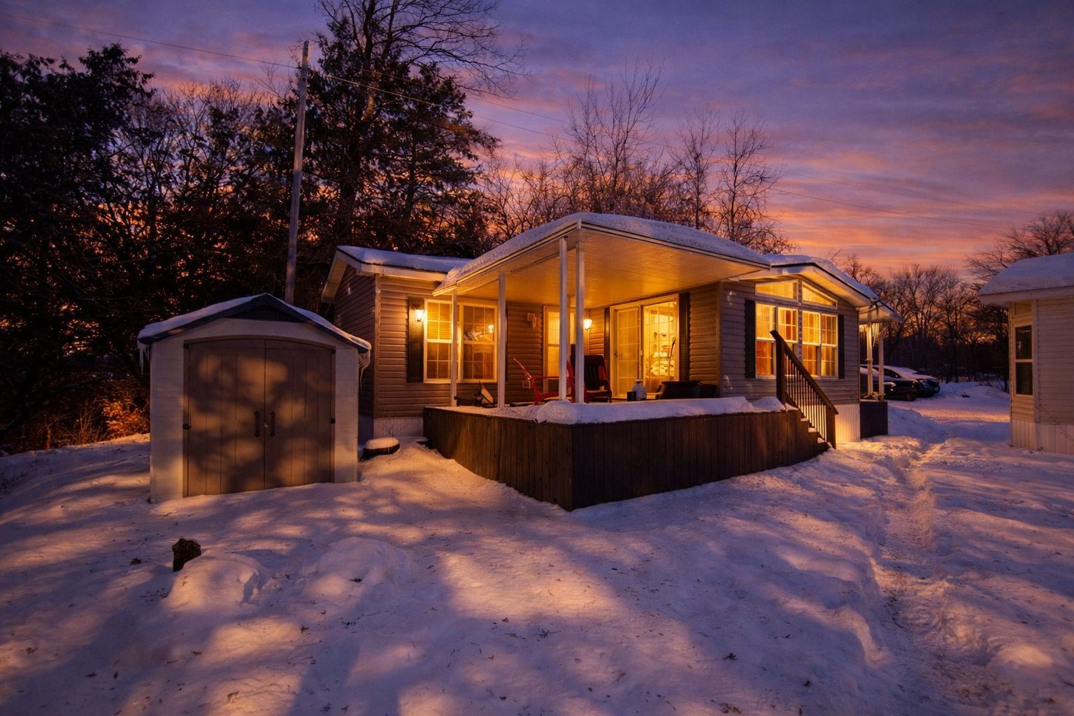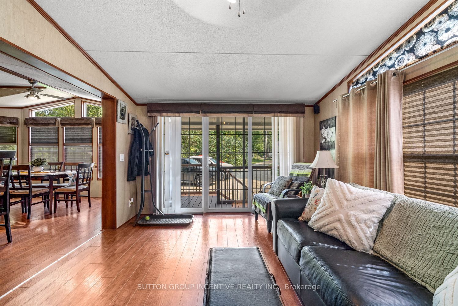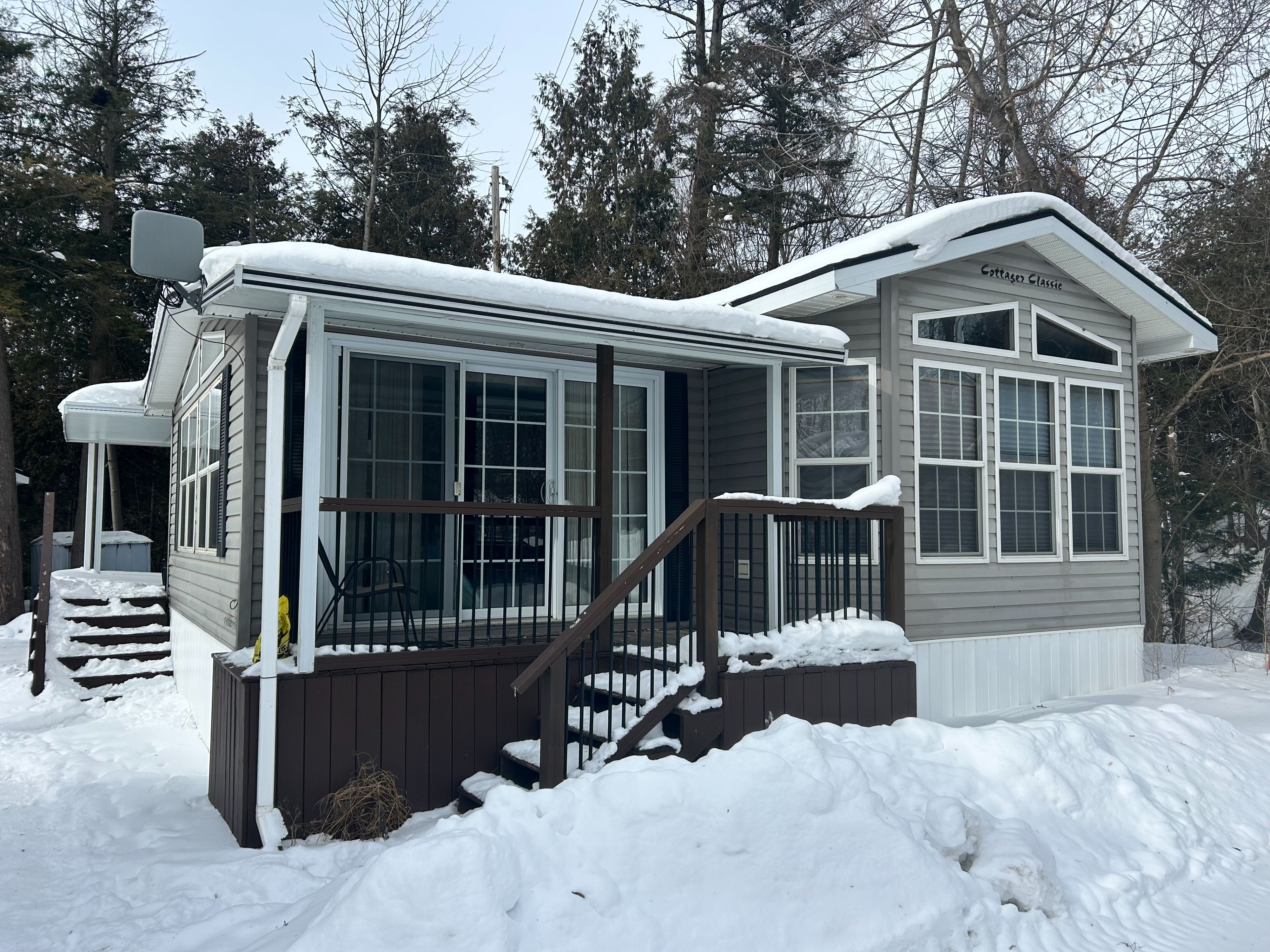 Welcome to rolling acres campground, a peaceful community ideally located between charming cookstown and growing alliston. This inviting modular home offers comfortable, accessible living in a serene natural setting. Inside, you'll find a spacious full-size eat-in kitchen designed for everyday ease and functionality, along with a thoughtfully laid-out interior that prioritizes accessibility throughout. The generous primary bedroom easily accommodates a king-size bed, creating a comfortable and relaxing retreat. All existing furnishings can be included, allowing for a seamless move-in experience. The home is serviced with reliable 30-amp electrical service to meet your needs. Step outside to enjoy the large covered back porch, perfect for relaxing or entertaining, while the expansive lot beside a tranquil ravine provides added privacy and a beautiful backdrop. Combining comfort, convenience, and a scenic location, this property is a wonderful opportunity for affordable year-round living in rolling acres campground.