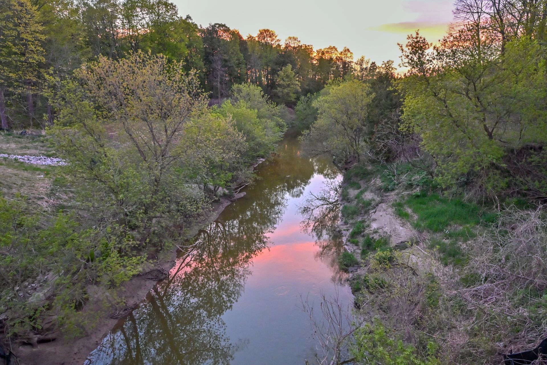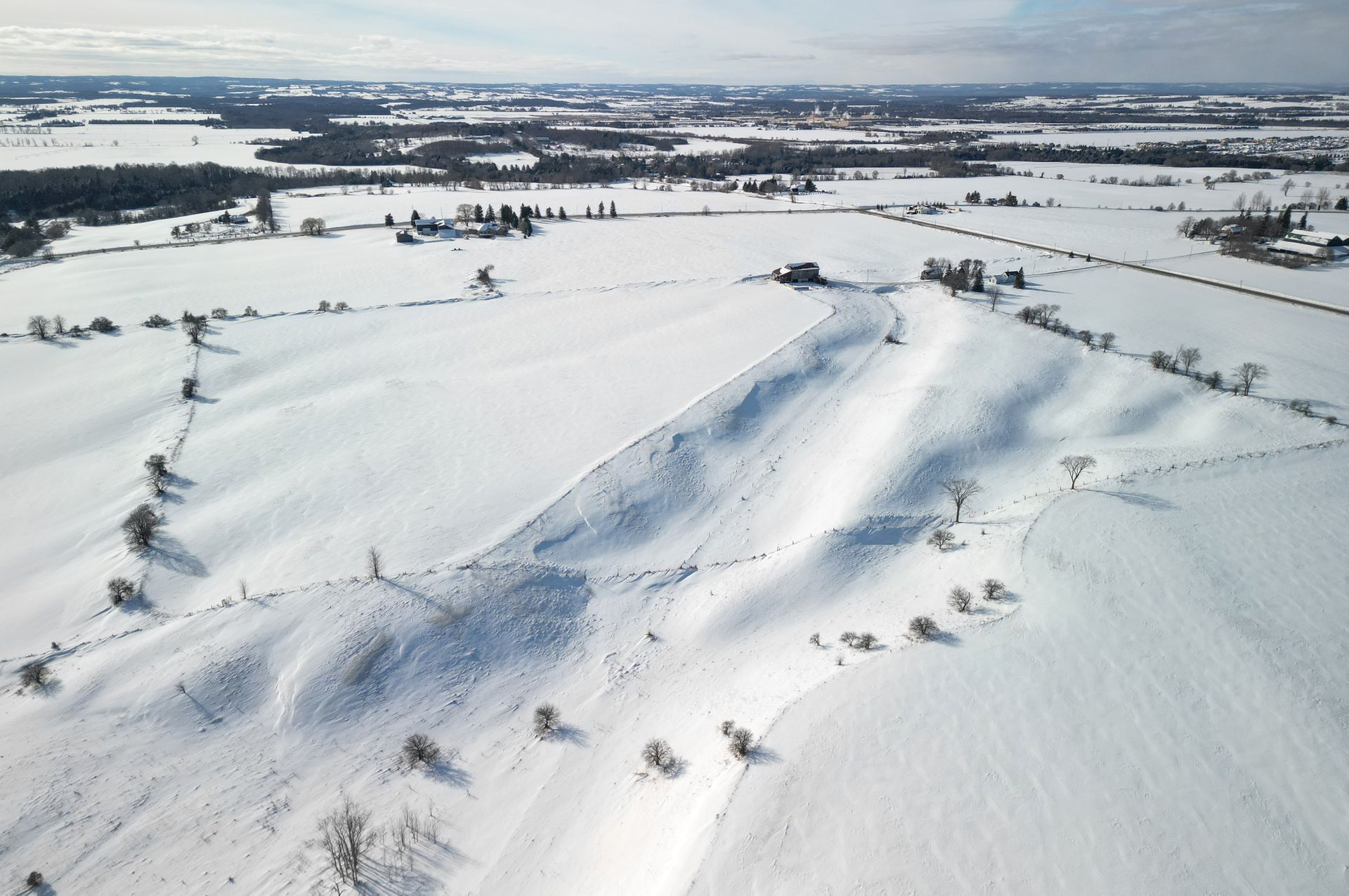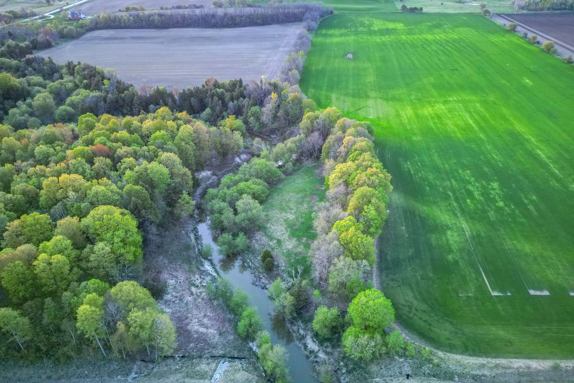 • Includes a farmhouse, barn, and flowing creek.
