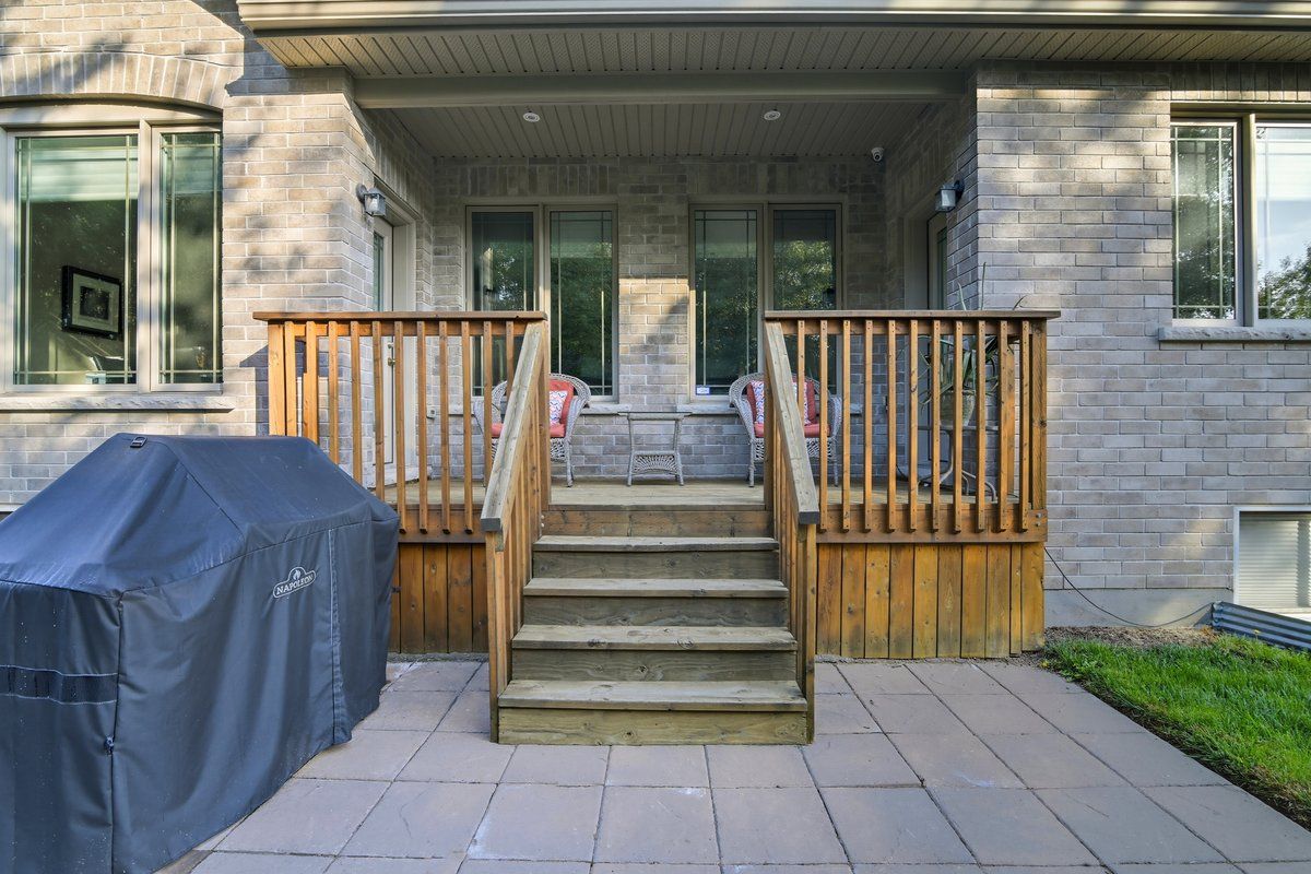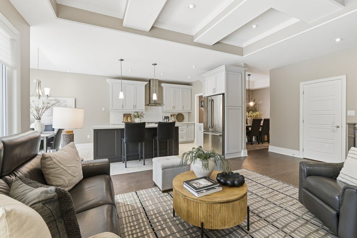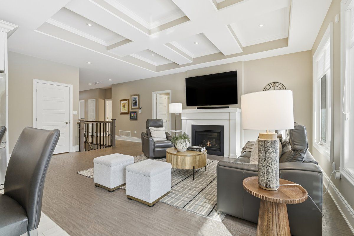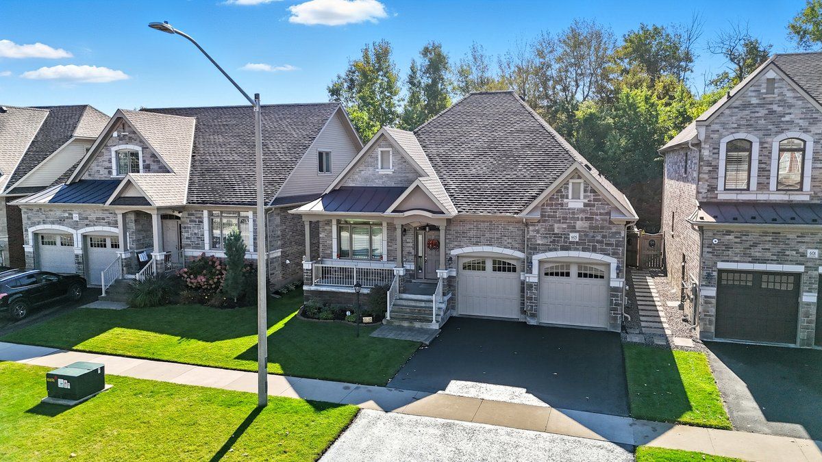 Holland homes custom luxury bungalow backing onto environmentally protected land. Wrapped in tumbled stone and brick with a dramatic high-pitched roofline, this rare offering delivers privacy, permanence, and peace. Over 90 builder upgrades in this charnwood 50 model elevate every detail. You must see the pictures! Open-concept main level is finished in engineered hardwood, oversized baseboards, anchored by a great room with 9 foot coffered "waffle" ceilings, and a chef's kitchen with a statement island overlooking the fireplace. A sun-filled breakfast area walks out to a covered deck and fenced yard... No rear neighbours, no future development, just birds, trees, and sky. The primary retreat features a spa-inspired ensuite with heated floors, freestanding soaking tub and separate glass shower. A second bedroom enjoys its own private ensuite, ideal for guests or home office flexibility. Main-floor laundry allows true one-level living the finished lower level adds a half-bathroom and an oversized media lounge perfect for movie nights, games, or visiting family. The unfinished area offers storage and opportunity to add your own custom rooms quietly positioned on the east end of george reynolds drive, this low-traffic setting offers a country feel while being surrounded by green space. This is downsizing and upgrading at the same time!