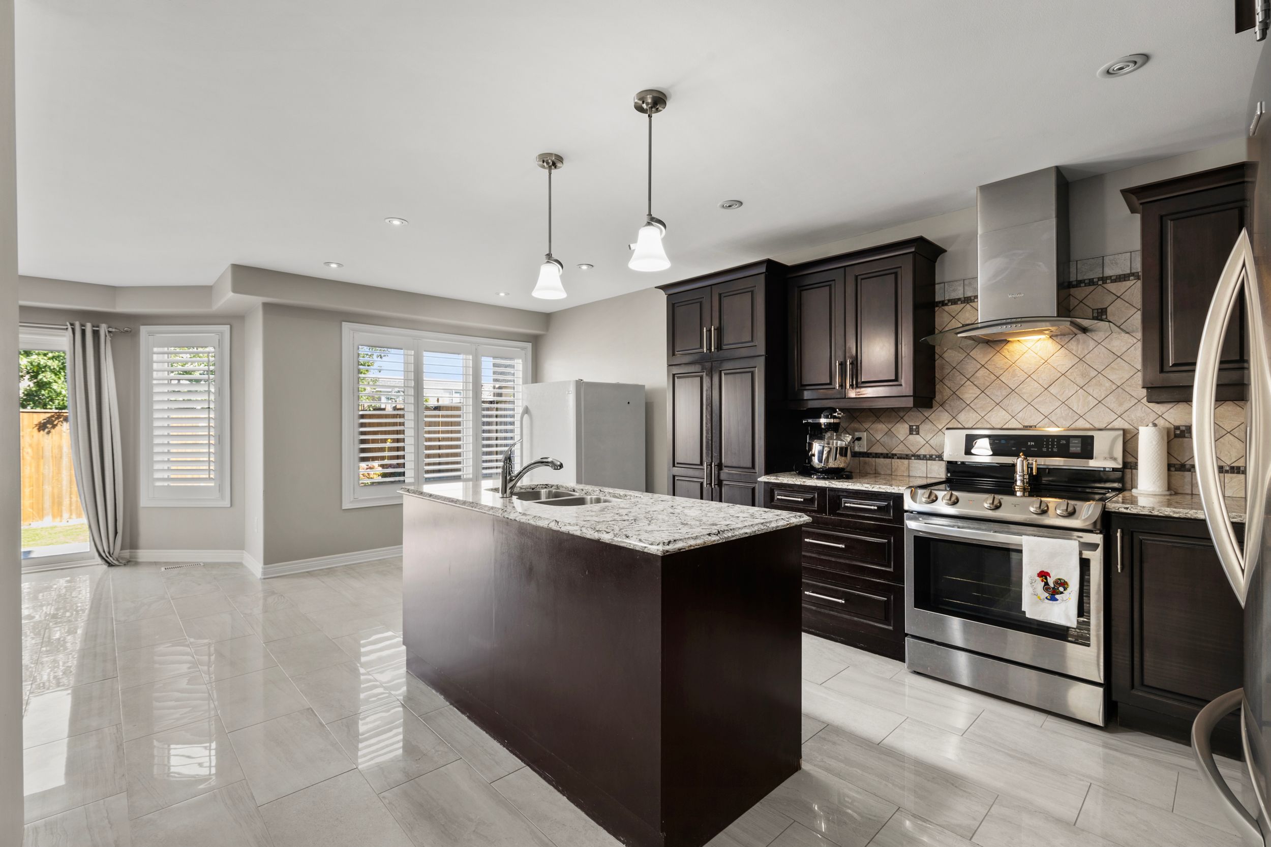 • Kitchen features stainless steel appliances and a large granite island.